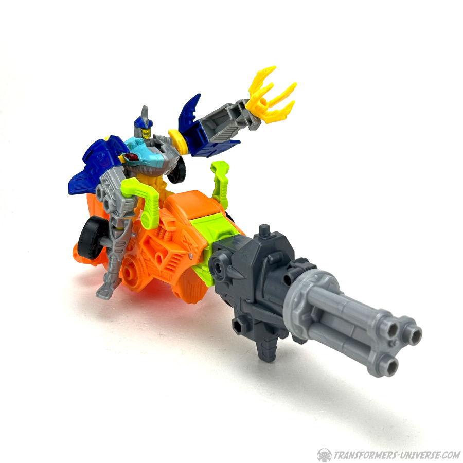 Much like Scorponok, though, Grimlock’s main attraction is less as a stand-alone figure (though he is a fun one), and more as an interactive toy together with other Cyberworld figures. First off, you can take off both of Grimlock’s arms, the T-Rex head and the cannon, and recombine them into a sort of Dino Bike (see pictures 7 through 9). A smaller Cyberworld figure can sit here, firing the cannon. You can also combine either the head or the cannon with Scorponok’s tail bike into yet more configurations. Have I mentioned I love Scorponok’s tail bike?
