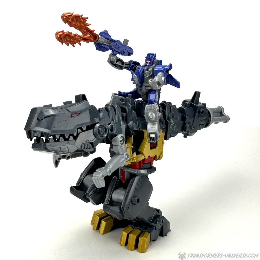 If you manage to ignore that, though, you have a pretty fun T-Rex that can do some running poses, open his mouth (doesn’t stay open, though), lower and twist his head, and even has some movement in his tiny T-Rex arms. The mouth can be opened far enough to chomp on a normal-sized Cyberworld figure and you can pull out something like a back rest on top, so other Cyberworld figures can sit on Grimlock. There is a peg that slots into the 5mm hole most Cyberworld figures have on their back, so the rider is firm in the saddle, so to speak. It’s height-adjustable, so pretty much every Cyberworld figure can easily sit here. Other figures can ride on top, too, of course. See picture 18, for example.