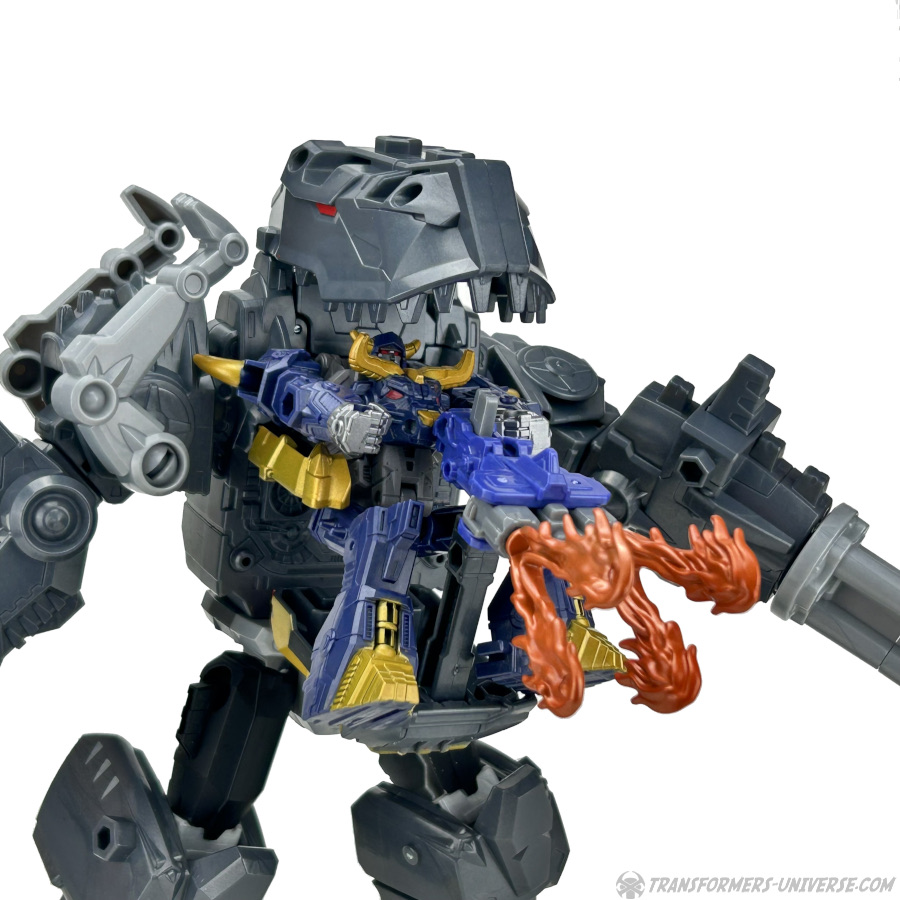 Finally, Grimlock can also become a sort of mech-suit for a smaller Cyberverse figure. His chest flips open, forming a cockpit of sorts with a raised central yoke or joystick and two “armrests” flipping out, too. The upper part of the T-Rex head detaches and is pegged into the shoulders, thus becoming the “roof” of the cockpit. Now you simply place a Cyberworld figure into the seat and, if you want, you can also peg in an additional weapon in the central yoke (see picture 21). It’s pretty simple, yes, but so much fun.