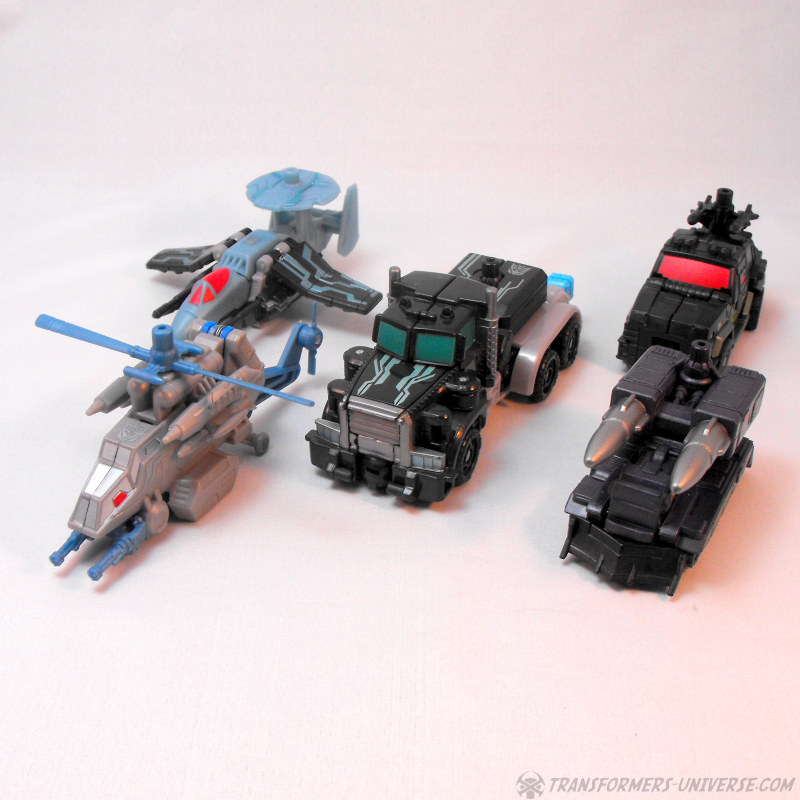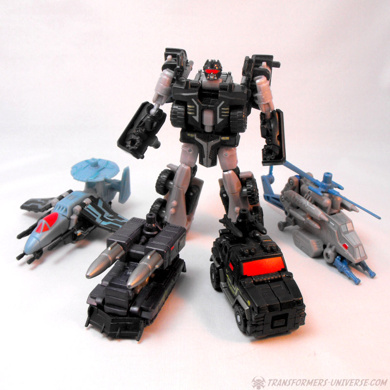 Drone Vehicles: Crankcase comes with four drone vehicles to serve as limbs for his combiner mode. They are a blue-grey AWACs Jet, a black missile truck, a black SUV, and a grey helicopter. Given the choice of vehicles, this is actually more of a Combaticons homage than a Stunticon one, which would fit with Crankcase being more of a Scourge / Black Convoy homage than a Motormaster one, too. Anyway, the four vehicles look good given their size, being among the better drone vehicles from the Power Core line.