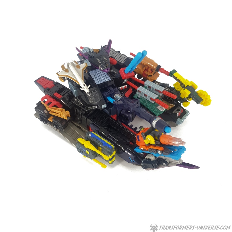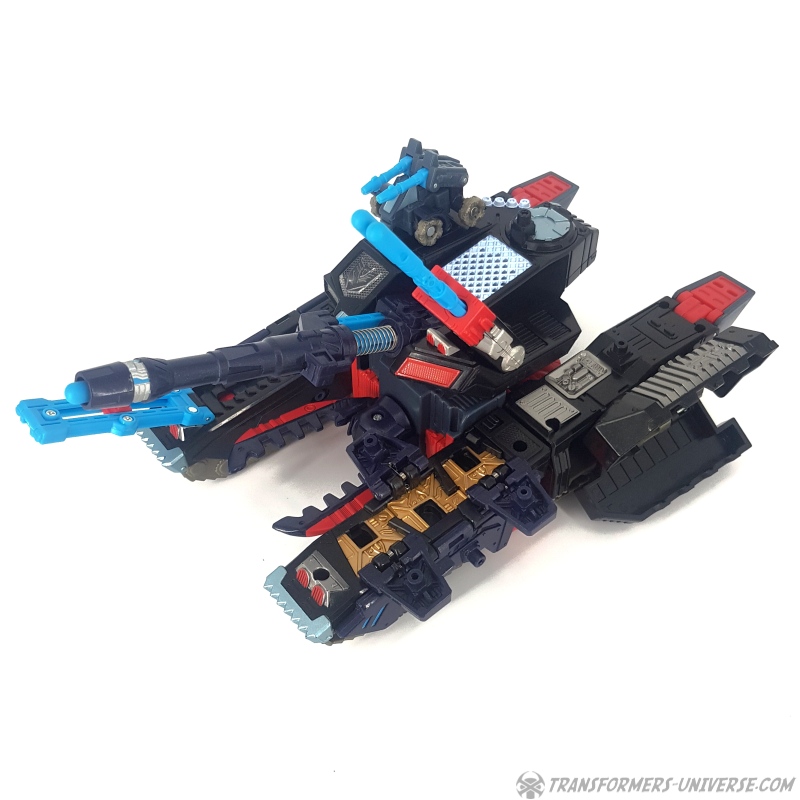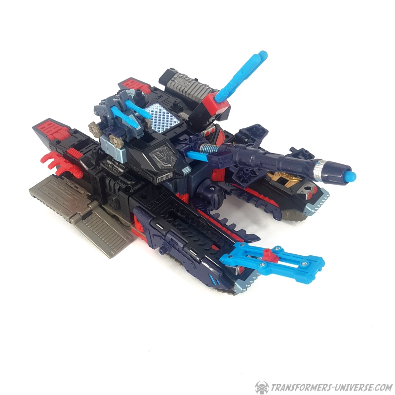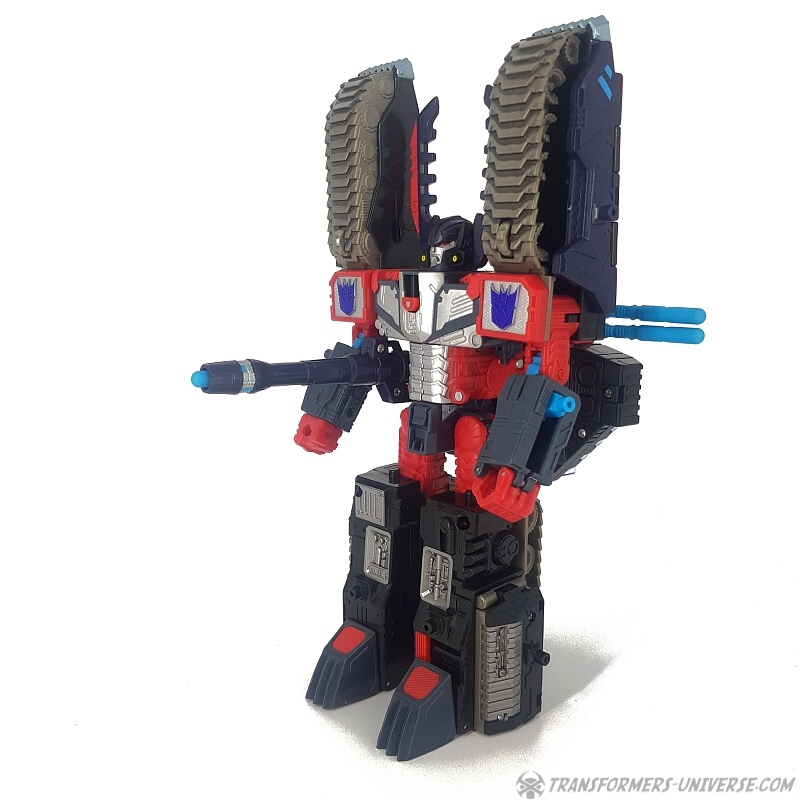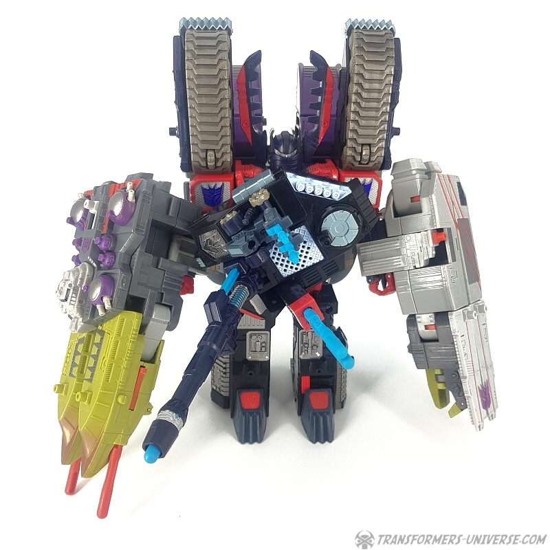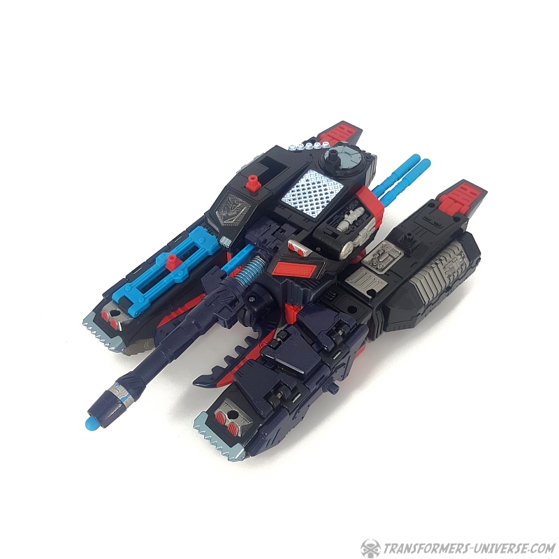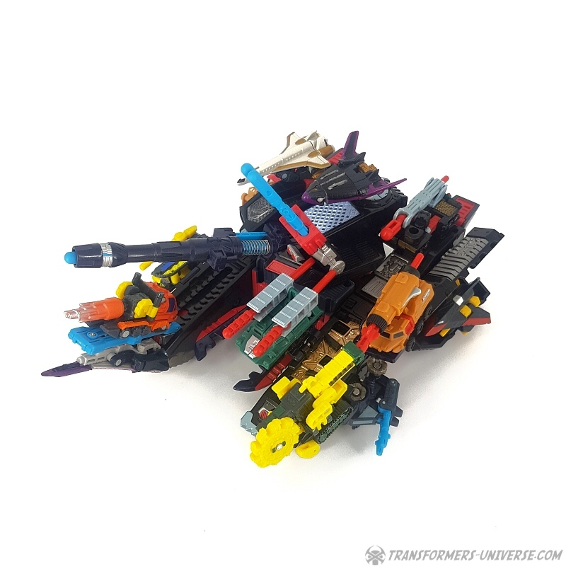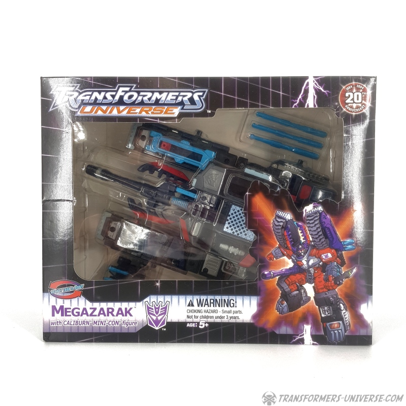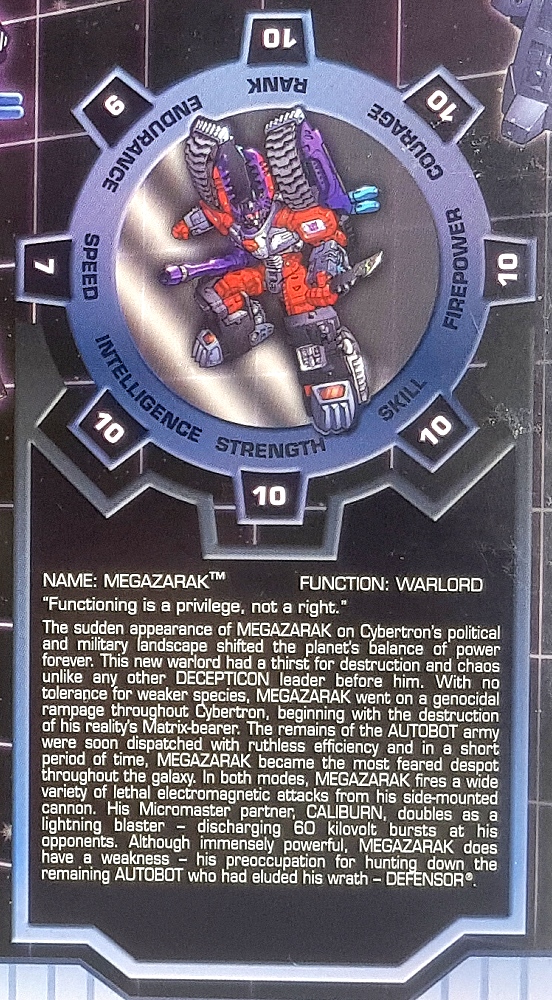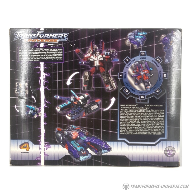 The sudden appearence of Megazarak on Cybertron´s political and military landscape shifted the planet´s balance of power forever. This new warlord had a thirst for destruction and chaos unlike any other Decepticon leader before him. With no tolerance for weaker species, Megazarak went on a genocidal rampage throughout Cybertron, beginning with the Destruction of his reality´s Matrix-bearer. The remains of the Autobot army were soon dispatched with ruthless efficiency and in a short period of time, Megazarak became the most feared despot throughout the galaxy. In both modes, Megazarak fires a wide variety of lethal electromagnetic attacks from his side-mounted cannon. His Micromaster partner, Caliburn, doubles as a lightning blaster - discharging 60 kilovolt bursts at his opponents, Although immensely powerful, Megazarak does have a weakness - his preoccupation for hunting down the remaining Autobot who had eluded his wrath - Defensor.