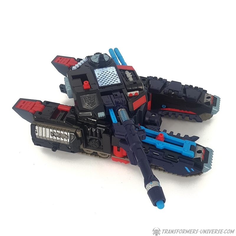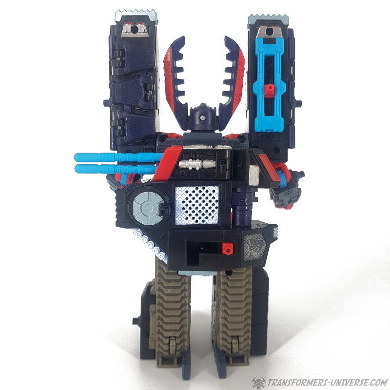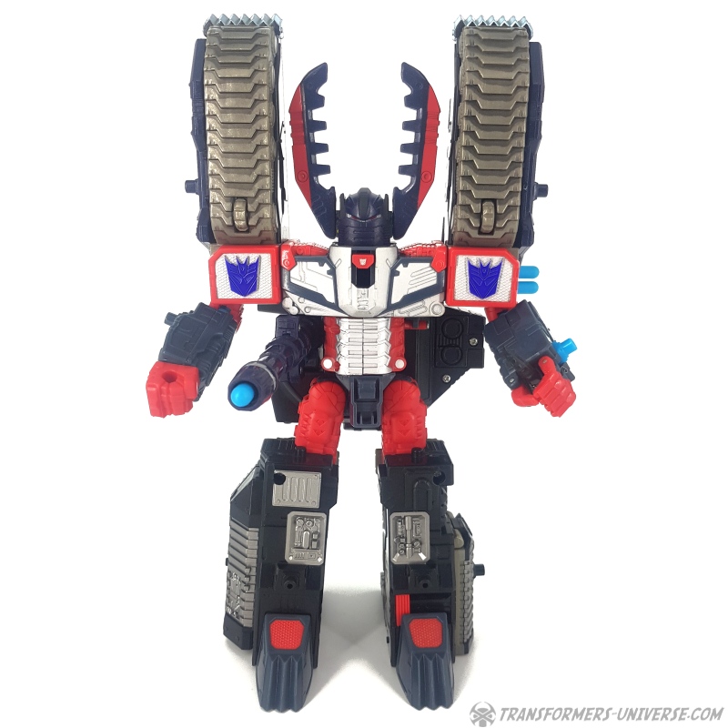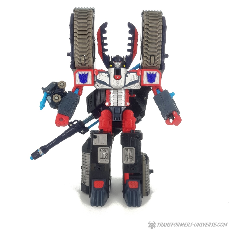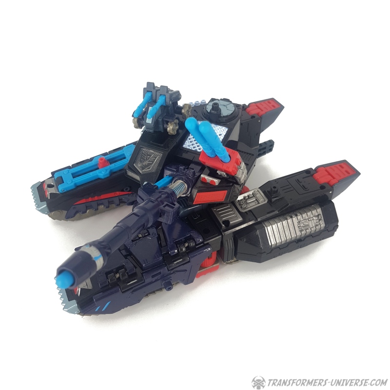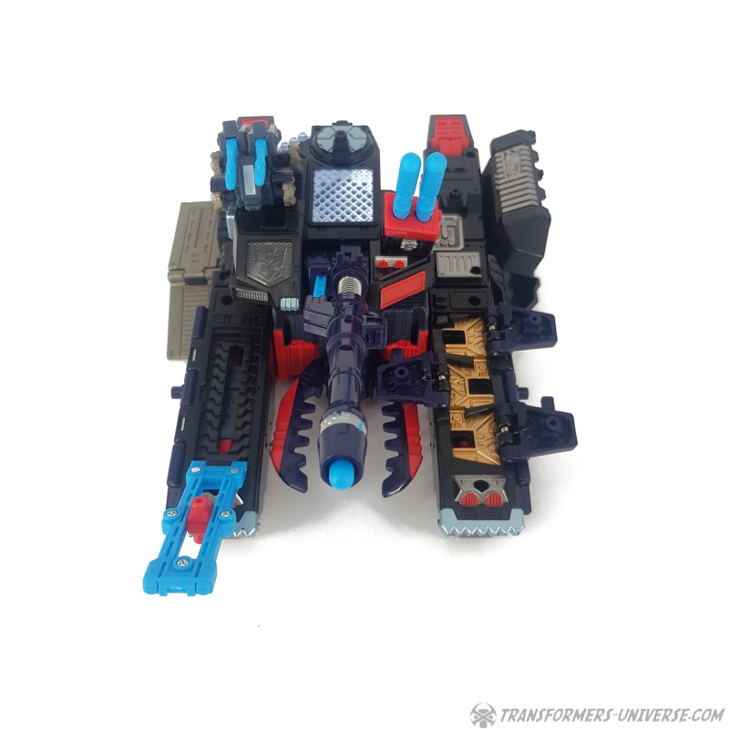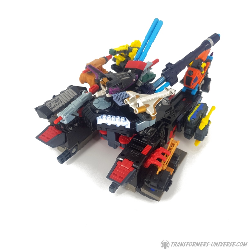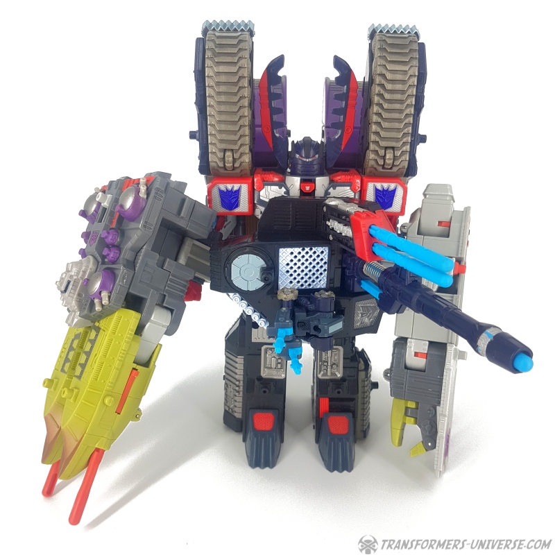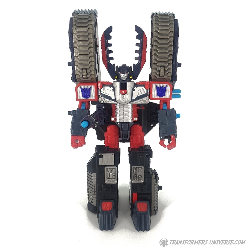 The sudden appearence of Megazarak on Cybertron´s political and military landscape shifted the planet´s balance of power forever. This new warlord had a thirst for destruction and chaos unlike any other Decepticon leader before him. With no tolerance for weaker species, Megazarak went on a genocidal rampage throughout Cybertron, beginning with the Destruction of his reality´s Matrix-bearer. The remains of the Autobot army were soon dispatched with ruthless efficiency and in a short period of time, Megazarak became the most feared despot throughout the galaxy. In both modes, Megazarak fires a wide variety of lethal electromagnetic attacks from his side-mounted cannon. His Micromaster partner, Caliburn, doubles as a lightning blaster - discharging 60 kilovolt bursts at his opponents, Although immensely powerful, Megazarak does have a weakness - his preoccupation for hunting down the remaining Autobot who had eluded his wrath - Defensor.