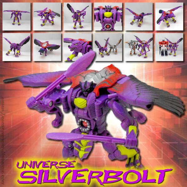 Hailed as a Maximal hero by the general populace for his role in the liberation of Cybertron from the Megatron's rule, Silverbolt had finally been able to recover from the nightmare of the constant battle, and begin an idylllic life with his love, Blackarachnia. However, once Unicron, the ancient monster planet resurfaced to threaten the cosmos, this new dawn of peace and prosperity for the reborn Cybertron had abruptly been cut short as the planet's populace must again prepare for battle against the ultimate evil. Silverbolt exemplifies the finest qualities that one might expect from Primus' defenders: He is an honorable and brave fighter, righteous in his cause, and noble in his bearing. In his newly reformatted Fuzor body, Silverbolt has reverted to the powerful form he started out with in the beast wars. In beast mode Silverbolt possesses keen olfactory sensors enabling him to track his prey like a bloodhound. In both modes Silverbolt boasts both superior speed and agility. In robot mode his main weapons are bio-mechanically created feather darts that can be fashioned into swords or launched as explosive missiles. In the battle against Unicron, Silverbolt's primary goal is to save and recover Blackarachnia from the Chaos Bringer's corrupting influence. However, his feelings for her are even stronger than his own sense of preservation, and can easily be exploited by his enemies.