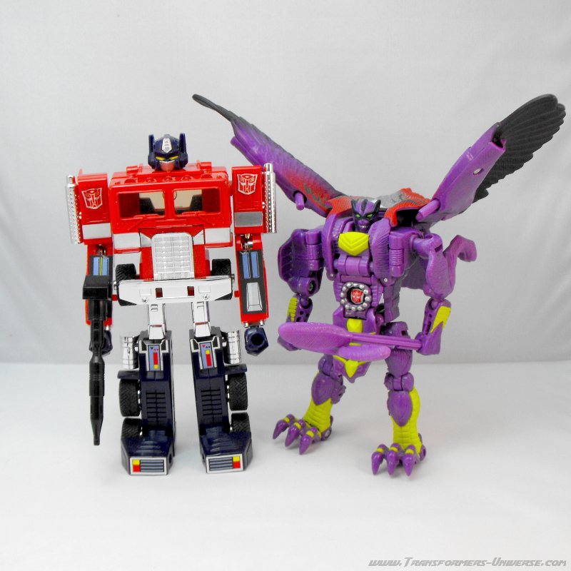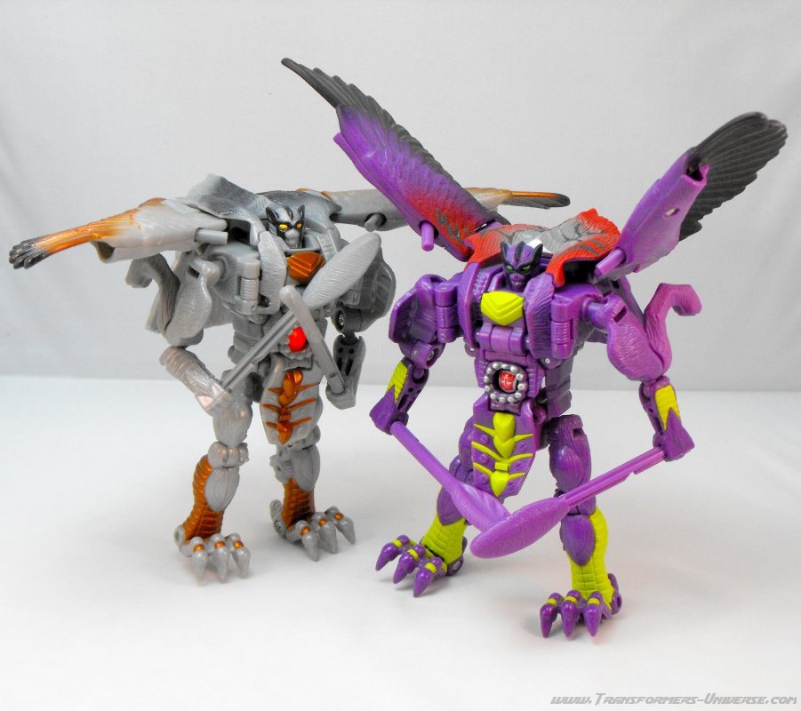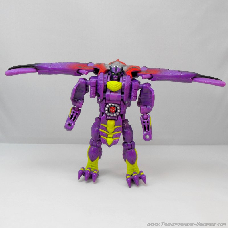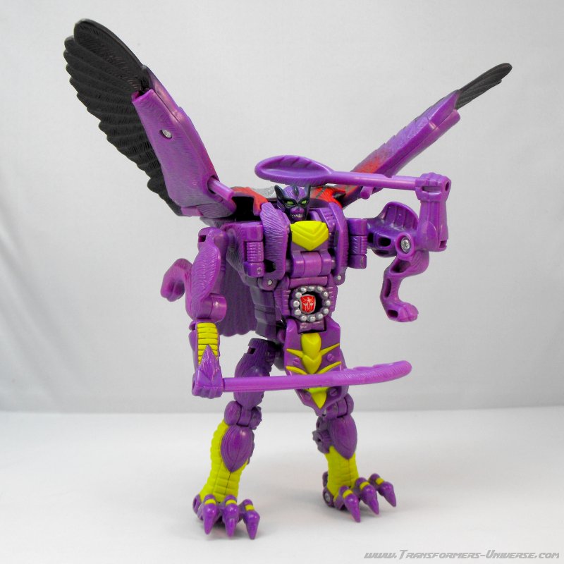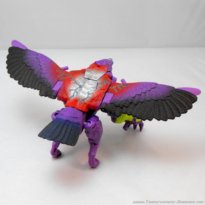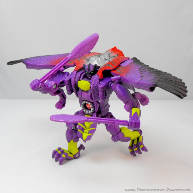 Apart from the pupil-searing colour, the figure is the same as it was in Beast Wars. Highly articulated, though somewhat restricted by the positioning of the shoulder wings. Nicely detailed, including the removable feather swords he uses as weapons. The only real downside this figure has design-wise is the fact that the shoulder wings restrict its movements somewhat. Apart from that, though, still an excellent robot mode. Just don’t look at it for too long.