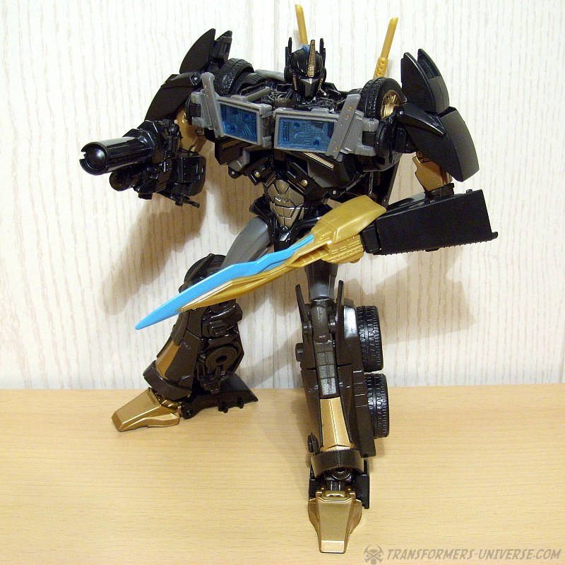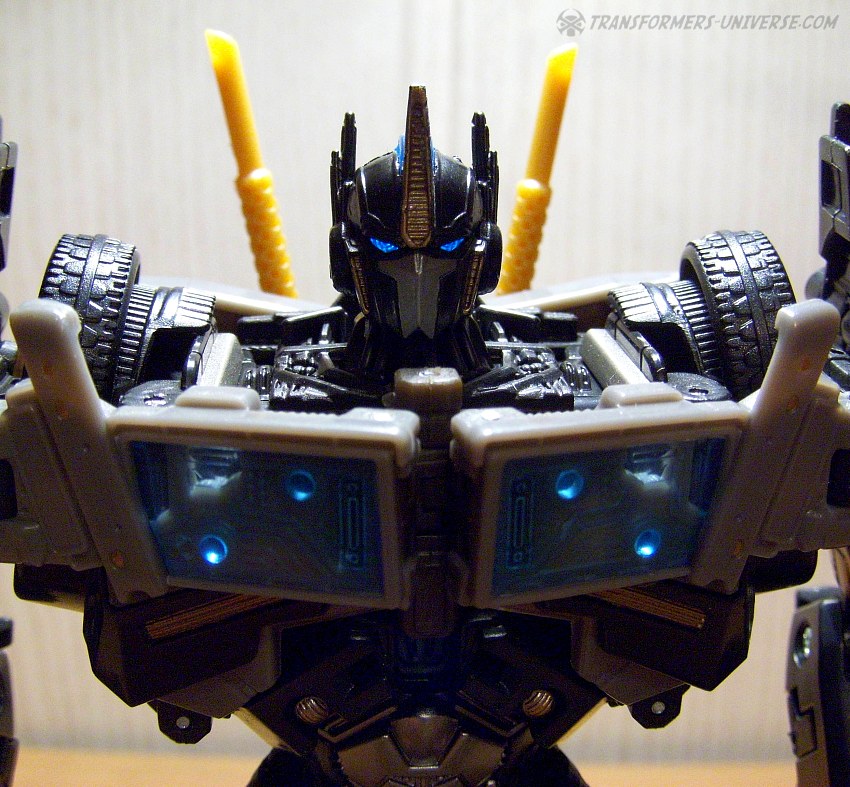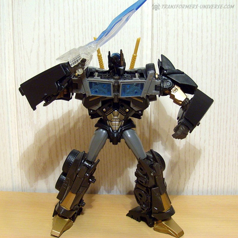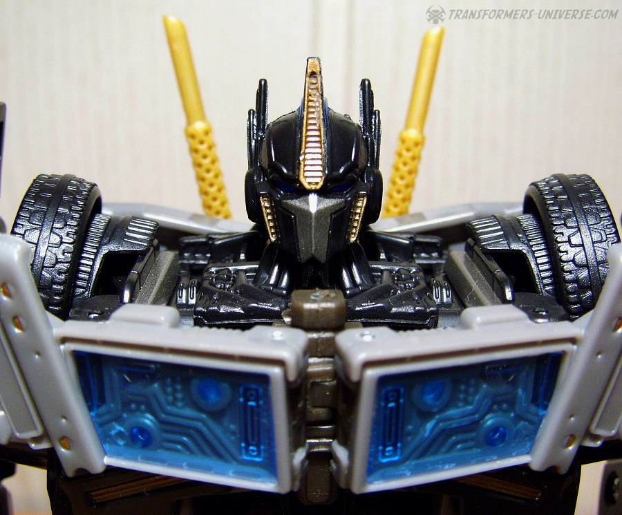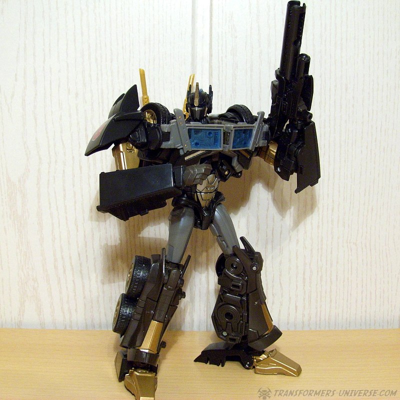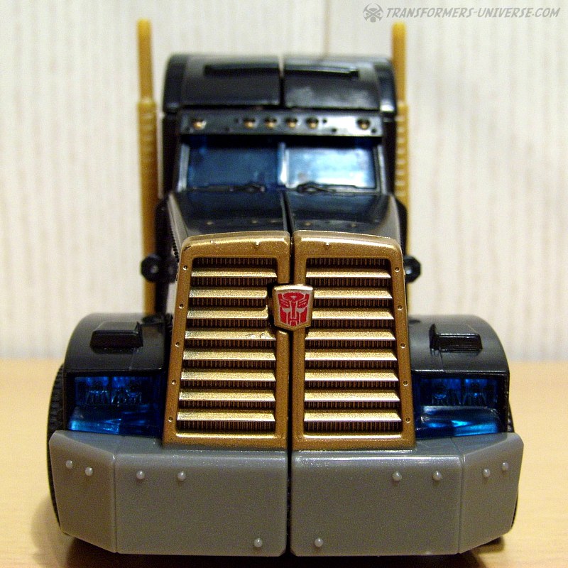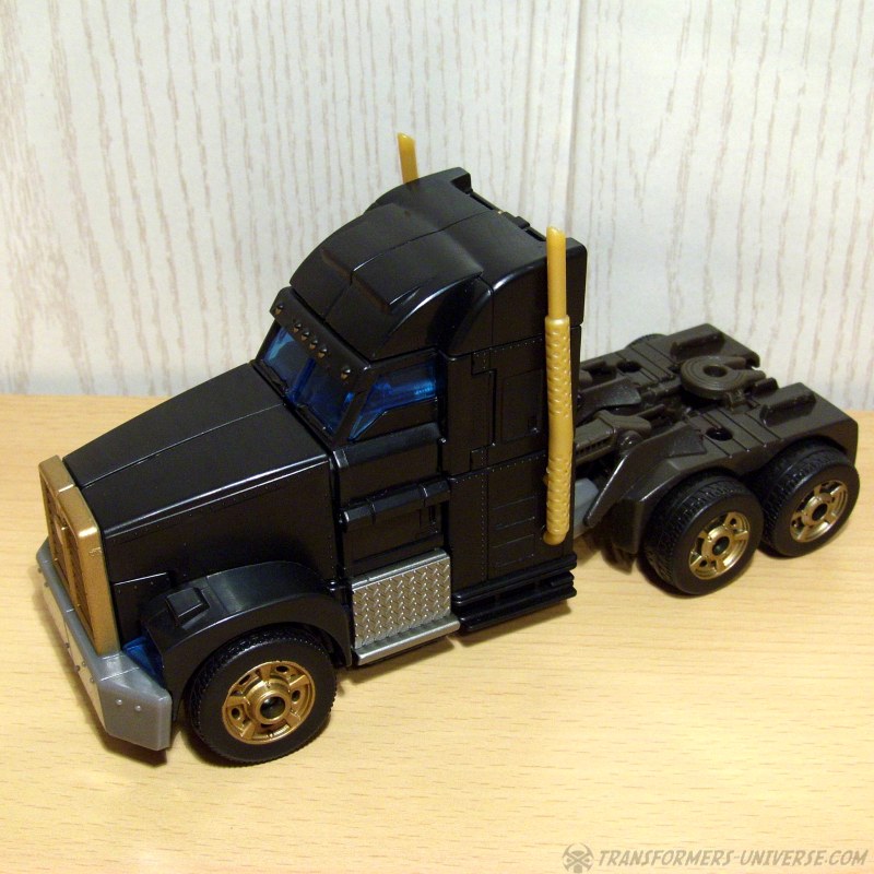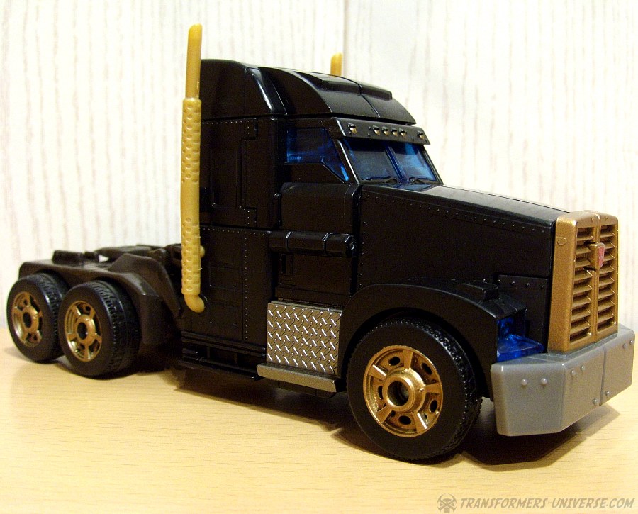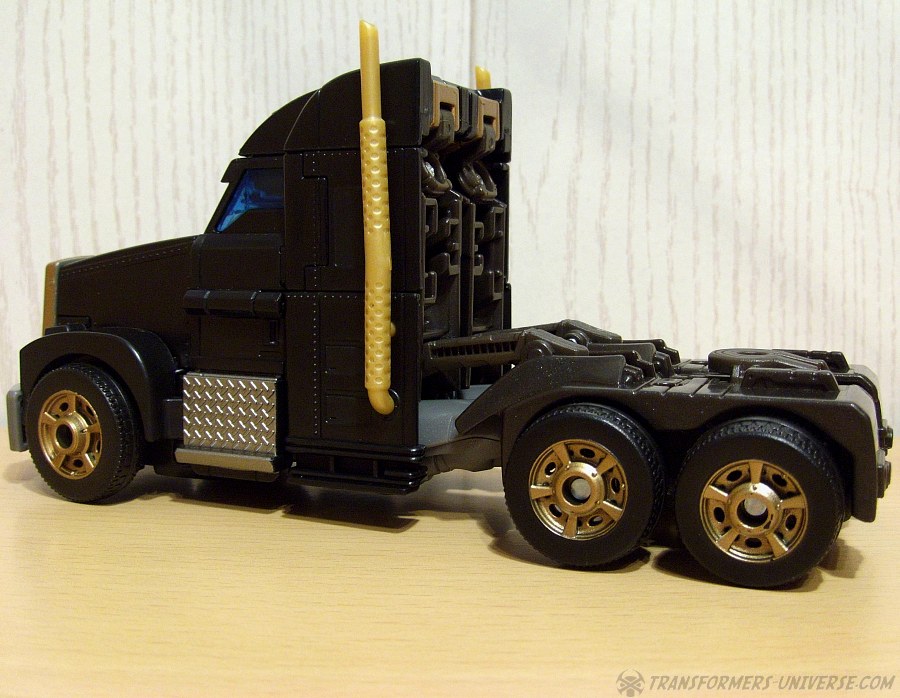Alternate Mode: Other than the black colors there are no differences to the truck itself. It’s still the nice looking vehicle it was before. But I must admit that the black together with those golden highlights and those clear blue windows is a nice change from what we usually get in a black Optimus Prime. Everything is painted nicely, from the bumper grill to the rims, all nicely done. The exhaust pipes are also gold, which looks good but makes them even softer and more floppy than before. Otherwise: looking great. The truck itself is nothing special but more than you will ever need when it comes to the on-screen image.