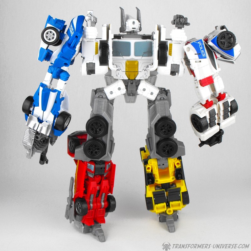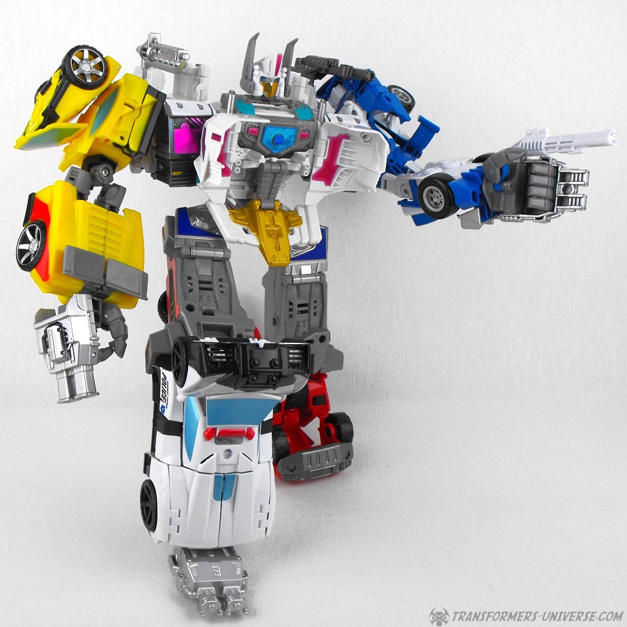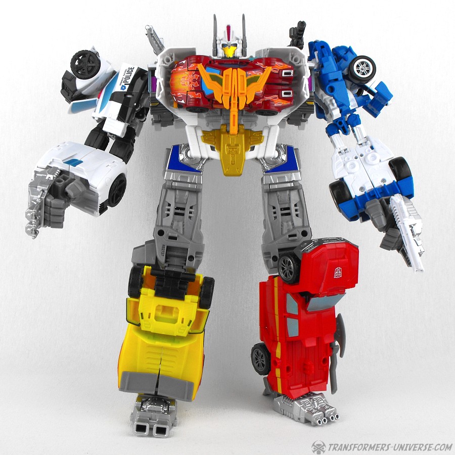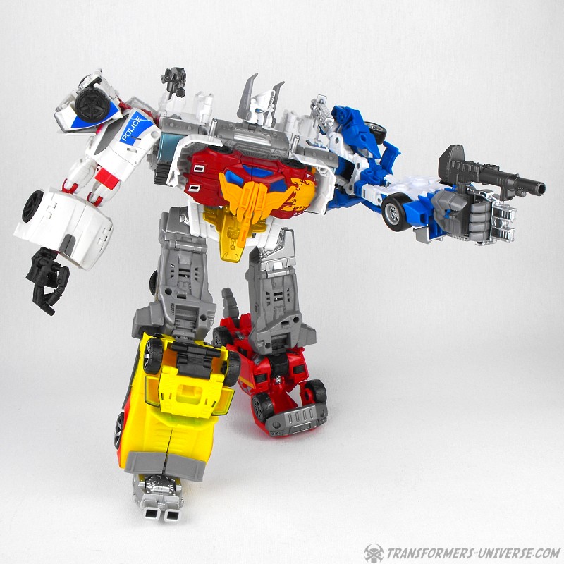 Combined Mode: Optimus Maximus uses Battle Core Optimus Prime as his torso and the four other robots as limbs. Being that all four of the limb-bots are cars, it doesn’t really make much of a difference in what order you use them, all of them work equally well as arms and legs. The resulting robot is big and wide, looking very nice. There are three different ways to configure the chest of the combiner. Leave it closed, open it up, and attach Rodimus to the opened chest. Each version looks a bit different and I can’t really say which of them I like best. What I do know, though, is that Rodimus doesn’t really attach all that well and threatens to fall off all the time.