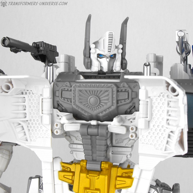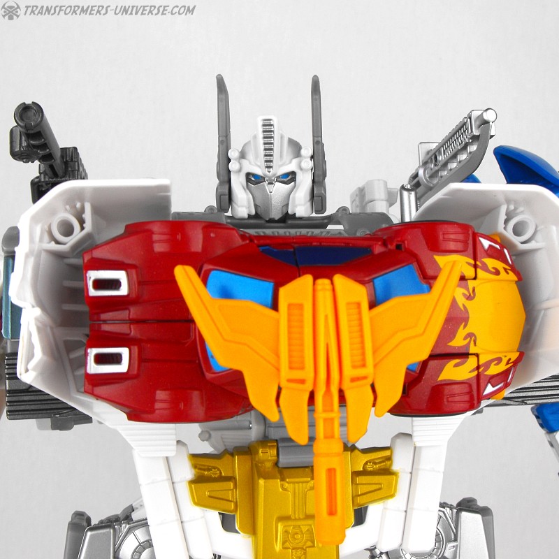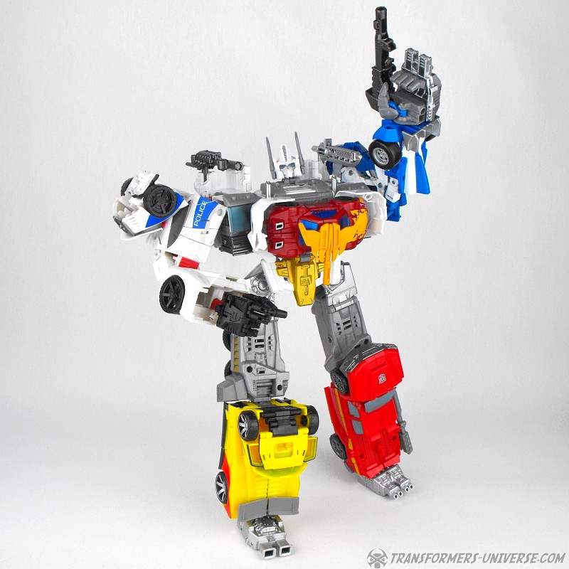 Optimus Maximus can use any of the individual weapons of his team members. The normal robot fists from Battle Core Prime sit behind his shoulders, giving you the option of attaching two guns as shoulder guns here (I love shoulder guns) and the rest can be wielded or attached all over his body. I’m still not a big fan of the tiny little combiner feet (Perfect Effect set is preordered), but the combiner fists work very well in my opinion. Bottom line: A beautiful and powerful-looking combiner. No flaws worth mentioning apart from the Rodimus thing.
