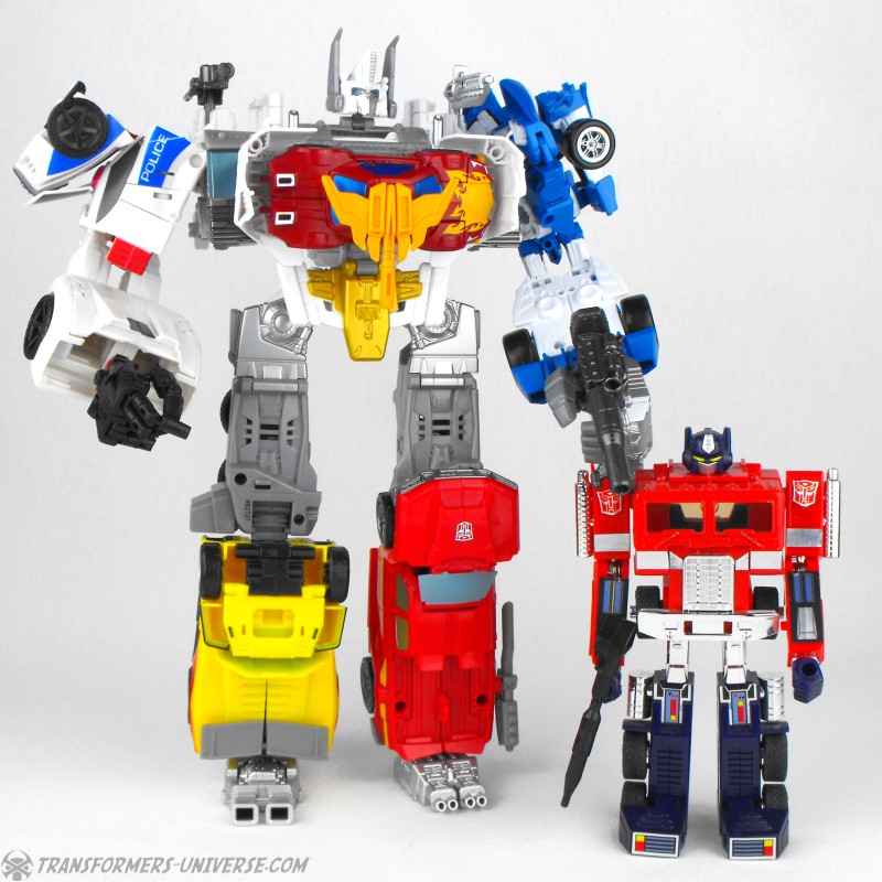 Prelude: Optimus Maximus is the combined form of Optimus Prime, Mirage, Sunstreaker, Prowl, Ironhide, and (optionally) Rodimus, all of whom I have already reviewed individually. Quick explanation for the odd assortment of pictures for this review. I got Battle Core Optimus first and originally didn’t intend to get the limbs. Then three of them turned up at a local store and I bought them anyway. Lacking Prowl, I substituted Streetwise at first, because I was gung-ho about applying the Thunderclash stickers to Prime. Then Prowl turned up and I redid some of the pics with the now Thunderclash-labeled Optimus (and extra-flamey Rodimus, too). Hope that explains it.