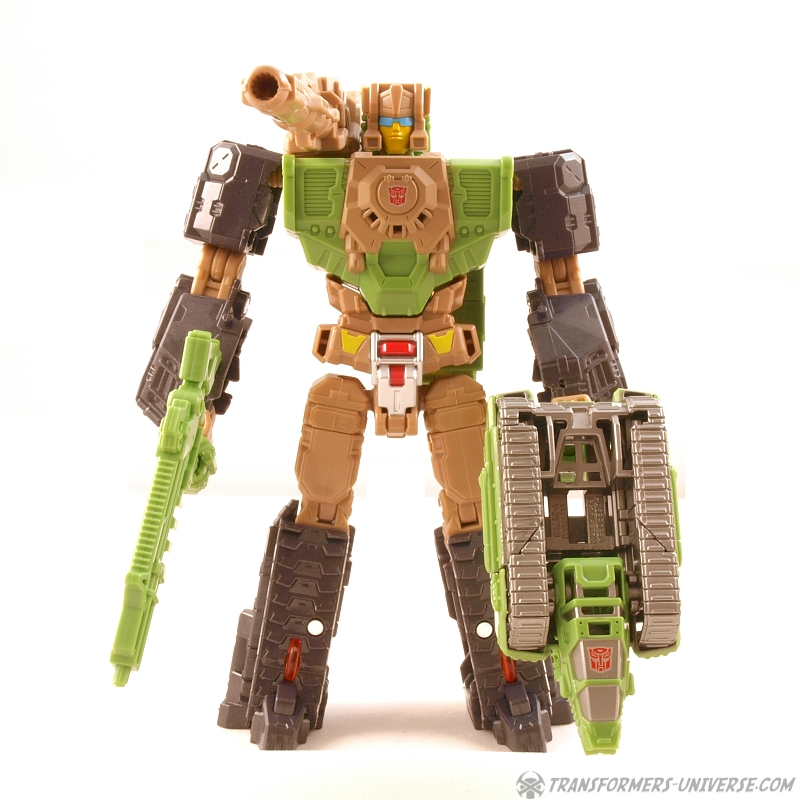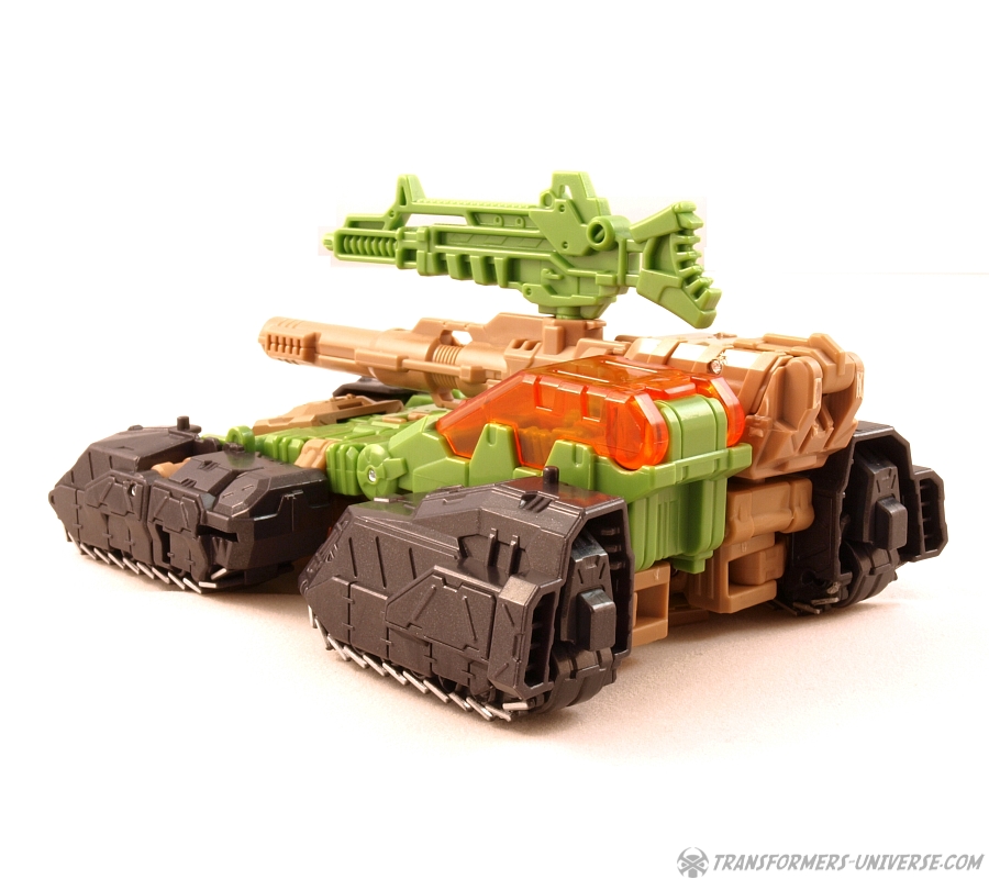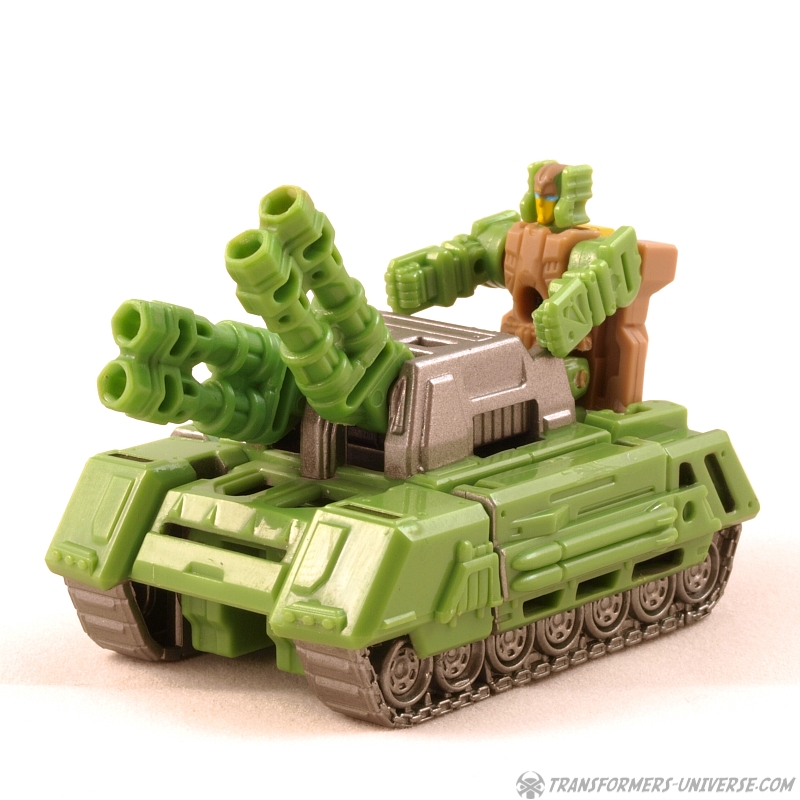Remarks: In 2016 and 2017, Hasbro's Titans Return line had its own counterpart series in Japan, called Legends. Usually the Legends figures received a somewhat more "premium" paint job, often more cartoon accurate, and didn't bother to give individual names to the Headmaster figures (and they did call them Headmasters instead of Titan Masters). Another example of this trend is Hardhead, who is mostly identical to his Titans Return counterpart (and uses the same mold as Titans Return Quake), but also carries the converting tank (called 'Tankette') that came with the Titans Return Terri-Bull, repainted to match Hardhead's colors.