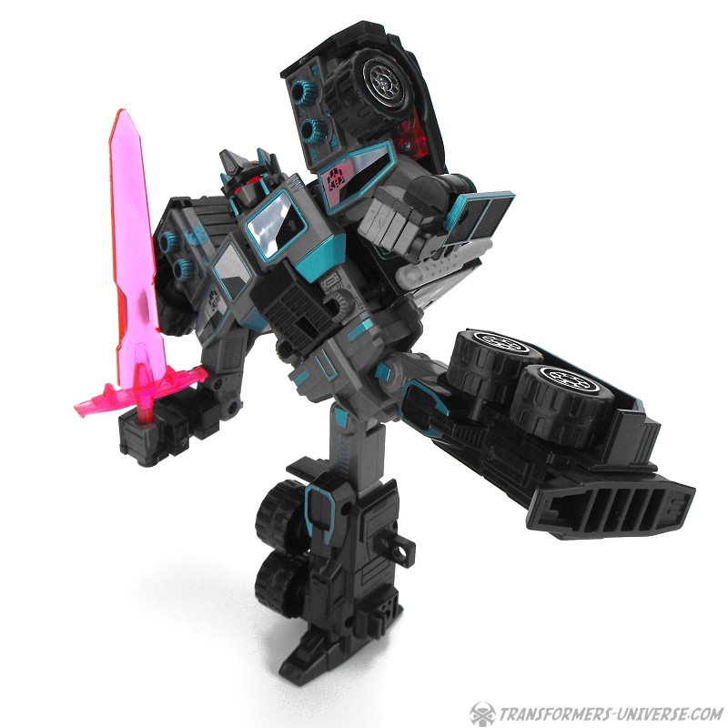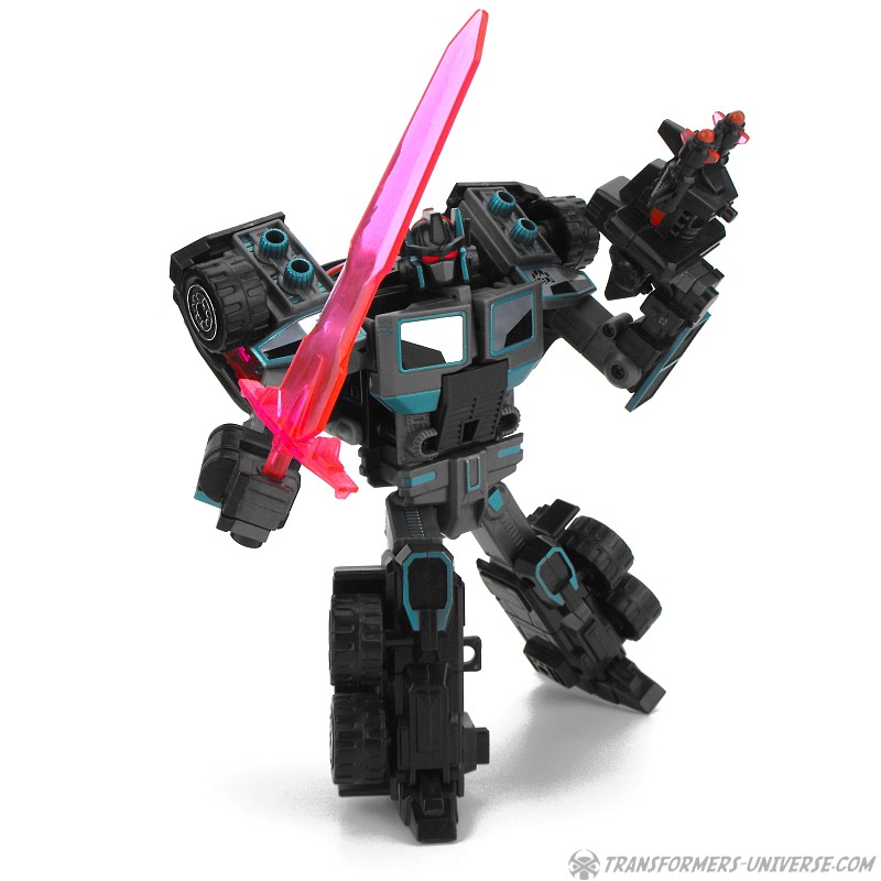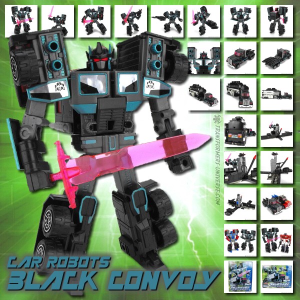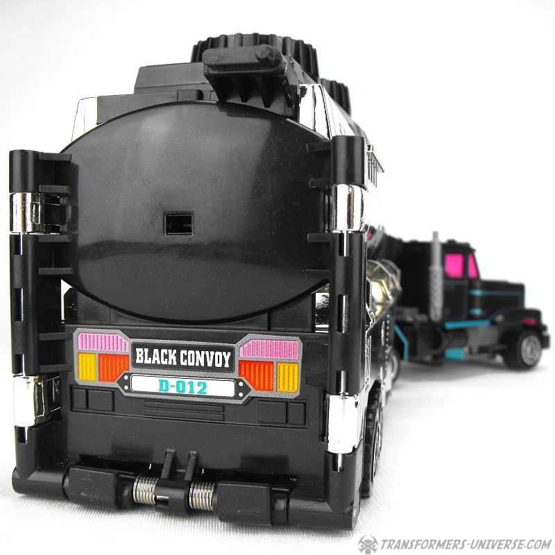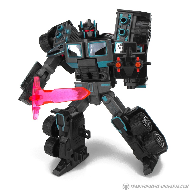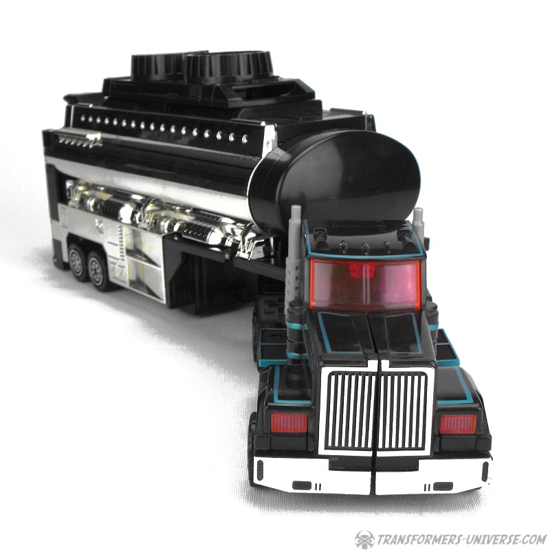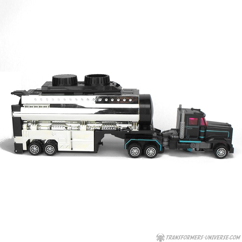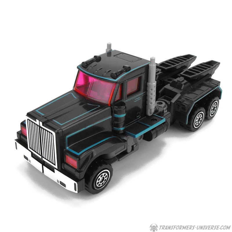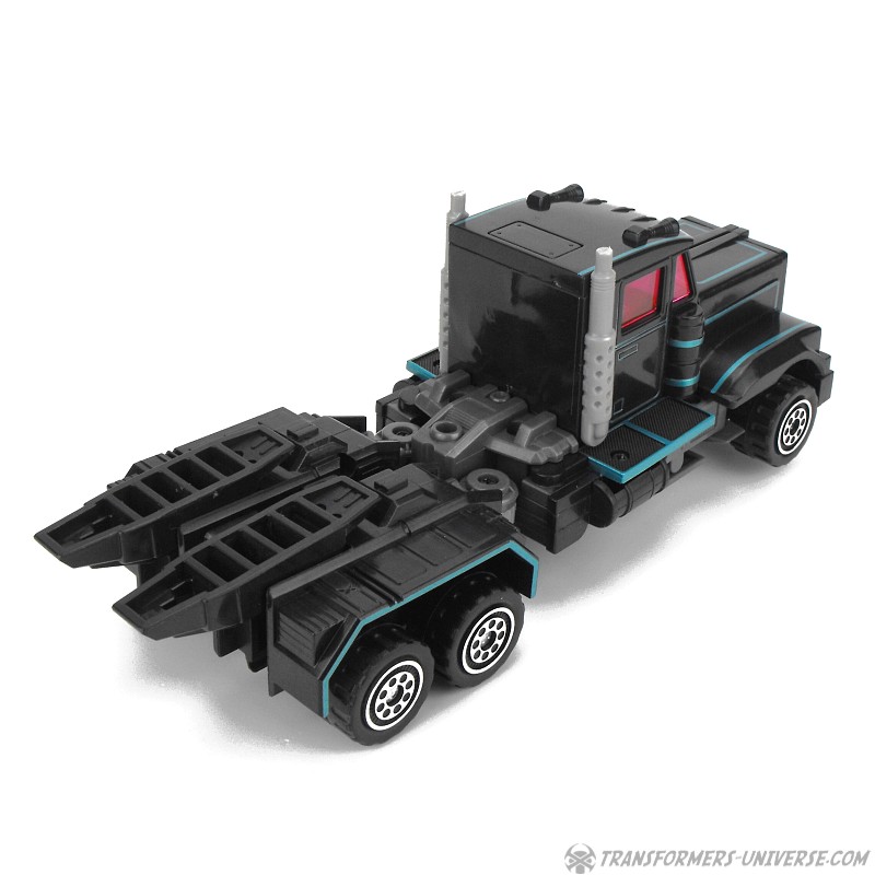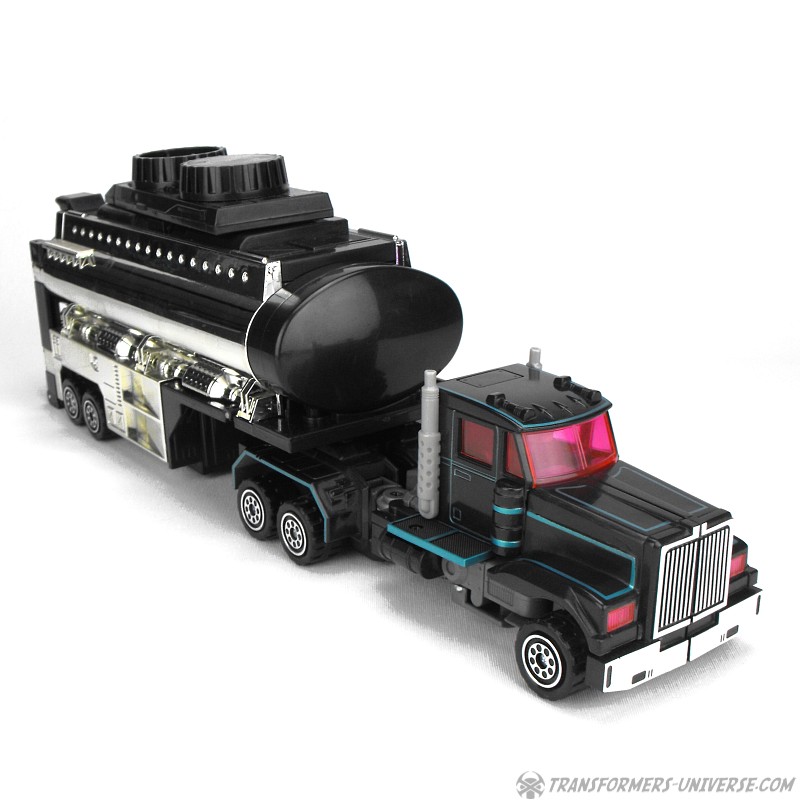 Black Convoy is a no-nonsense field commander. Formed during the creation of the Decepticons when Gigatron scanned both a tanker truck and Cybertron Commander Fire Convoy. Because of this mix-up, Black Convoy resents the Cybertrons and especially their leader. He's cunning, dangerous and cruel -- if there is any Cybertron goodness within his circuits, he covers it up as acts of destruction. His battle station is a fully loaded weapon and high-tech equipment arsenal. Furiously wields his signature sword in battle.