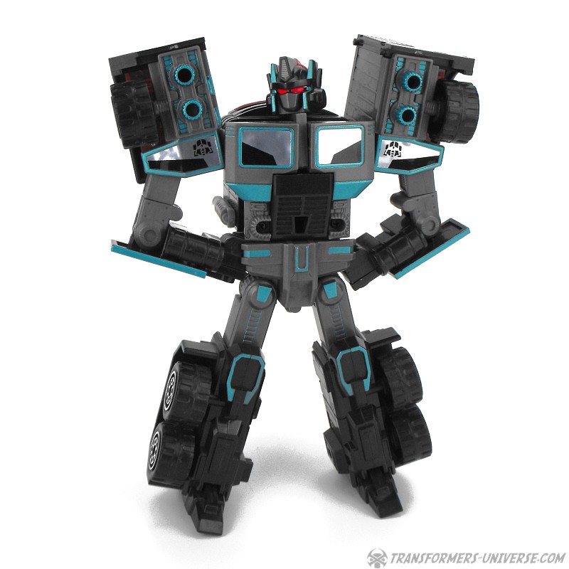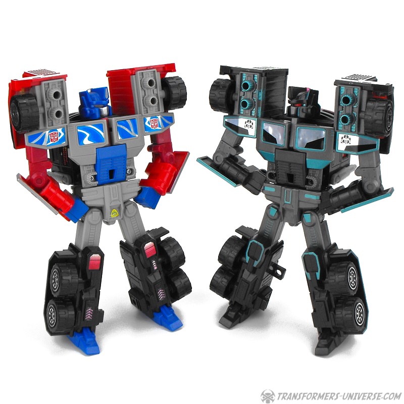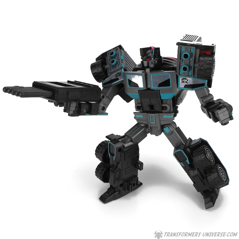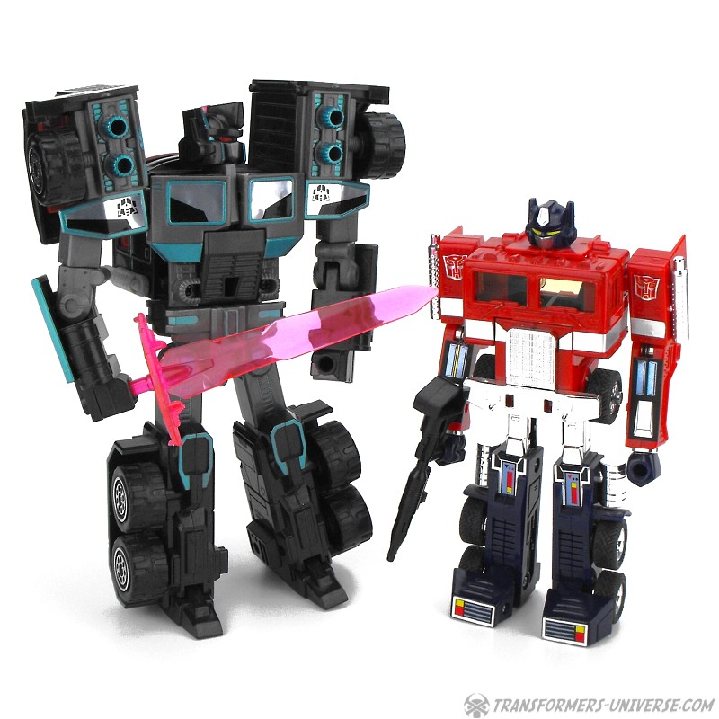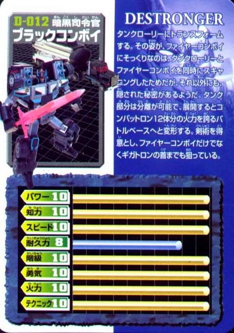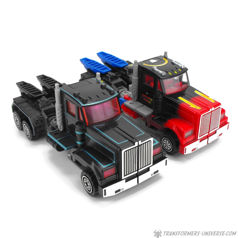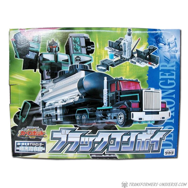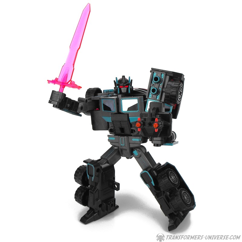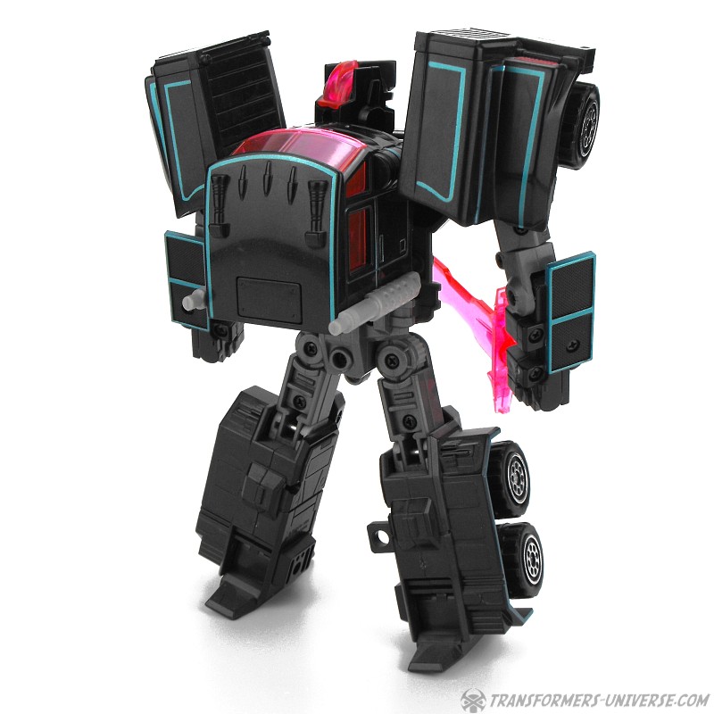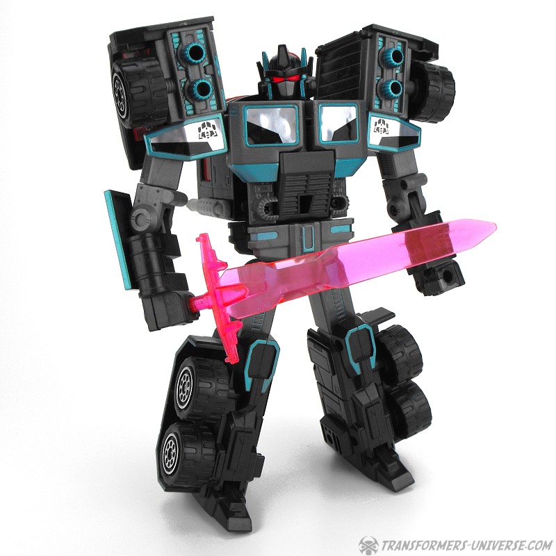 Black Convoy is a no-nonsense field commander. Formed during the creation of the Decepticons when Gigatron scanned both a tanker truck and Cybertron Commander Fire Convoy. Because of this mix-up, Black Convoy resents the Cybertrons and especially their leader. He's cunning, dangerous and cruel -- if there is any Cybertron goodness within his circuits, he covers it up as acts of destruction. His battle station is a fully loaded weapon and high-tech equipment arsenal. Furiously wields his signature sword in battle.