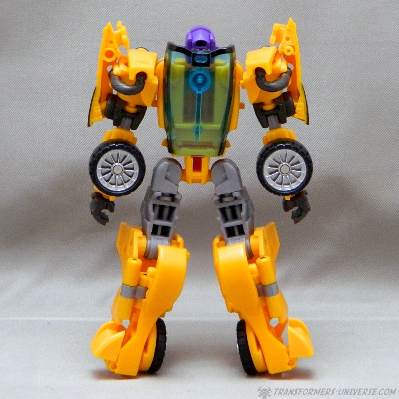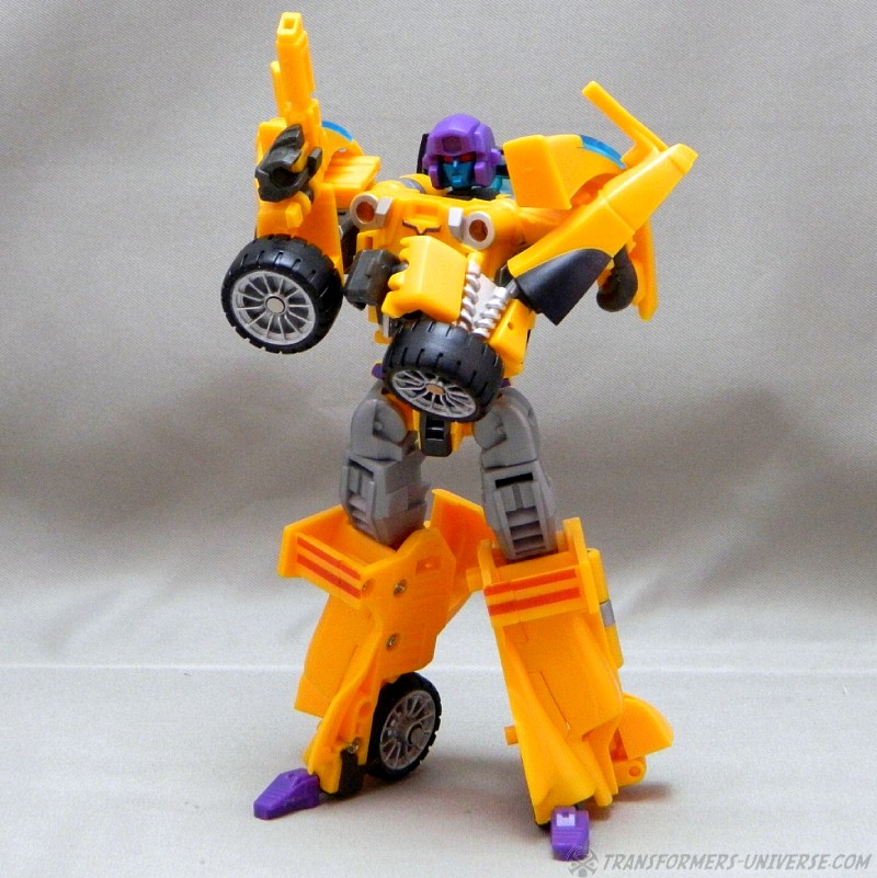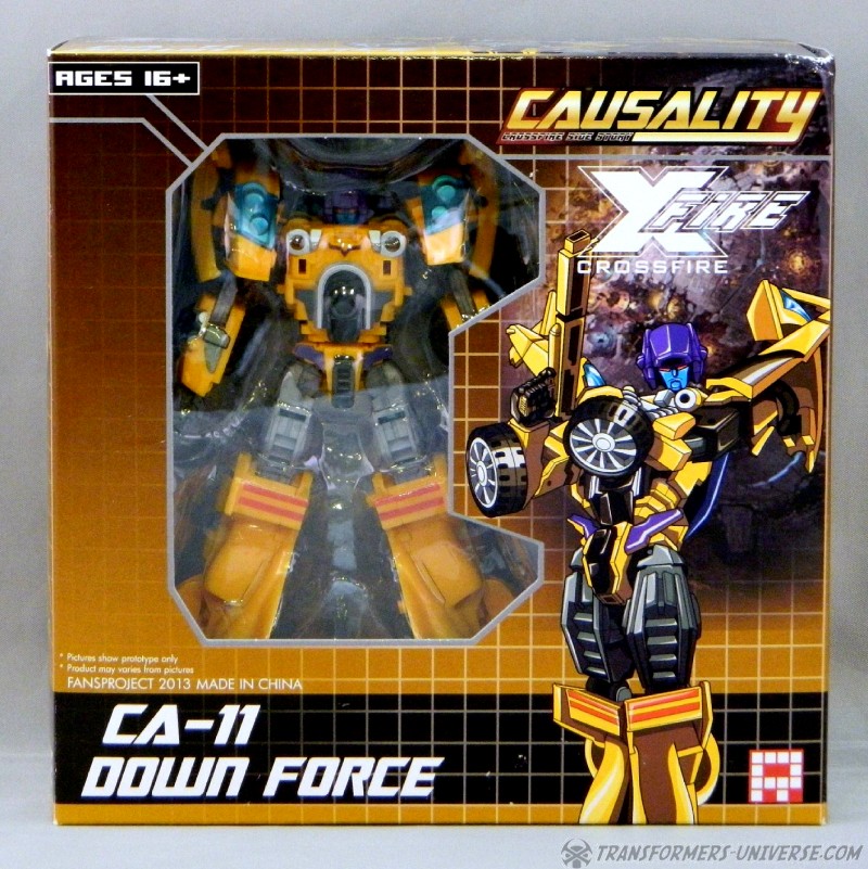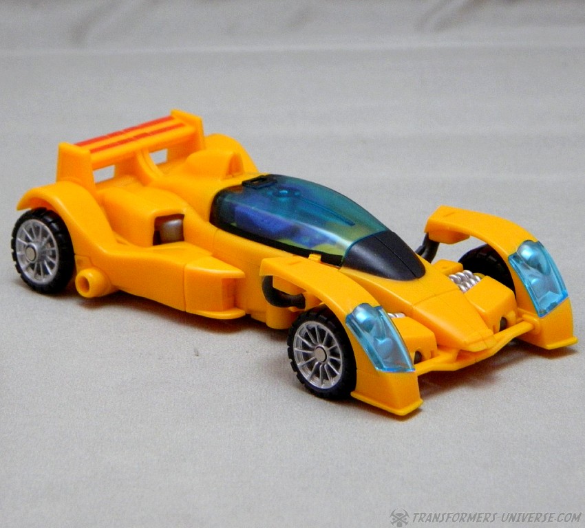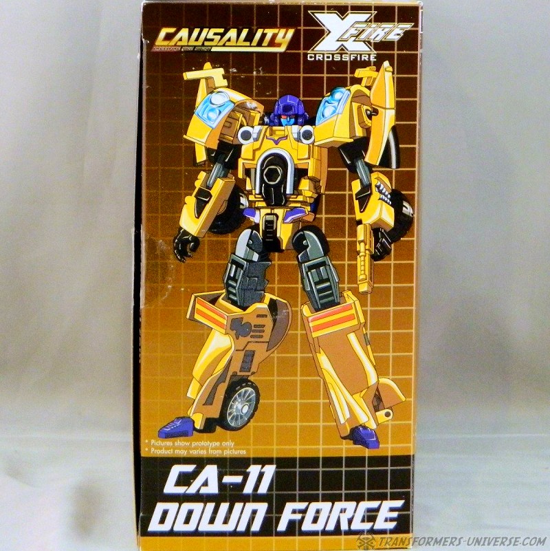 Remarks: The third figure in Fansproject third party version of the Stunticons is Down Force aka Drag Strip. Origin of the name: down force is the term of using wings and control surfaces on a car to press it down onto the street, making sure that it doesn't lose contact even at high speeds. Kind of fits with Dragstrip's F1 race car alternate mode. Down Force transforms from robot to car and becomes an arm (left or right) of the Intimidator (aka Menasor) combiner.