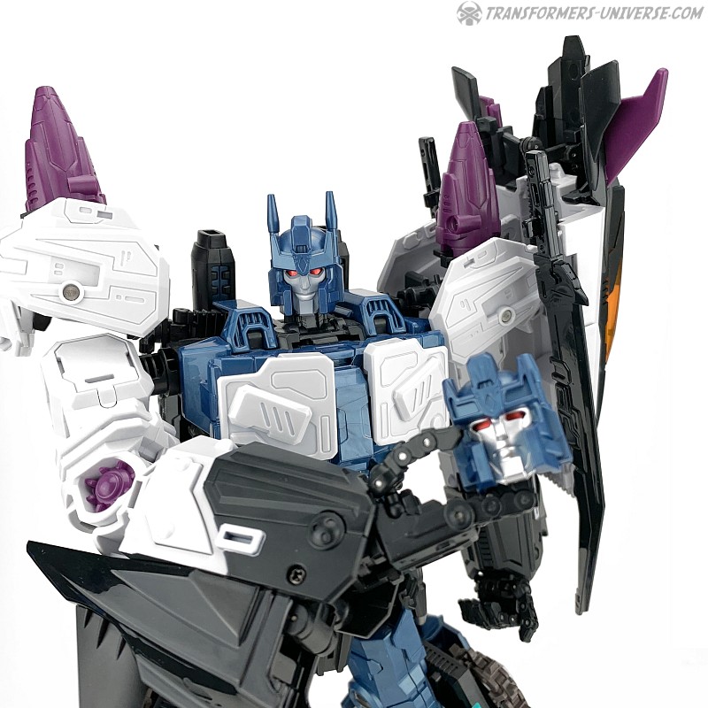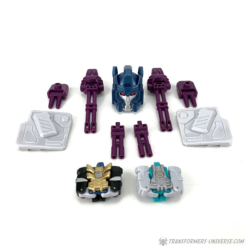 Additional Parts: Apart from the two figures, the upgrade set comes with several more parts for Carnifex. There are white panels that snap onto his chest doors, to make them look more like the G1 figure’s. There are six double-barreled guns for use in Carnifex’ base mode, and finally there is a new head for Carnifex, looking more like his G1 noggin.