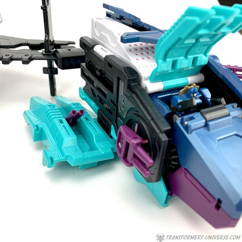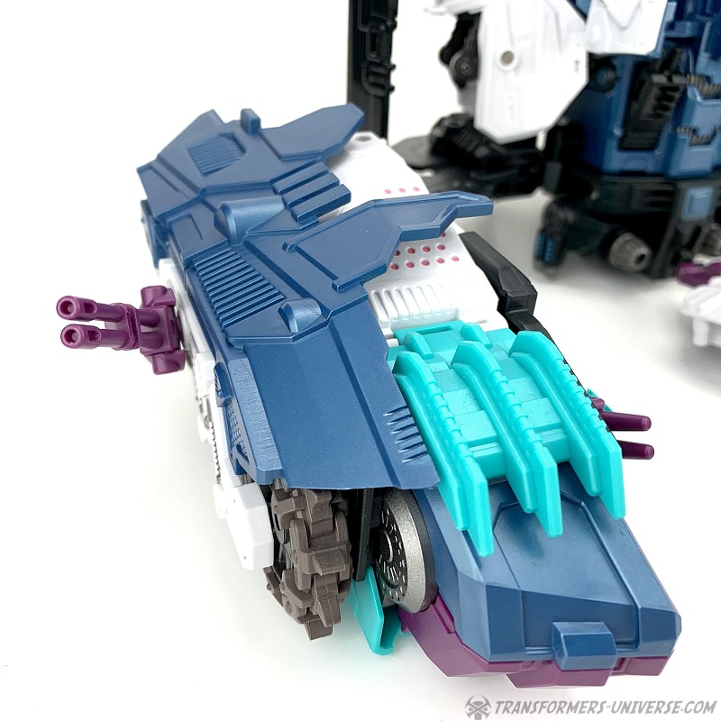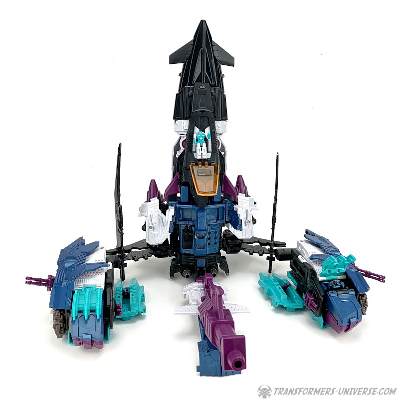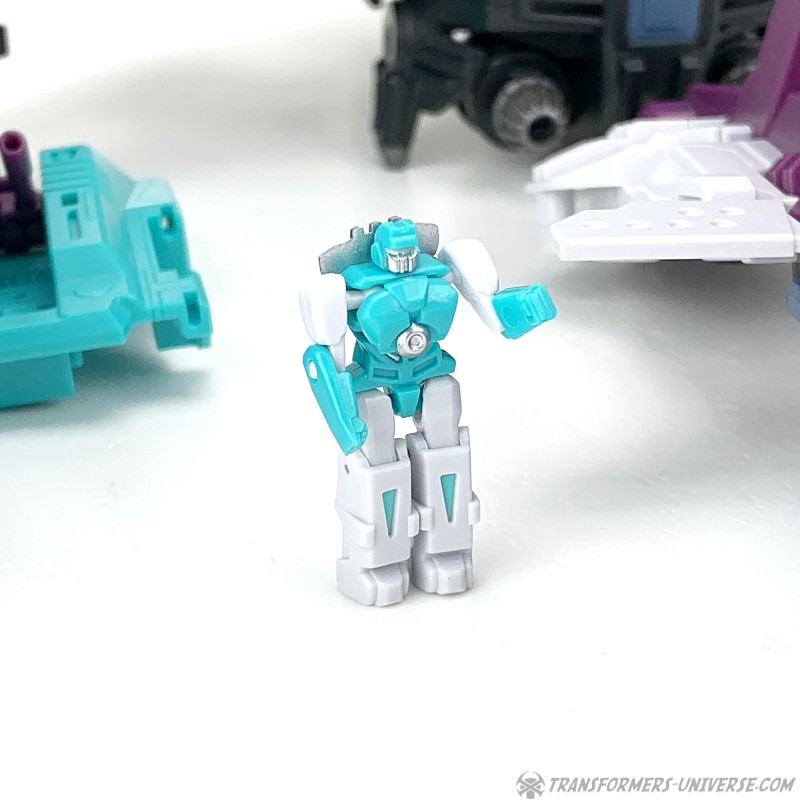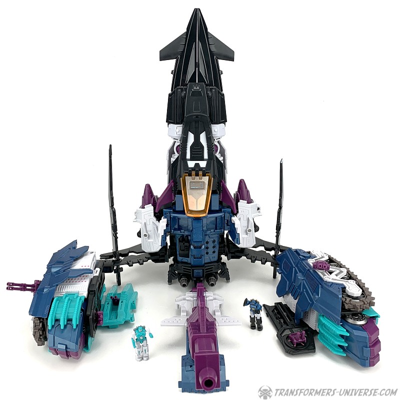 Godmasters: The main portion of this upgrade set are the two Godmasters / Powermasters / Energon figures Millifex and Billifex. The names are a play on the names Mega and Giga from Masterforce, of course, with Mega meaning million (as in Milifex) and Giga meaning billion (as in Billifex). The two tiny figures are nicely articulated for their size, featuring elbows, knee joints, and ball-jointed shoulders and legs. They can either serve as pilots for Carnifex’ two vehicle modes (though whoever pilots the jet needs to do so completely horizontal), populate Carnifex’ base mode (more on that see below), or transforms into engines to plug into Carnifex’ chest in robot mode. This requires the removal of the sculpted missile launchers in Carnifex’ pegs, of course, but once those are gone, the engines fit quite nicely. Also: unlike G1 Overlord, Carnifex can still close his chest panels even when the engines are plugged in.