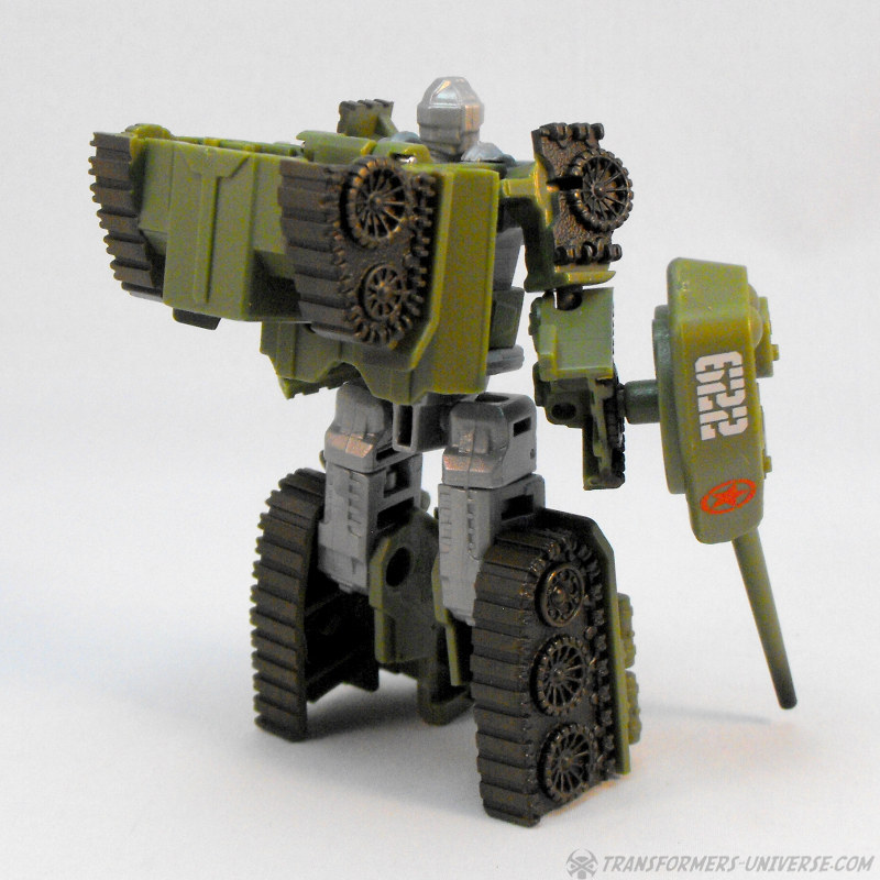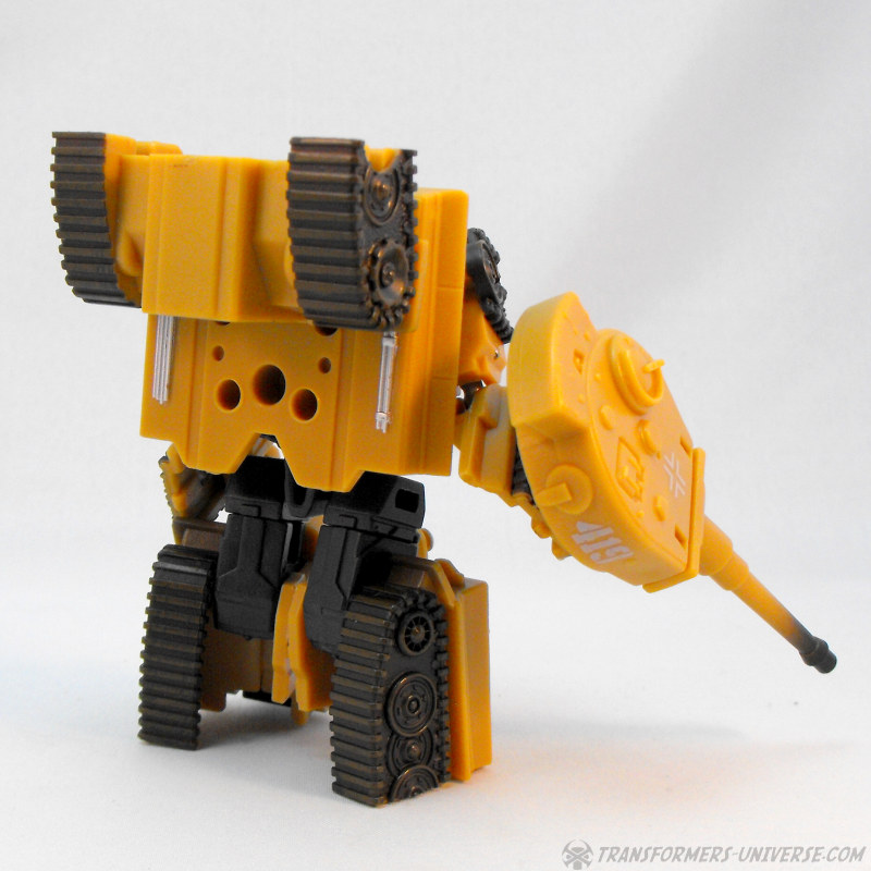 That said, these two figures are very nice robots. They’re somewhere between Legends and Scout sized, but are more articulated than many bigger figures I can think of. All sorts of poses are no problem for either one. They both use their tank turrets for weapons, which they can either hold in their hands or plug into their forearms. Also, they each have a second weapon (really the foot of the combiner mode), which is basically a second turret and can be used accordingly.