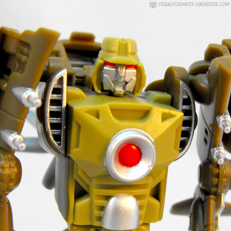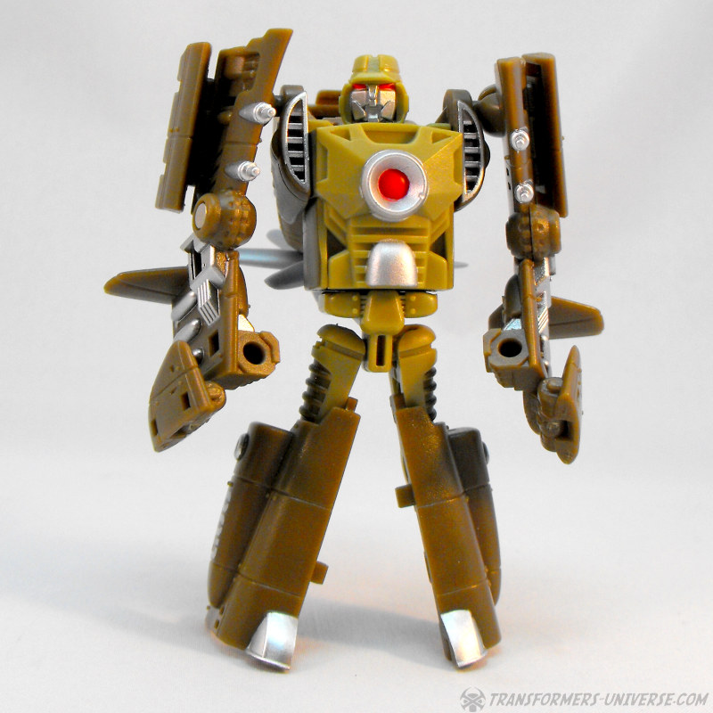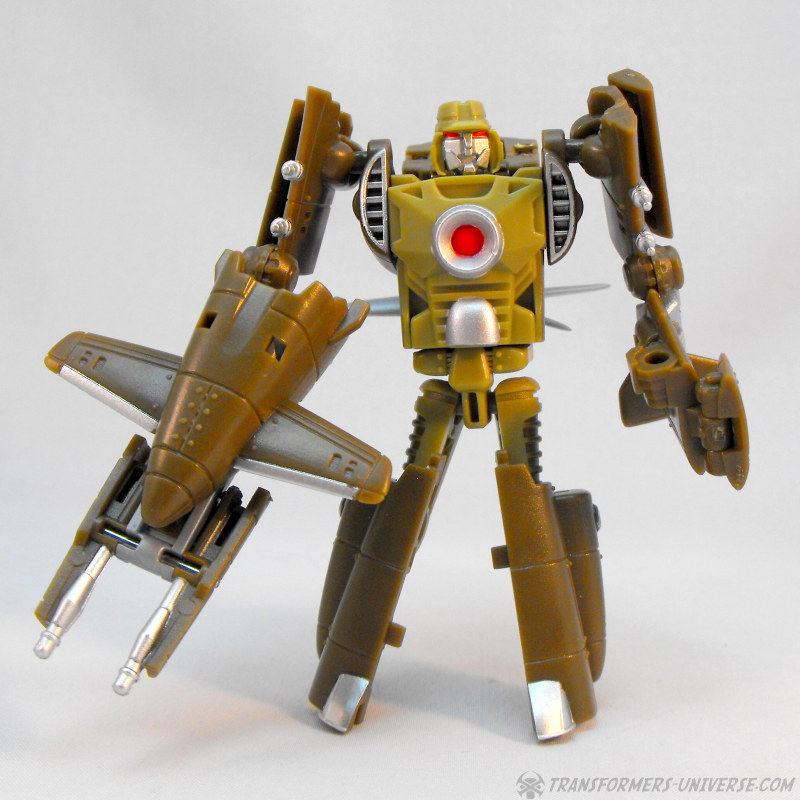Robot Modes (Planes): Much like the two tank robots, the two jet robots are of similar design, but not repaints of each other. Both form their arms from the wings of the planes and their legs from the tail, making them look a bit disproportioned with big upper bodies and rather thin, gangly legs. It’s not bad, but they certainly look more awkward than their stockier tank comrades.