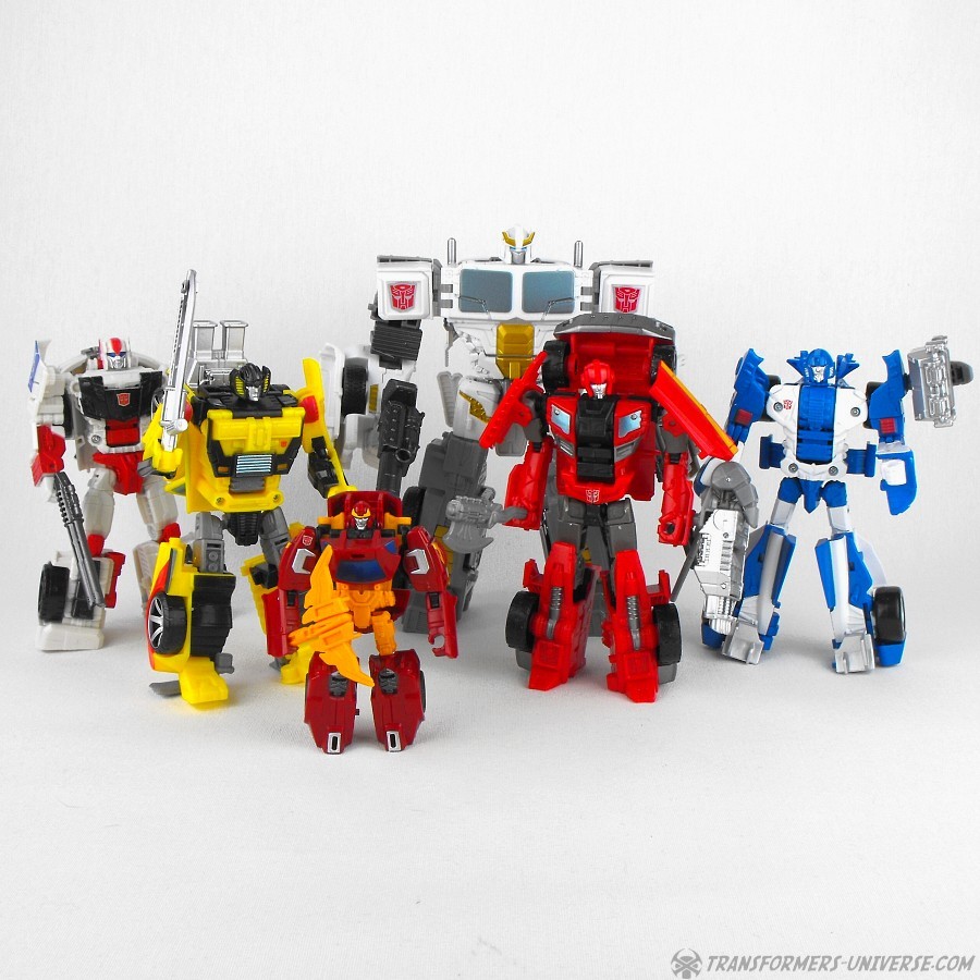 comprised of: Battle Core Optimus Prime Ironhide Mirage Prowl Rodimus Sunstreaker combine into:Optimus Maximus-- Back to Search Engine --