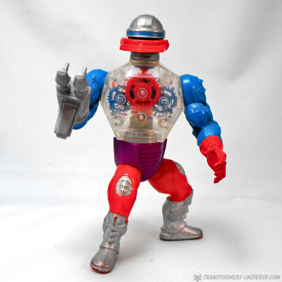 Roboto erschien im vierten Jahr der MotU Spielzeugreihe, das gleiche Jahr in dem die Horde auftauchte. Er ist, der Name deutet es an, ein Roboter und sein Gimmick ist, dass sein Oberkörper durchsichtig ist und man darin die Zahnräder sehen kann, die sich drehen wenn man die Hüfte dreht. Sein Ritter-artiges Visier bewegt sich dabei auf und ab. Er hat drei unterschiedliche Aufsätze für seinen rechten Arm. Einen doppelläufigen Blaster, eine Streitaxt und eine (bei mir leider fehlenden) Roboter-Klaue.
