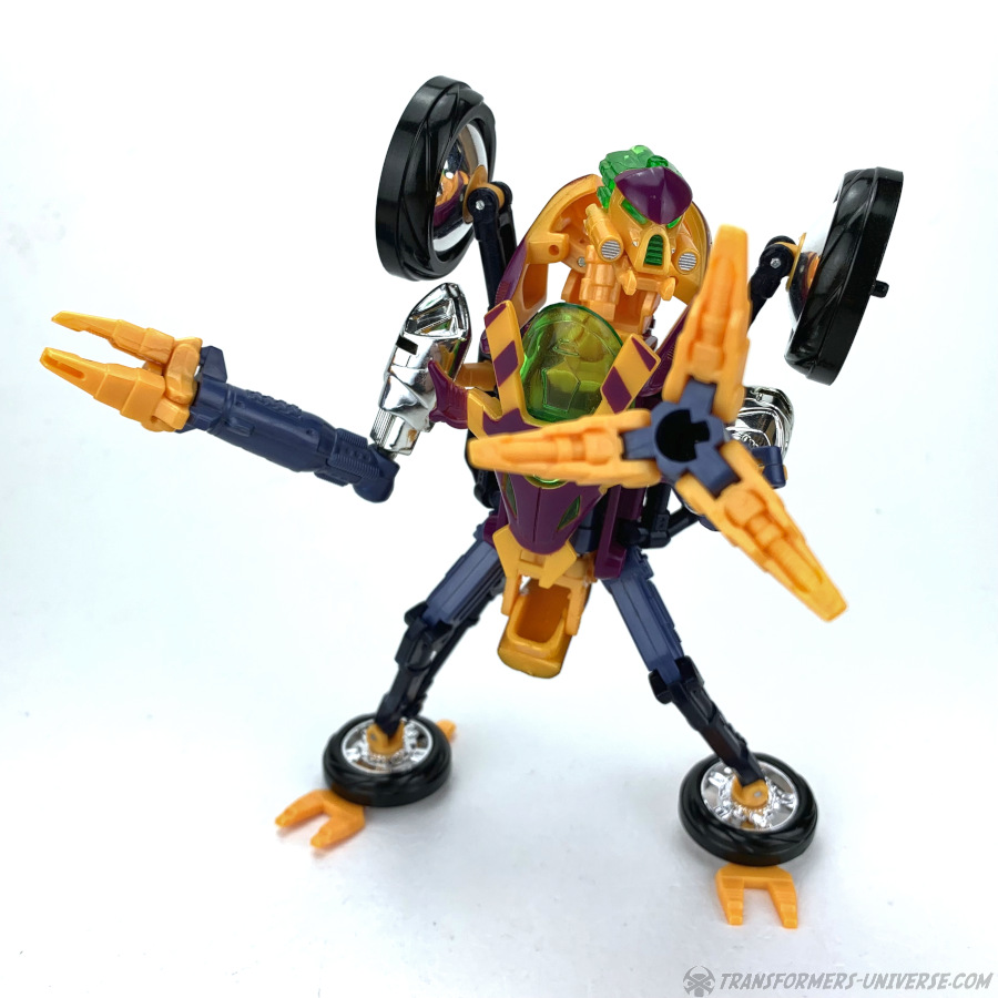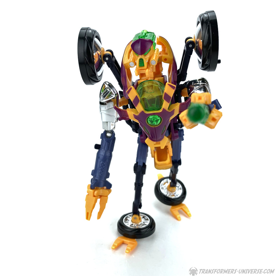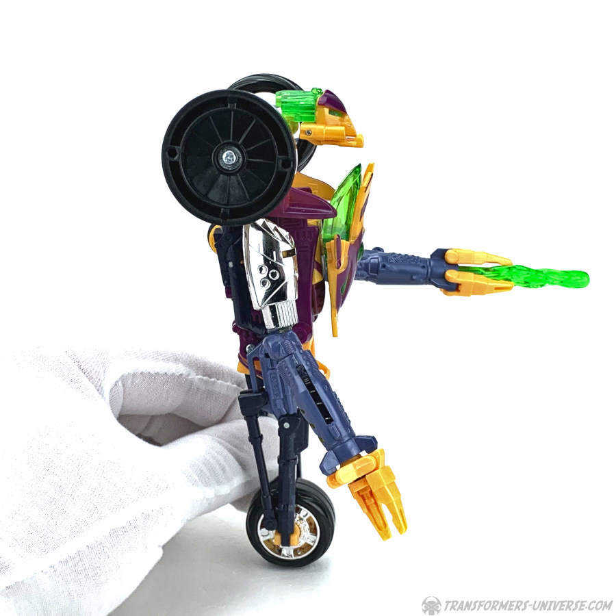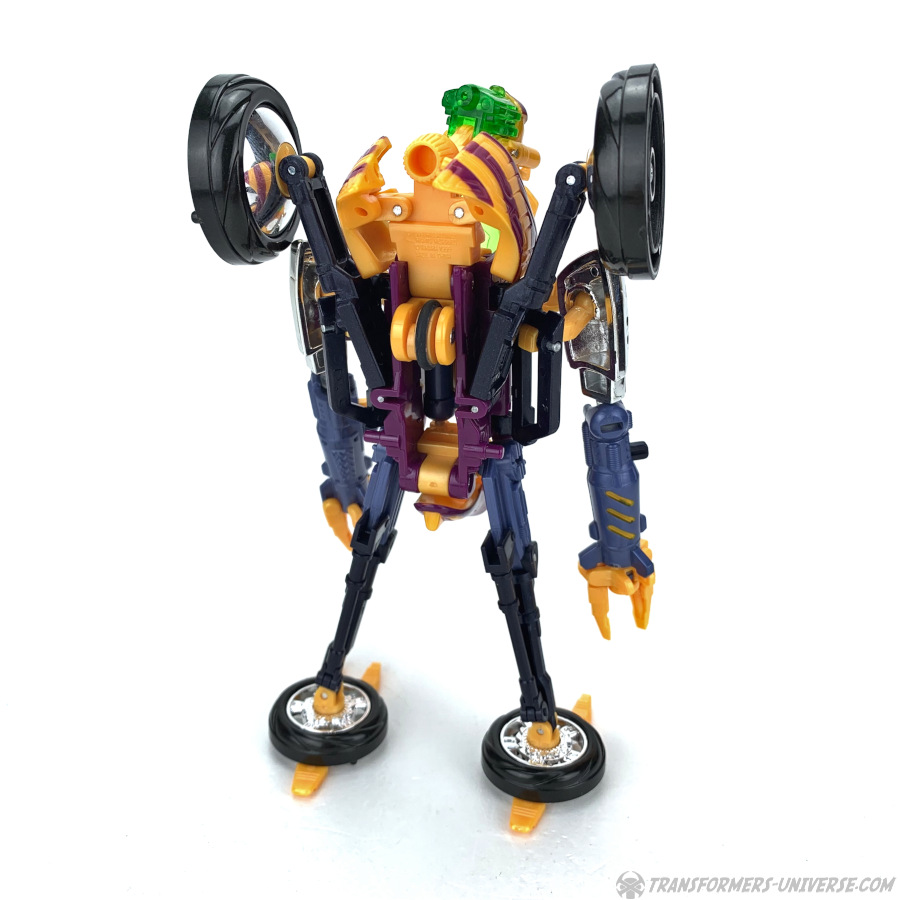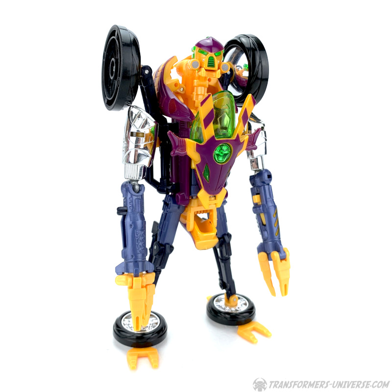 Robotermodus: Thrusts Robotermodus kann drei verschiedene Konfigurationen annehmen, was seinen Unterkörper angeht. Der Thrust, den wir in der Beast Machines TV Serie sahen, hatte keine Beine, sondern balancierte auf einem einzelnen Rad. Als Spielzeug kann Thrust auch so dastehen, halt auf einem Rad, aber dabei muss man ihn entweder gegen die Wand lehnen oder seine Rakete als Krücke in die Hand drücken, sonst kippt er um. Die stabilere Konfiguration mit Rädern unten dran ist sein "Dreirad-Modus". Das Vorderrad geht nach vorne, während die beiden Hälften des Hinterrades ihn hinten ausbalancieren. In diesem Modus sieht Thrust irgendwie wie ein zu groß geratener Junge auf einem viel zu kleinen Dreirad, aber der Modus funktioniert in punkto Balance und kann alle möglichen Posen (des Oberkörpers) ohne Probleme stützen.