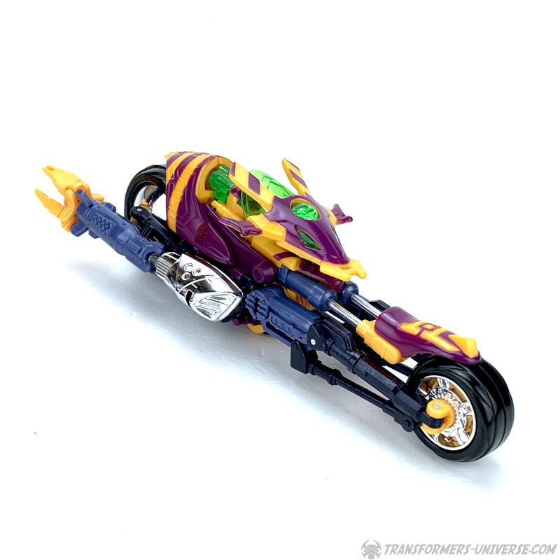 Alternativmodus: Thrust verwandelt sich in eine Art futuristisches Motorrad und sieht dabei sehr gut aus. Auch hier sind die Farben nicht hundertprozentig Serien-akkurat, aber davon abgesehen ein sehr tolles Fahrzeug. Jede Menge Details, ein toller Gesamteindruck, und ich bin eh ein großer Fan von Motorrädern. Das Motorrad ist nicht wirklich dafür gebaut, dass ein Fahrer draufsitzt, es gibt keinen Sitz oder ähnliches. Ist aber auch okay so, schließlich wurden die Dinger als unbemannte Dronen gebaut. Thrusts Arme werden hier zu den Auspuffrohren an den Seiten und seine Rakete kann als Auspuffflamme dienen. Insgesamt also ein sehr, sehr schöner Fahrzeugmodus, keine Beschwerden.
