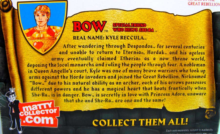 Final conclusion: a very nice depiction of Bow as we saw him in the cartoon and the toy version head is a nice bonus. Would have been nicer if the quiver and cape hadn't all been one piece, but that's just about the only complaint I have.