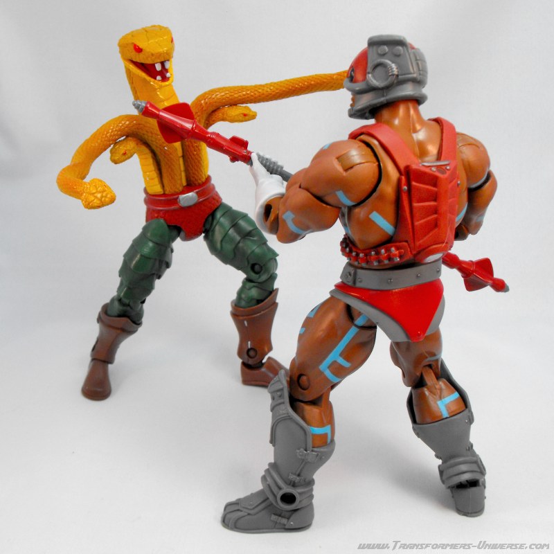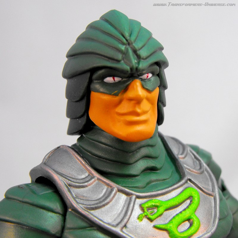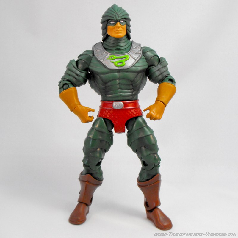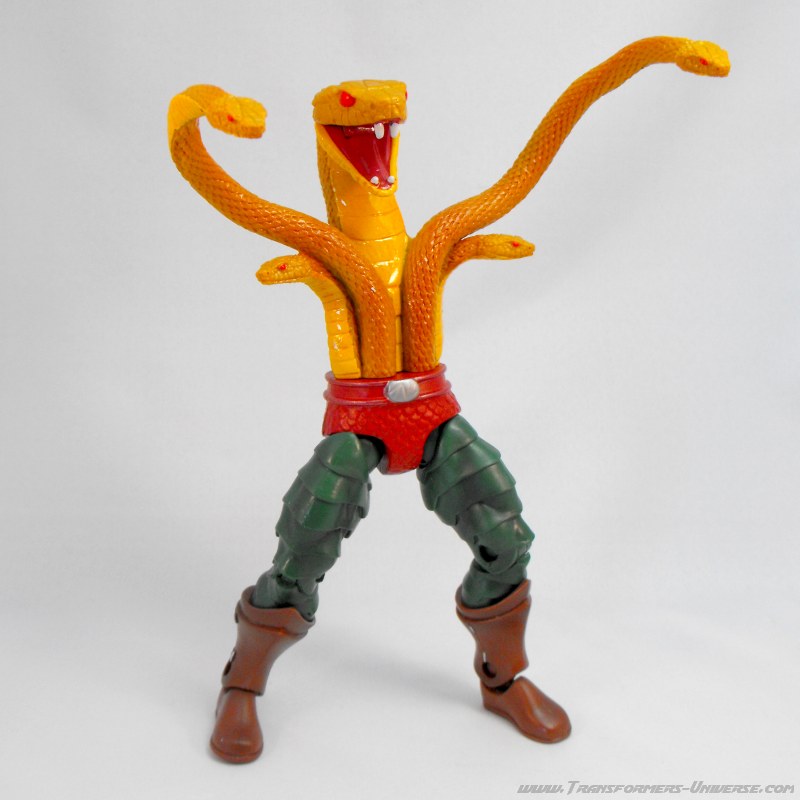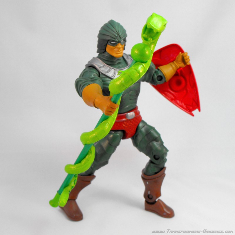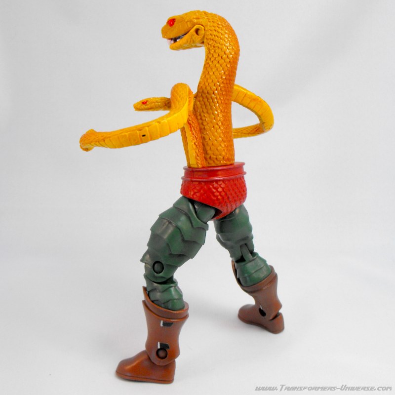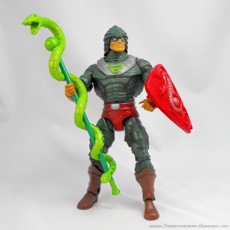 Review: Classics King Hssss is a pretty straight-up recreation of the vintage King Hiss figure, though instead of having a human shell around his snake-formed upper body, the Classics figure comes with two exchangeable upper bodies, thus giving the humanoid body some actual articulation. Articulation is as good as we're expecting from the Classics line at this point (even the snake torso can move quite a bit) and for weapons he carries a snake-themed staff and a red shield. Personally I like the more demonic-looking 200X King Hssss design, but this one here pays homage to the original figure. So bottom line: a great King Hssss figure (with or without vowels).