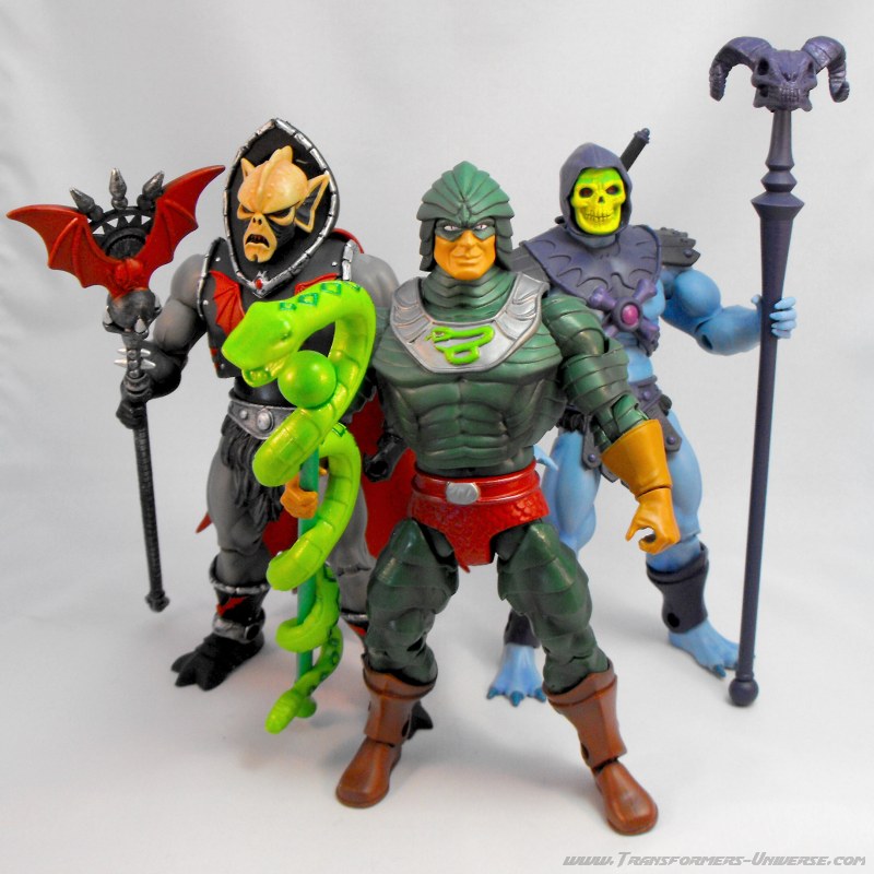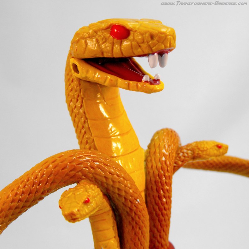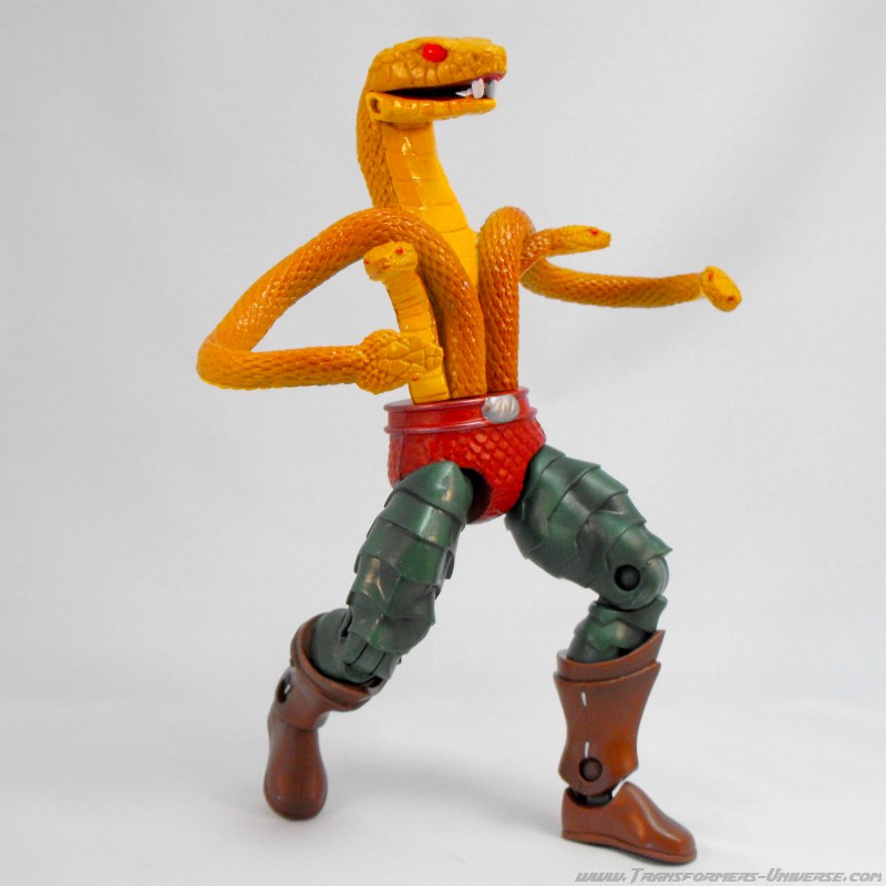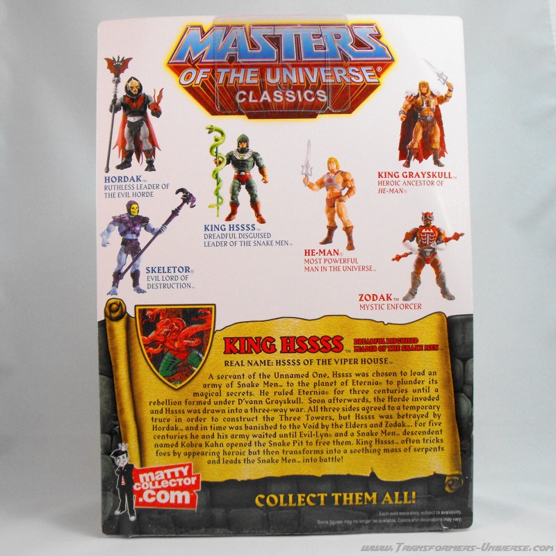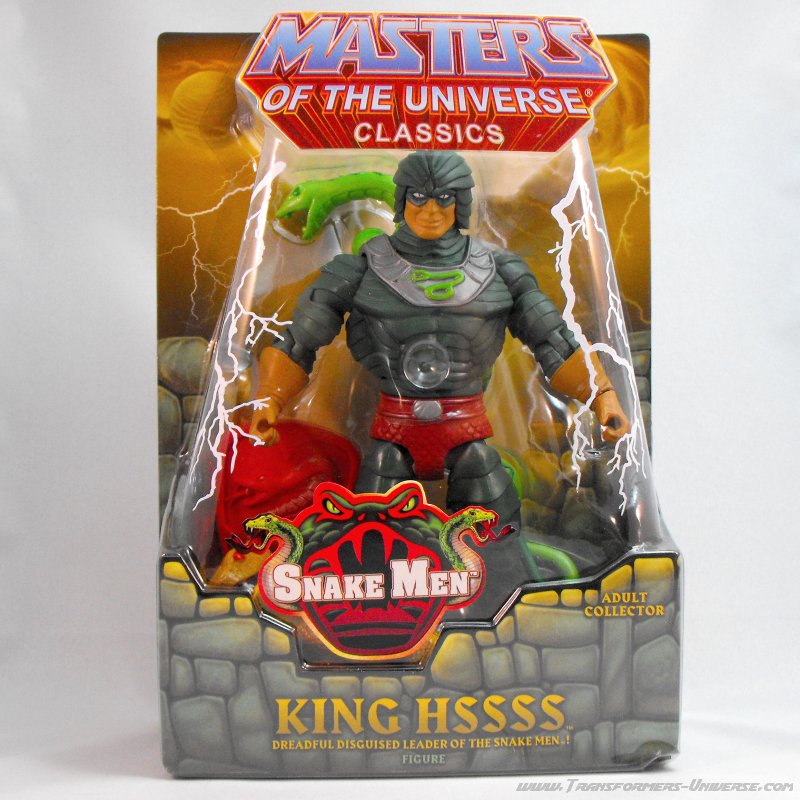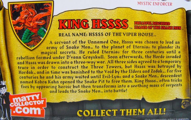 A servant of the Unnamed One, Hssss was chosen to lead an army of Snake Men to the planet of Eternia to plunder its magical secrets. He ruled Eternia for three centuries until a rebellion formed under D'vann Grayskull. Soon afterwards the Horde invaded and Hssss was drawn into a three-way war. All three sides agreed to a temporary truce in order to construct the Three Towers, but Hssss was betrayed by Hordak and in time was banished to the Void by the Elders and Zodak. For five centuries he and his army waited until Evil-Lyn and a Snake Men descendant named Kobra Kahn opened the Snake Pit to free them. King Hssss often tricks foes by appearing heroic, but then transforms into a seething mass of serpents and leads the Snake Men into battle!