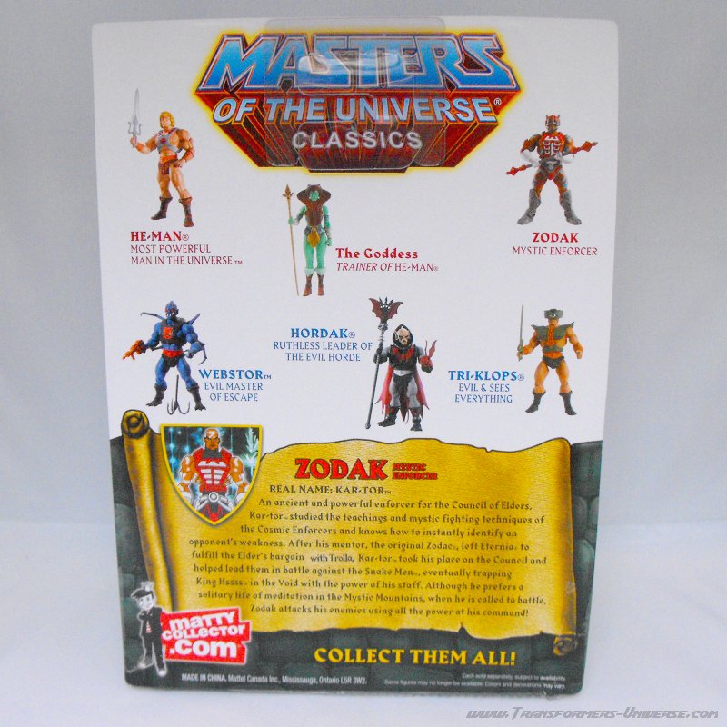 An ancient and powerful enforcer for the Council of Elders, Kar-Tor studied the teachings and mystic fighting techniques of the Comics Enforcers and knows how to instantly identify an opponent's weakness. After his mentor, the original Zodac, left Eternia to fulfill the Elders' bargain with Trolla, Kar-Tor took his place on the Council and helped lead them in battle against the Snake-Men, eventually trapping King Hssss in the Void with the power of his staff. Although he prefers a solitary life of meditation in the Mystic Mountains, when he is called to battle, Zodak attacks his enemies using all the power at his command!