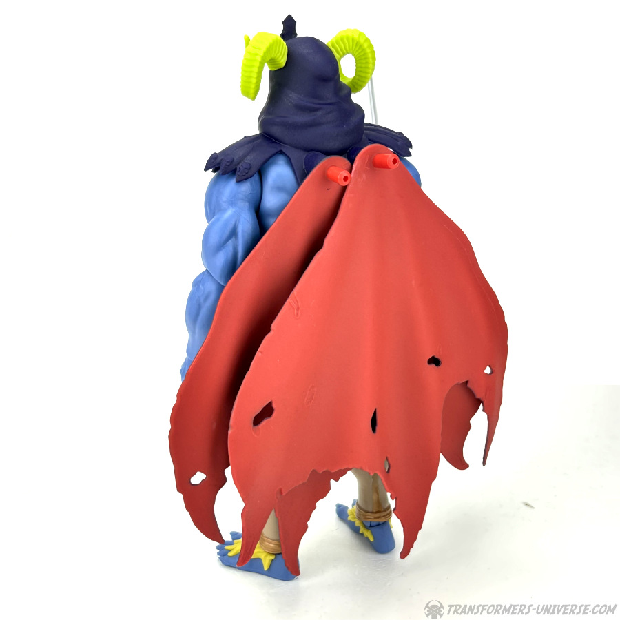 Articulation is standard for a Masterverse figure, meaning pretty good, and Skell-Ra’s cape can swivel outwards, becoming almost wing-like. It’s purple from the front, but red when looked at from the back, which is due to this being two figures in one, as I mentioned above. Skell-Ra can also remove his hood, revealing a naked skull. While Skell-Ra can turn his head, the hood remains static, so it looks a bit weird when he’s looking to the side.