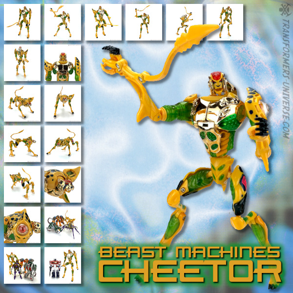 Formerly hot-headed and inexperienced, Cheetor is growing up fast on Cybertron; still remains Optimus Primal's strongest supporter in the Techno-Organic war against Megatron and his Vehicons. His beast mode offers cheetah-like speed, agility, and endurance. Sharp, powerful claws and jaws. Robot mode has enhanced, frictionless body surface that causes energy pulses to glide right off. Cheetor can accelerate particles around aerodynamic form to create a vacuum useful in knocking down opponents.