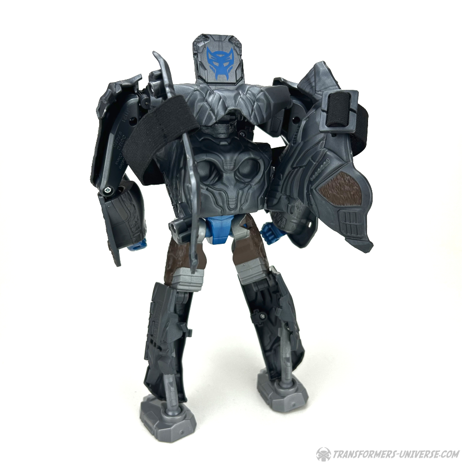 Now given the limitations of this robot having to transform into a mask, there are naturally some drawbacks to the robot. For one thing, when looking at him from the back, you see a lot of open spaces, especially in the legs. The back isn’t exactly a smooth surface, either. And you have the wings with the mask straps attached to them. Not mentioned in the instructions, you can hide most of the straps underneath the chest flap.