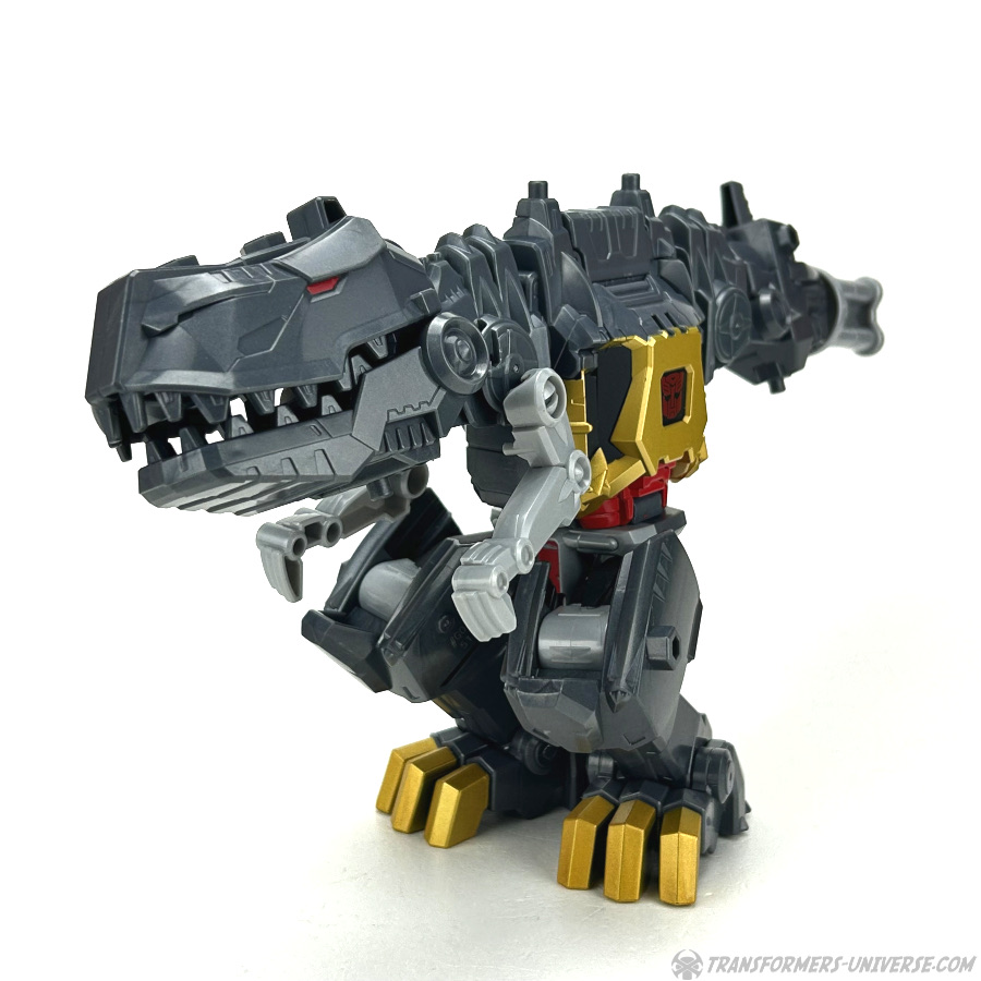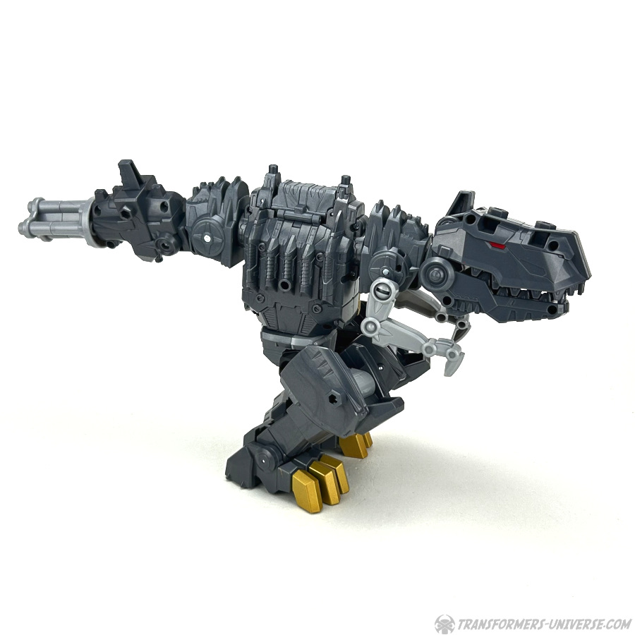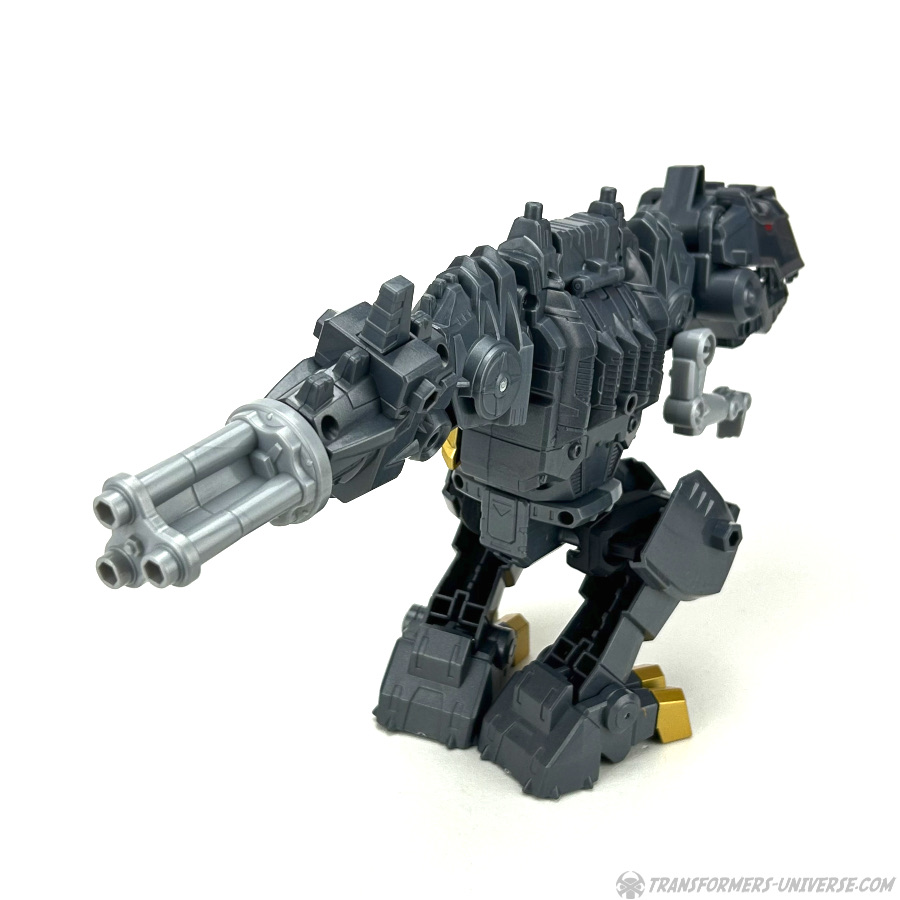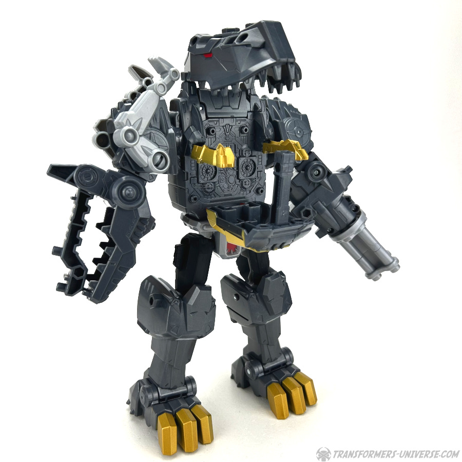 Look-wise he is clearly Grimlock, but with some unusual design elements. Chief among them the big T-Rex head he has for a right hand. That’s usually more Beast Wars Megatron’s thing, but it looks pretty good here, too. The other arm ends in a big tri-barreled cannon, which can be made to spin by pushing in the lever on the side. Nice, I was just lamenting the lack of such action gimmicks in recent figures. We need more spinning cannons and flip-out guns, just saying. There is a sculpted fist behind the cannon (which can be taken off), so technically Grimlock does have an actual hand, though it’s hard to see.
