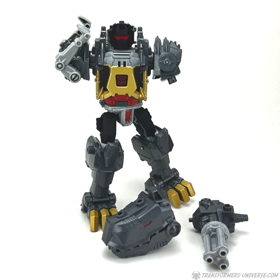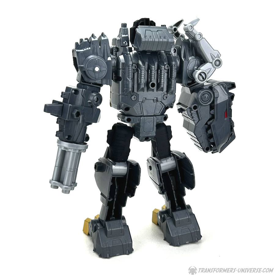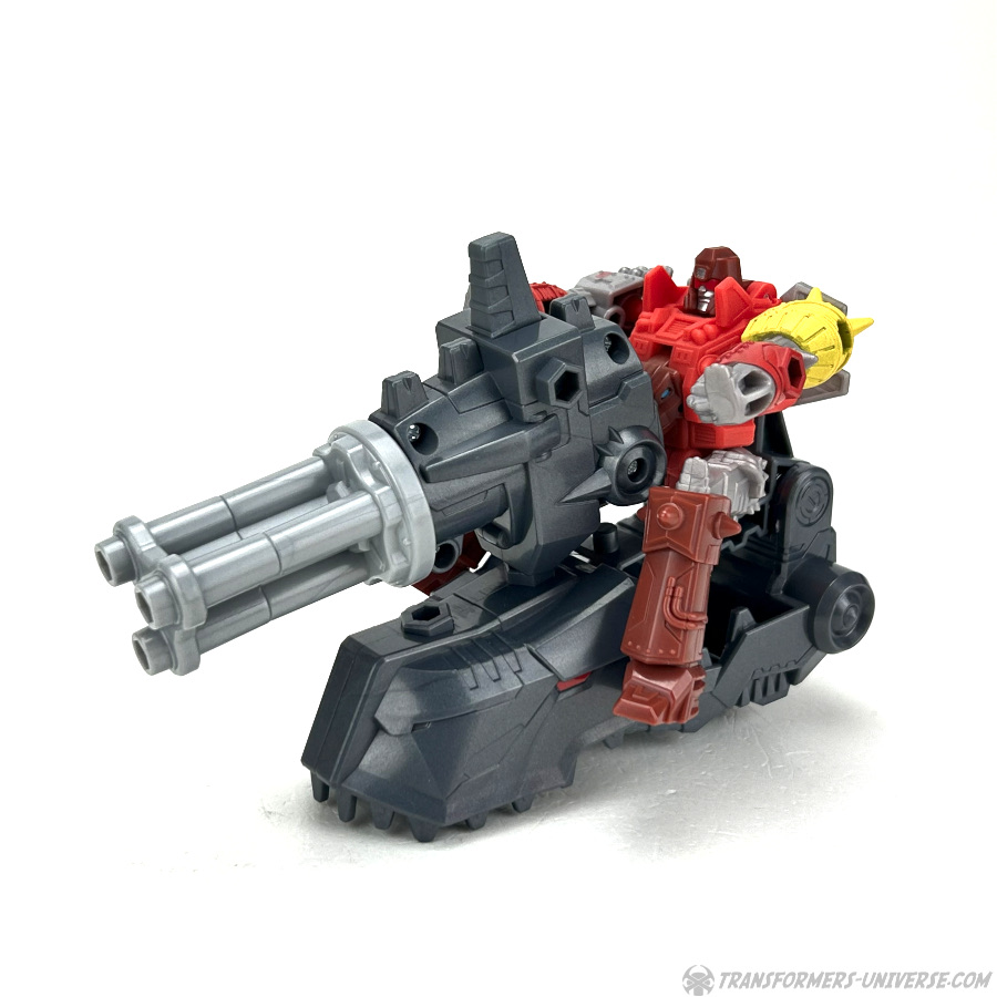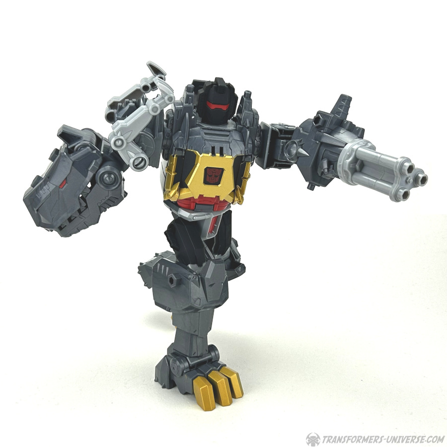 Look-wise he is clearly Grimlock, but with some unusual design elements. Chief among them the big T-Rex head he has for a right hand. That’s usually more Beast Wars Megatron’s thing, but it looks pretty good here, too. The other arm ends in a big tri-barreled cannon, which can be made to spin by pushing in the lever on the side. Nice, I was just lamenting the lack of such action gimmicks in recent figures. We need more spinning cannons and flip-out guns, just saying. There is a sculpted fist behind the cannon (which can be taken off), so technically Grimlock does have an actual hand, though it’s hard to see.