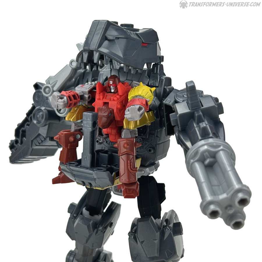 Finally, Grimlock can also become a sort of mech-suit for a smaller Cyberverse figure. His chest flips open, forming a cockpit of sorts with a raised central yoke or joystick and two “armrests” flipping out, too. The upper part of the T-Rex head detaches and is pegged into the shoulders, thus becoming the “roof” of the cockpit. Now you simply place a Cyberworld figure into the seat and, if you want, you can also peg in an additional weapon in the central yoke (see picture 21). It’s pretty simple, yes, but so much fun.