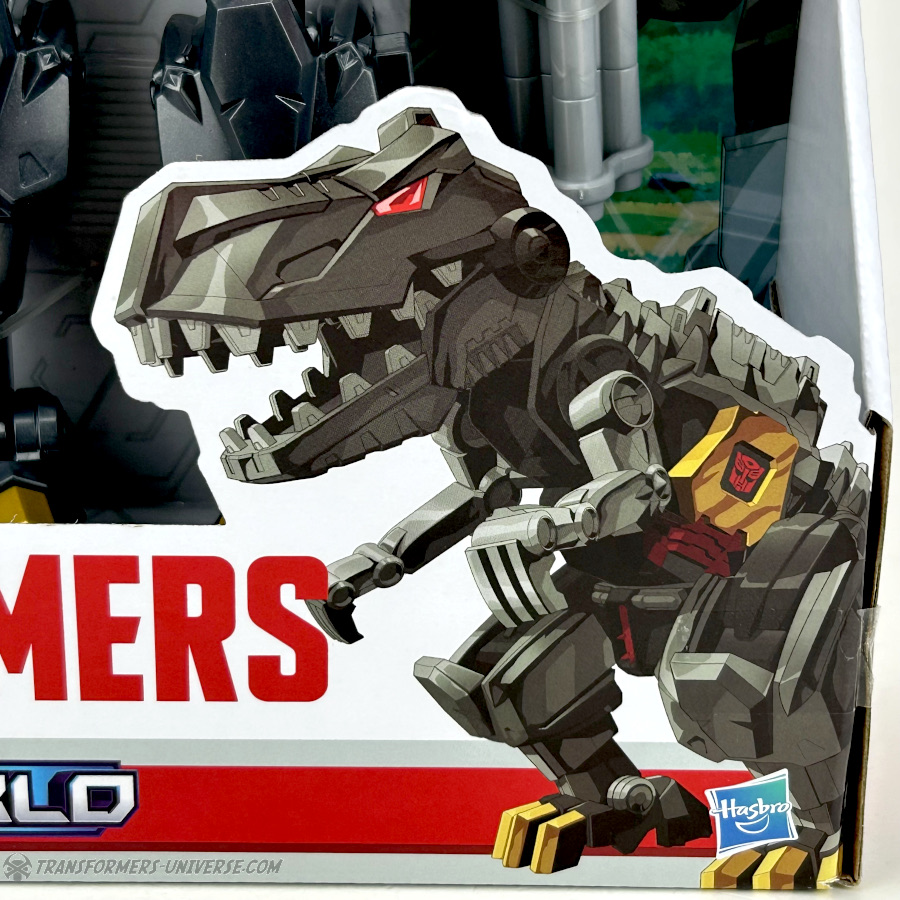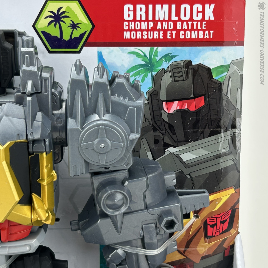 Prelude: A decade ago, when Age of Extinction came out, endless rows of Chomp & Stomp Grimlock toys warmed the shelves. Fast forward to today and Hasbro has finally figured out how to properly turn the Dinobot commander into a fun, interactive toy for a kid-oriented line. Cyberworld Chomp & Battle Grimlock is here, Russian accent and all, so let’s say go!