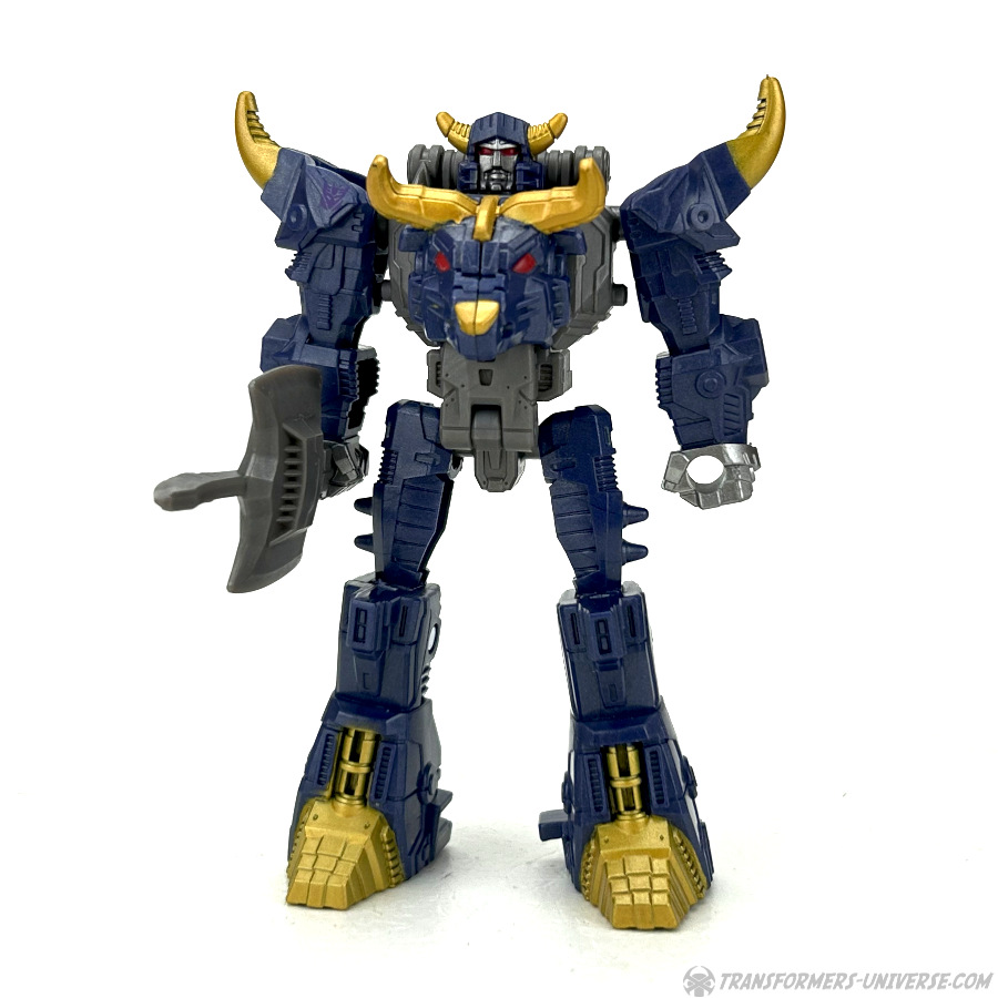 Now Megatron has a adopted a new look in Cyberworld, now being a mostly blue robot with gold (mostly the horns) and some grey. The body is clearly that of a beast-former (you might notice the big bull’s head on his chest), but the head is clearly Megatron, just with horns this time. The level of detailing on the head is actually quite good and puts some collectors’ figures in the same size class to shame. Almost looks like he’s wearing a goatee, but it’s actually just that his mouth is set a bit further in than the rest of his face. Either way, it looks pretty good.