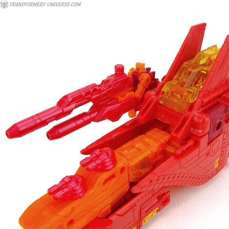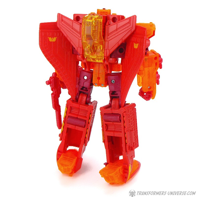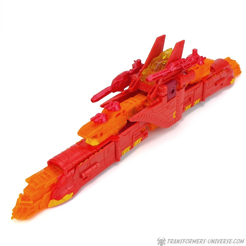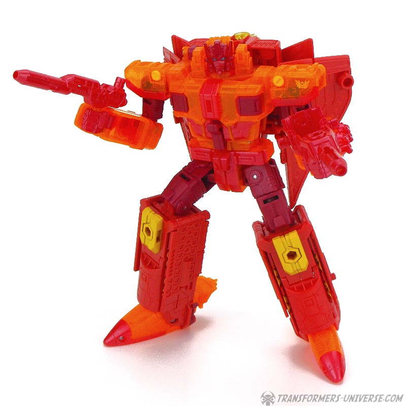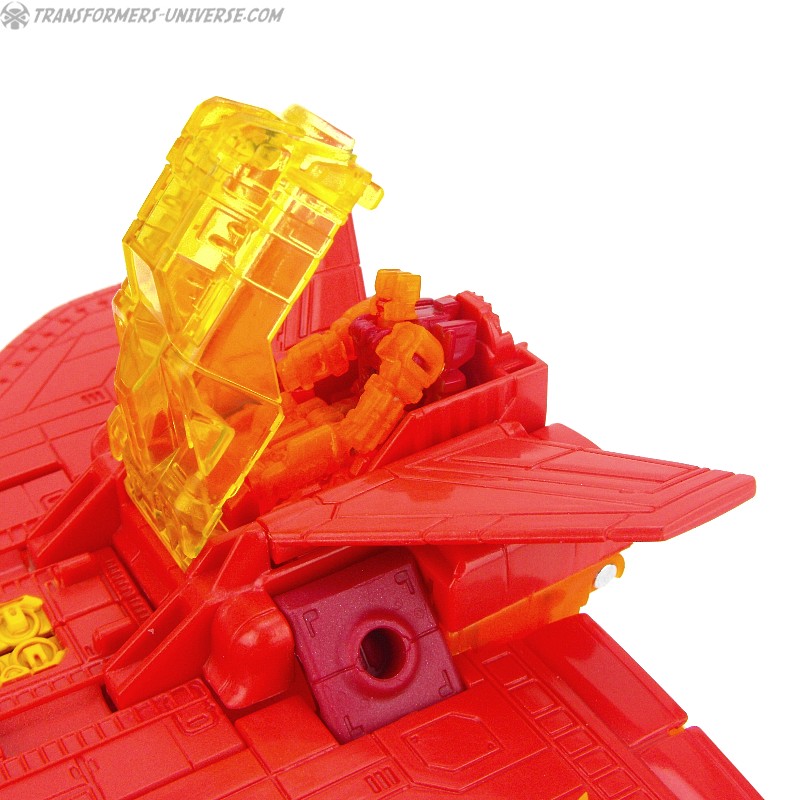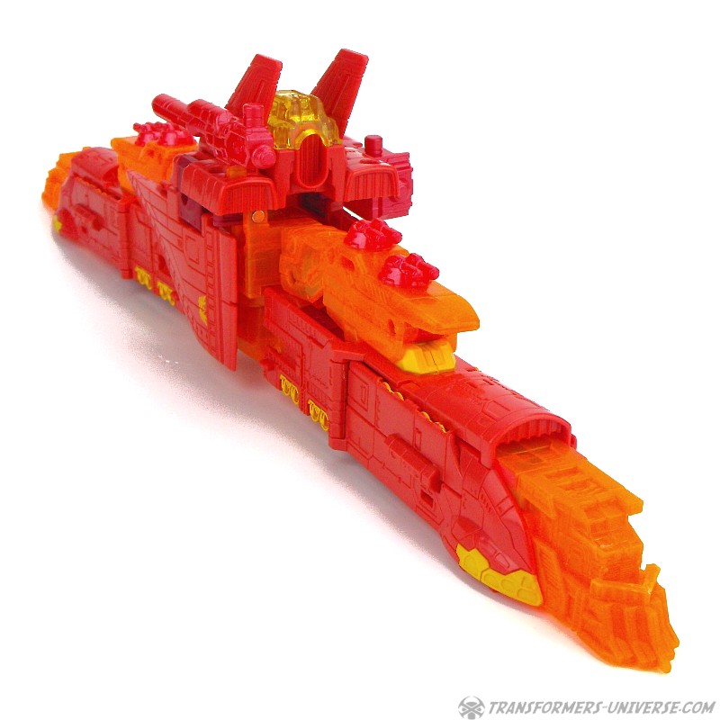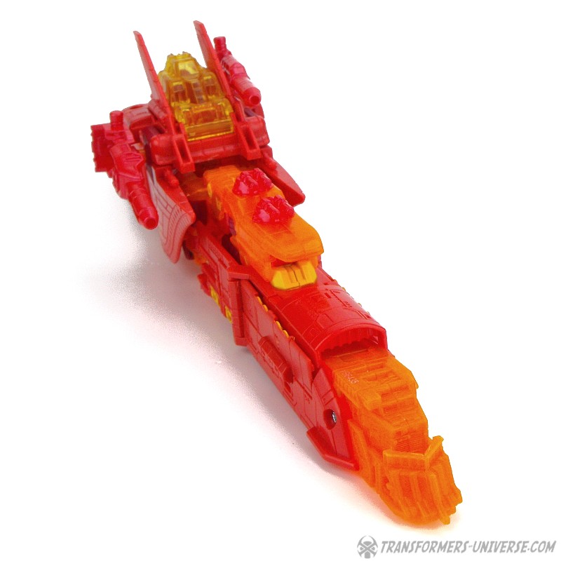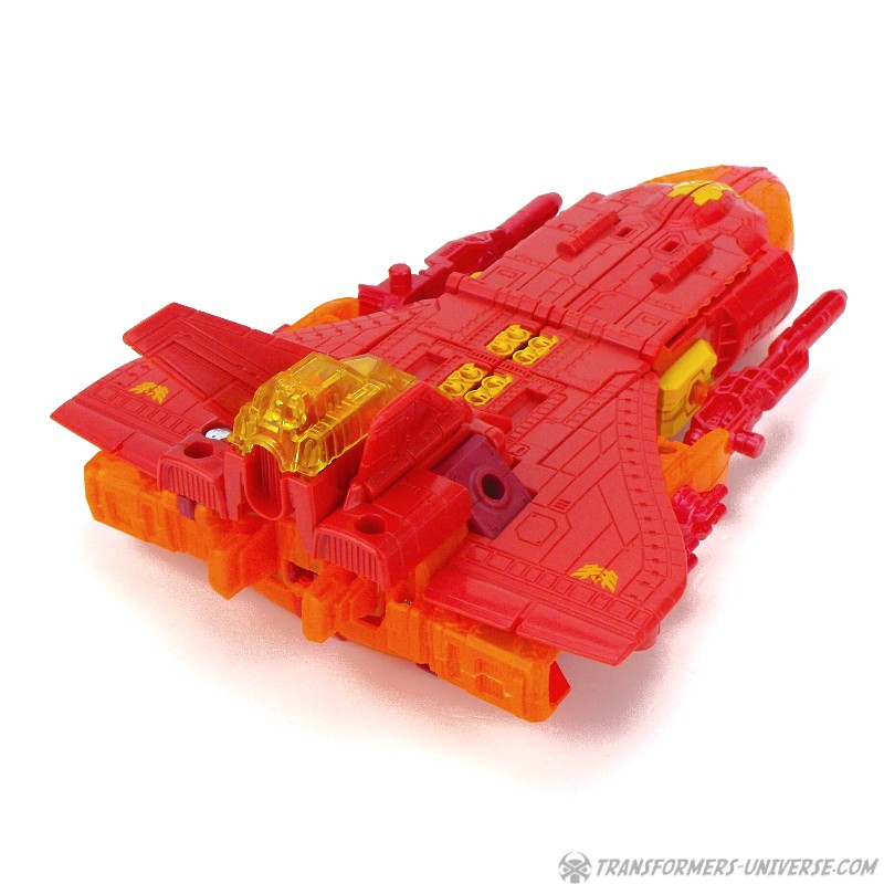 Robot Mode: This version of Sentinel Prime was an exclusive figure at SDCC 2016 as part of the three-figure Titan Force set. I already reviewed the retail version of this figure here way back in 2016 (GOD, HE’S SO ORANGE!!!), so this review here will focus mainly on the differences. Those being the application of numerous transparent-orange parts where the original had non-transparent orange (SO! MUCH! ORANGE!), what were once grey parts are now red, and… yeah, that’s pretty much it. As a result of this, Titan Force Sentinel Prime is even harder to photograph than retail Sentinel without turning into a vaguely robot-shaped orange blob in the process.