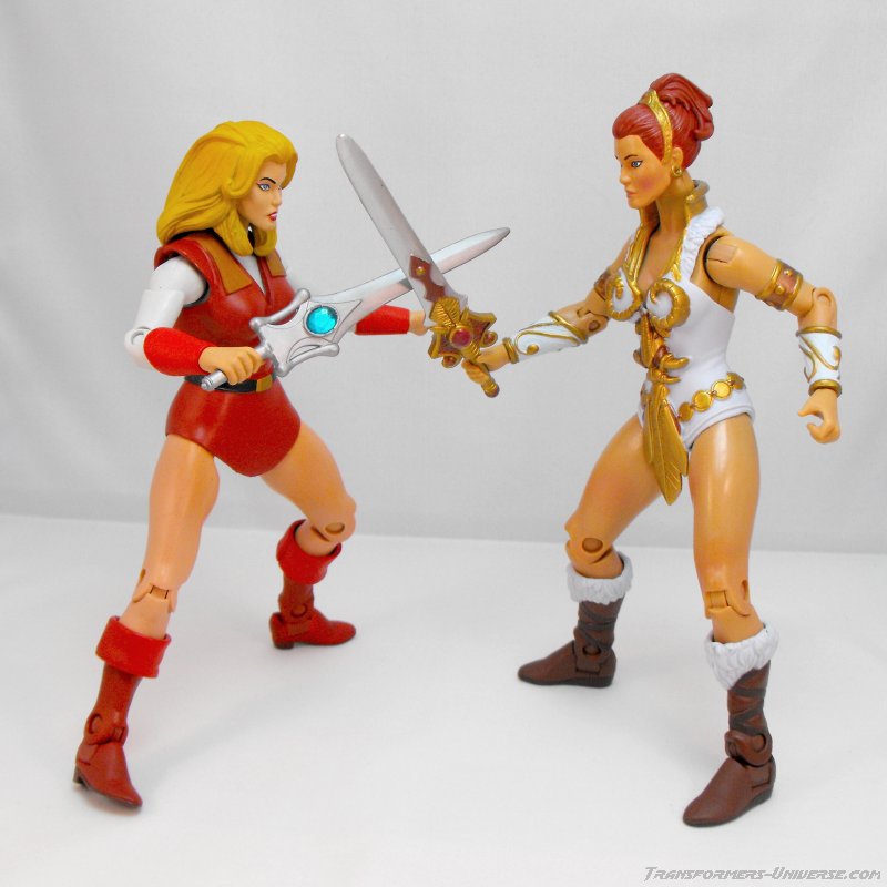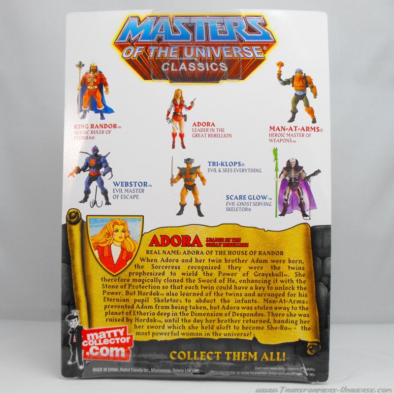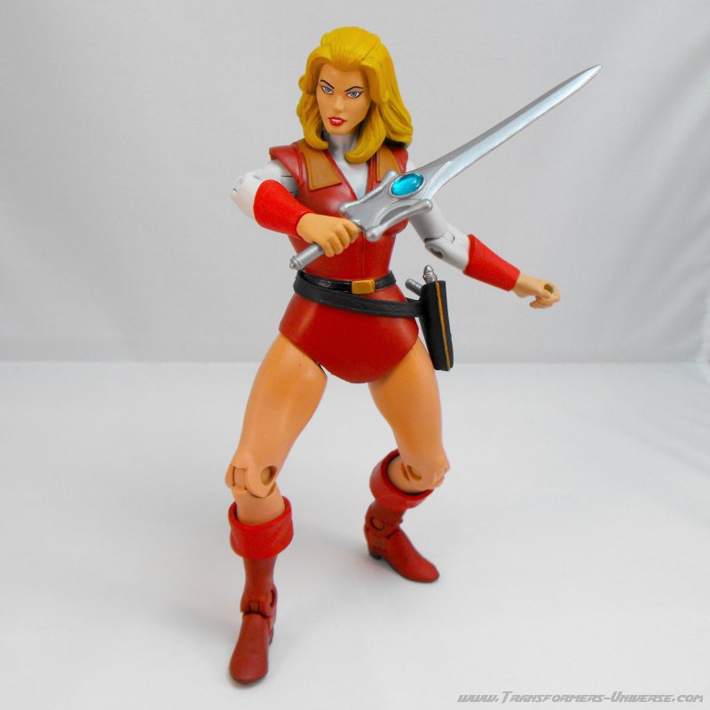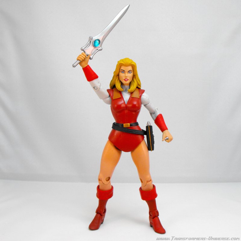 Review: Es gab in der originalen Princess of Power Reihe nie eine Adora, nur eine She-Ra die so irgendwie auch Adora sein sollte, wenn man ihr die Maske/Tiara abnahm. Die Filmation Version von Adora hingegen musste bis zur Classics Reihe im Jahr 2010 warten, dass sie endlich eine Figur bekam. Das Warten war es allerdings wert, denn das hier ist Adora, wie wir sie aus dem FIlmation Cartoon kennen, so als wäre sie direkt aus dem Fernseher herausgeklettert. Sie hat die gleiche Beweglichkeit wie alle MotU Classics Figuren, also ziemlich gut. Als Hauptwaffe trägt sie das Schwert des Schutzes, die silberne Version aus dem Cartoon, nicht die goldene, die bei Classics She-Ra dabei war. Außerdem eine kleine Laserpistole, die sie im Halfter ihres abnehmbaren Gürtels verstauen kann.