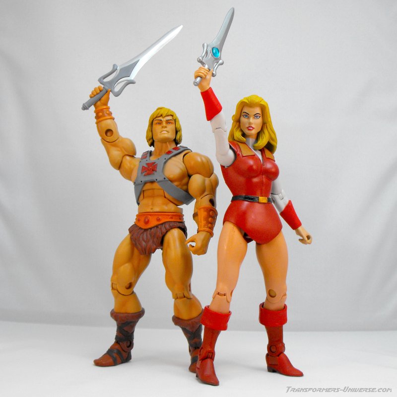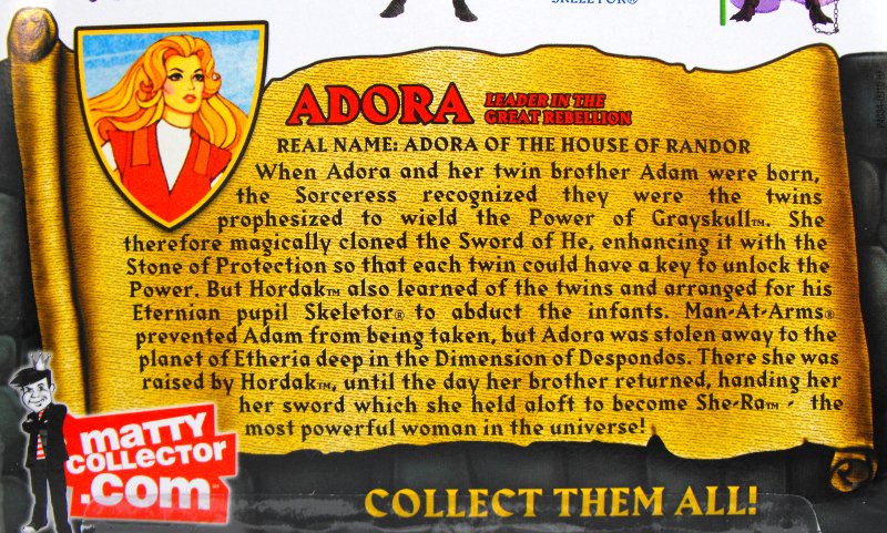 Als Adora und ihr Zwillingsbruder Adam geboren wurden, erkannte die Sorceress, dass die Zwillinge aus der Prophezeiung waren, die die Macht Grayskulls führen würden. Sie klonte deswegen das Schwert von He und verstärkte es mit dem Stein des Schutzes, so dass jeder Zwilling einen Schlüssel haben würde, die Macht zu beschwören. Aber Hordak erfuhr auch von den Zwillingen und arrangierte es, dass sein Eternischer Schüler Skeletor die Kinder kidnappen würde. Man-at-Arms verhinderte, dass Adam entführt wurde, aber Adora wurde von Eternia auf den Planeten Etheria gestohlen, tief in der Dimension Despondos. Dort wurde sie von Hordak großgezogen, bis zu dem Tag wo ihr Bruder zurückkehrte und ihr das Schwert in die Hand drückte. Als sie es hoch hielt, wurde sie zu She-Ra, der mächtigsten Frau des Universums.
