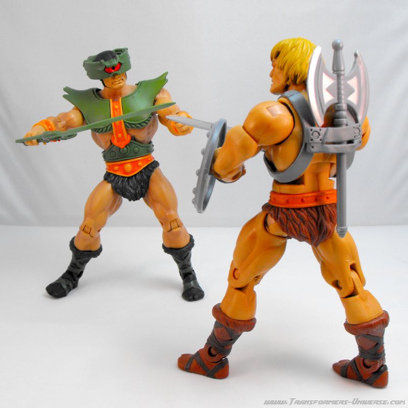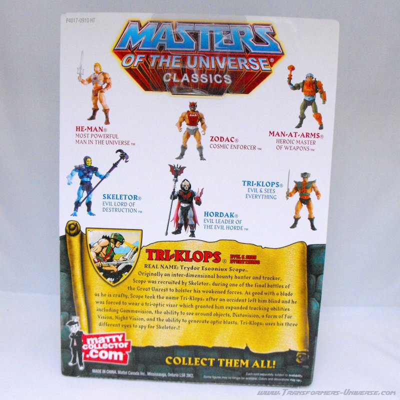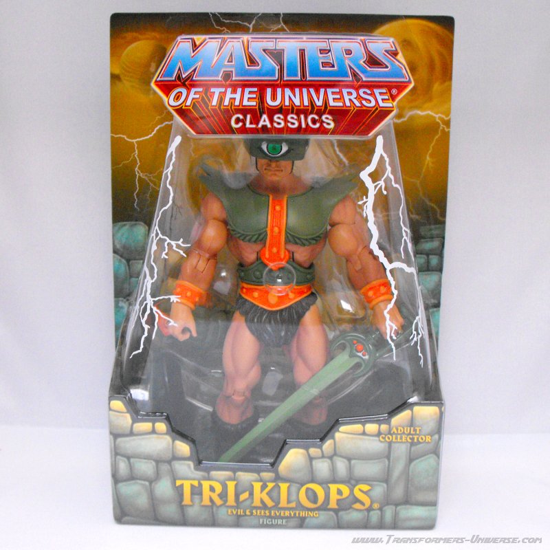 Bemerkungen: Der ursprüngliche Tri-Klops kam 1983 als Teil der zweiten Welle an Masters of the Universe Figuren raus und ist seitdem einer der primären Schergen von Skeletor. Die Classics Figur bleibt sehr nahe an der Originalfigur, inklusive rotierendem Stirnband mit den drei verschiedenen Augen. Das Stirnband kann hier allerdings auch abgenommen werden und darunter sieht man Tri-Klops echte Augen, die mit dem Stirnband verkabelt sind.