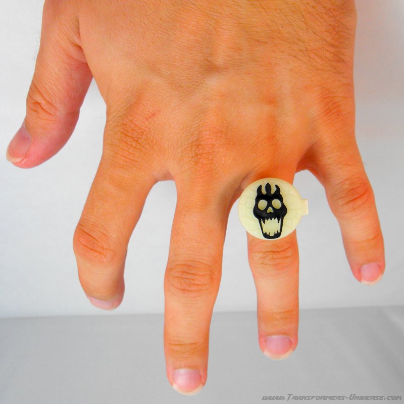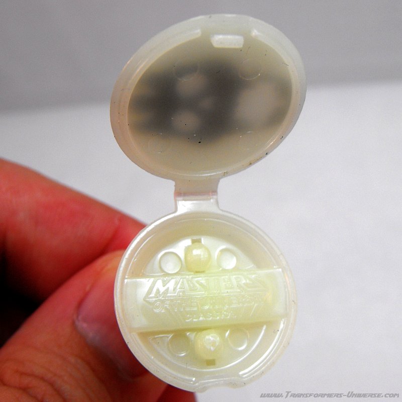 Die Figur hat mehrere Zubehörteile dabei, inklusive dem gleichen Schwert wie die Originalfigur und drei kleinen Wurfmessern, die alle am Rücken seines abnehmbaren Brustharnisches verstaut werden können. Tri-Klops hat außerdem den Doom Seeker dabei, die fliegende Drohne, die er im 200X Cartoon nutzte, um damit He-Man und die Masters auszuspionieren. Als letztes Zubehörteil ist noch dieser seltsame, im Dunkeln leuchtende Ring dabei, den auch die Originalfigur schon hatte, und der sich aufklappen lässt um ein Geheimfach zu öffnen. Ich wusste nie so richtig, was das Ding sollte.