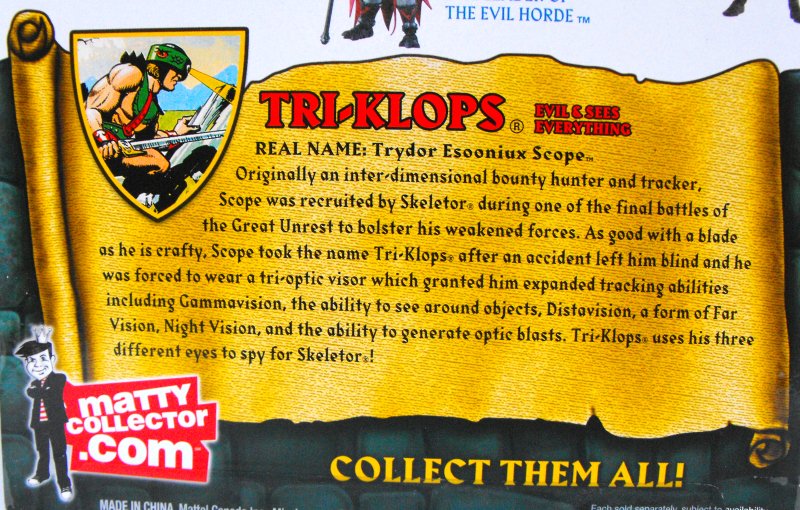 Scope war ursprünglich ein interdimensionaler Kopfgeldjäger und Fährtenleser, bevor er von Skeletor während einer der letzten Schlachten des Großen Aufstands rekrutiert wurde, um dessen geschwächte Streitkräfte zu verstärken. Scope ist ebenso gut mit dem Schwert, wie er gerissen ist, und nahm den Namen Tri-Klops an, nachdem ein Unfall ihn erblinden ließ. Seitdem ist er gezwungen einen Tri-Optischen Visor zu tragen, der seine Fähigkeiten enorm verstärkt, inklusive Gammablick, die Fähigkeit um Objekte herum zu sehen, eine Form von Fernblick namens Distavision, Nachtsicht und die Fähigkeit, optische Energieblitze abzufeuern. Tri-Klops nutzt seine drei verschiedenen Augen, um für Skeletor zu spionieren!