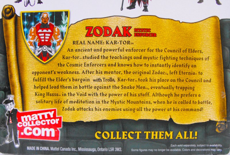 Ka-Tor ist der uralte und mächtige Vollstrecker des Rats der Ältesten und hat die Lehren und mystischen Kampfkünste der Kosmischen Vollstrecker erlernt. Er weiß wie er sofort die Schwächen eines Gegners identifizieren kann. Als sein Mentor, der ursprüngliche Zodac, Eternia verließ um den Handel der Ältesten mit Trolla zu besiegeln, nahm Ka-Tor seinen Platz im Rat ein. Er führte sie im Kampf gegen die Snake-Men an und setzte schließlich King Hssss im Nichts gefangen, dank der Macht seines Stabes. Obwohl er ein Leben in Einsamkeit und Meditation in den Mystic Mountains vorzieht, ist Zodak doch immer bereit in den Kampf zu ziehen und attackiert seine Feinde mit all der Macht, die ihm zur Verfügung steht.
