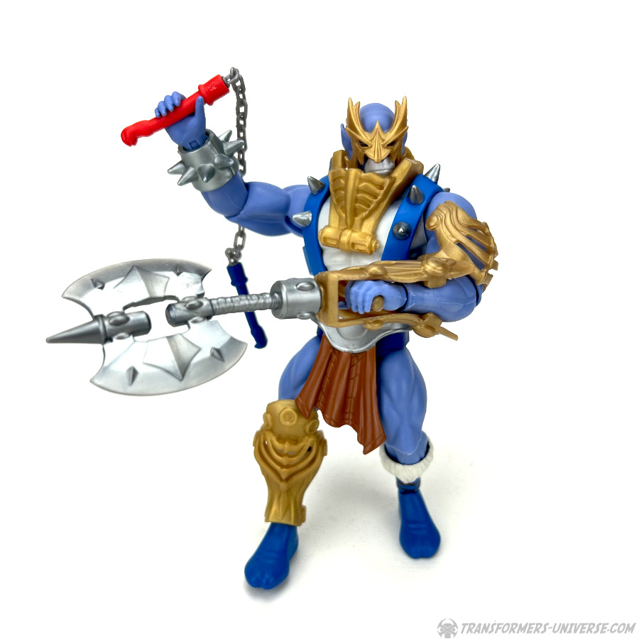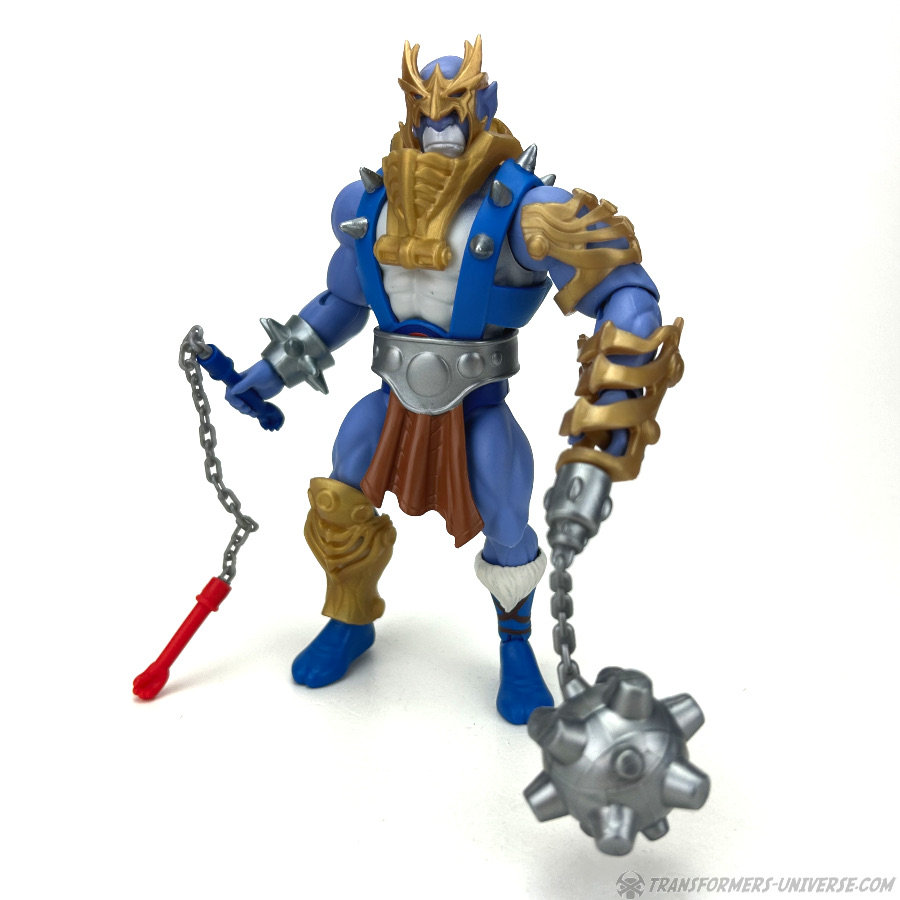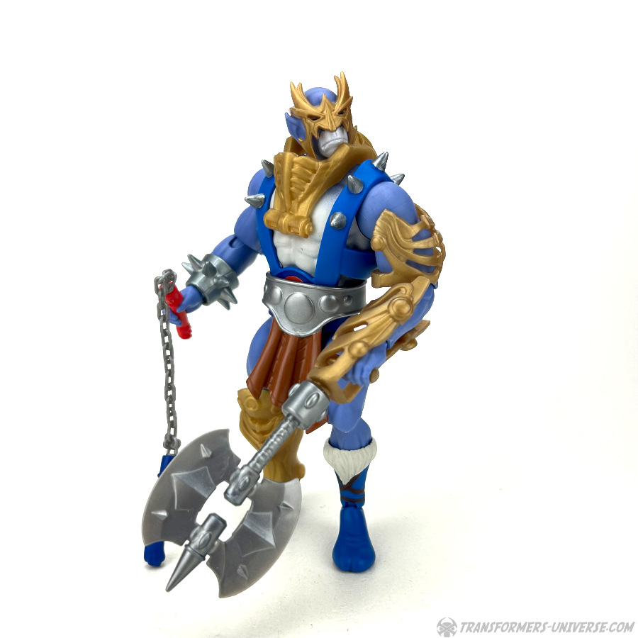 Direkt aus der Box trägt Panthro das, was ich gerne als MotU Bling bezeichne. Er trägt einen Brustharnisch mit dem von Man-at-Arms bekannten Mundschutz, hat einen großen Metallgürtel mit Lendenschurz, eine goldene Armschiene an der man entweder eine große Axt oder einen Morgenstern anbringen kann, sowie eine goldene Maske und goldene Arm- und Schienenbeinschützer. Er trägt außerdem die auf Eternia immer im Trend liegenden Fellstiefel.