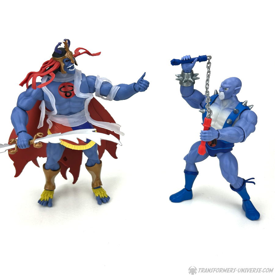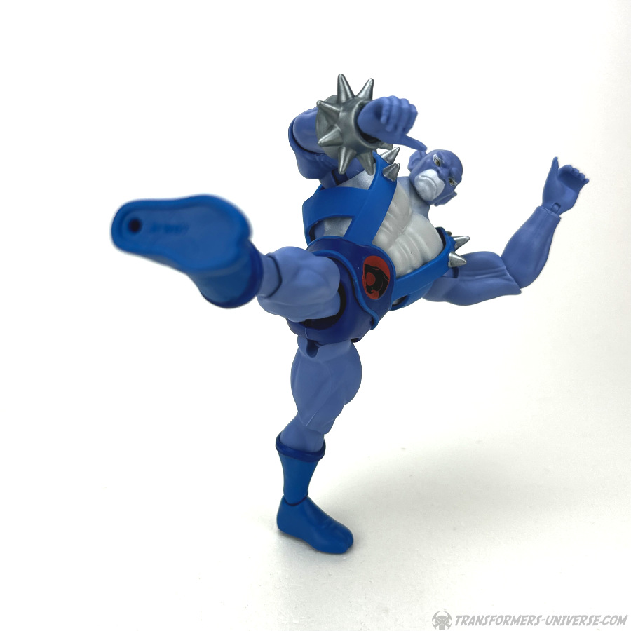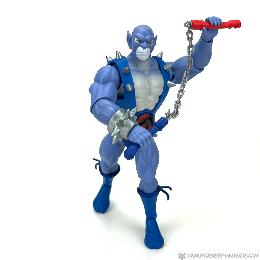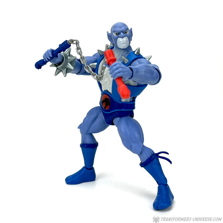 All dieses Bling kann man allerdings auch abnehmen, inklusive Austauschteilen für die Schienenbeine für fellfreie Stiefel, und mit einem neuen Brustharnisch und Gürtel haben wir dann direkt Panthro, der aussieht als wäre er direkt dem 1980er Cartoon entsprungen. In diesem „Modus“ trägt er seine bekannten Tatzen-Nunchaku als Waffe, die er beidhändig und in allen möglichen Posen schwingen kann.