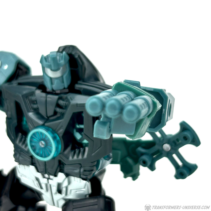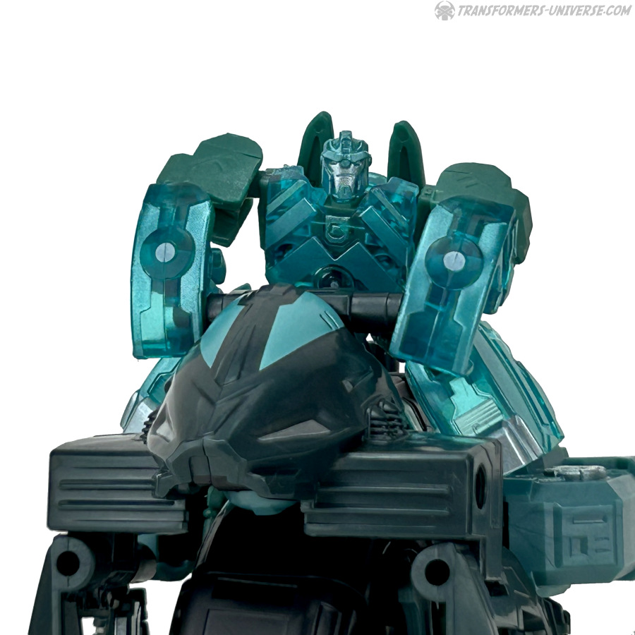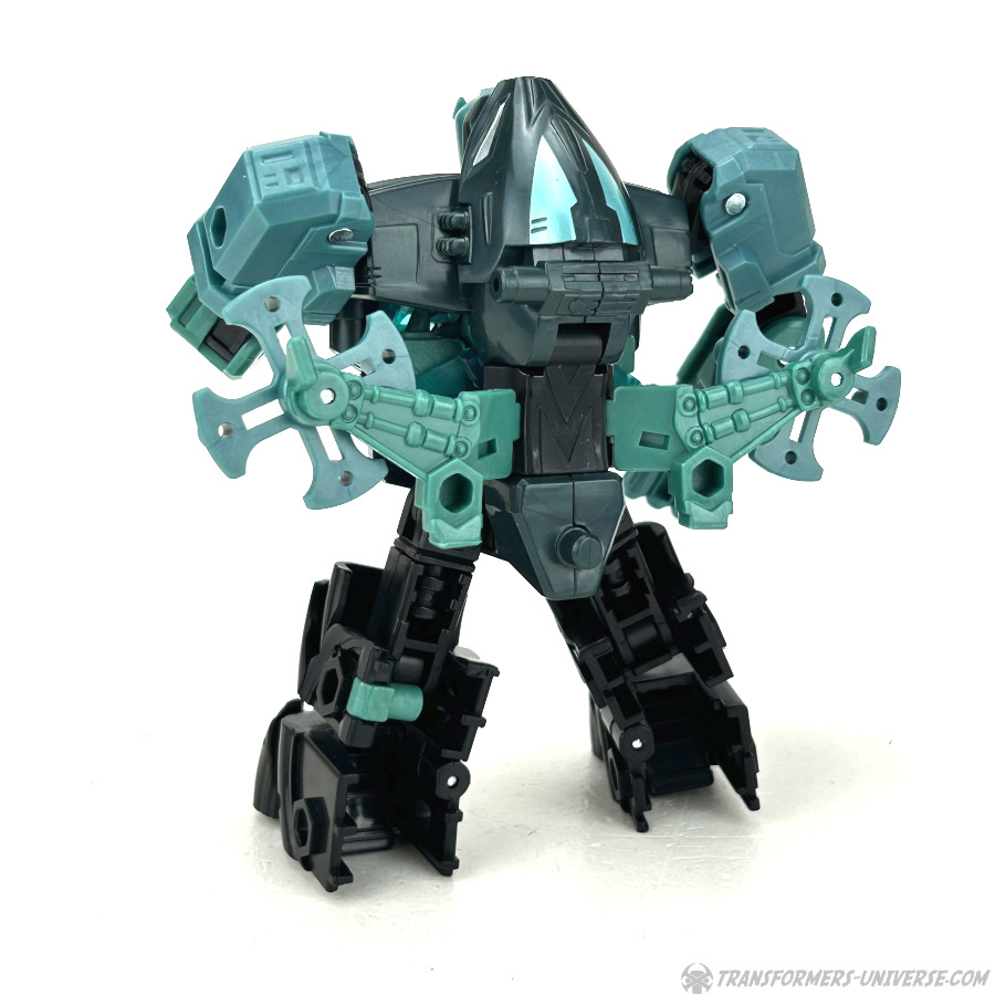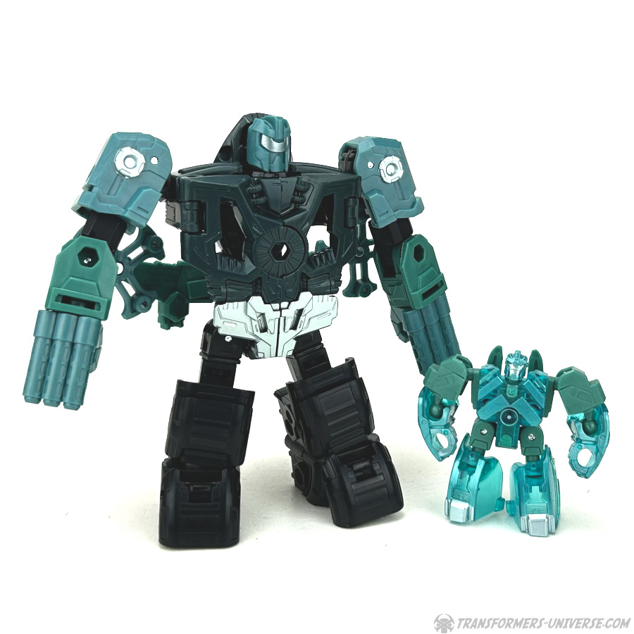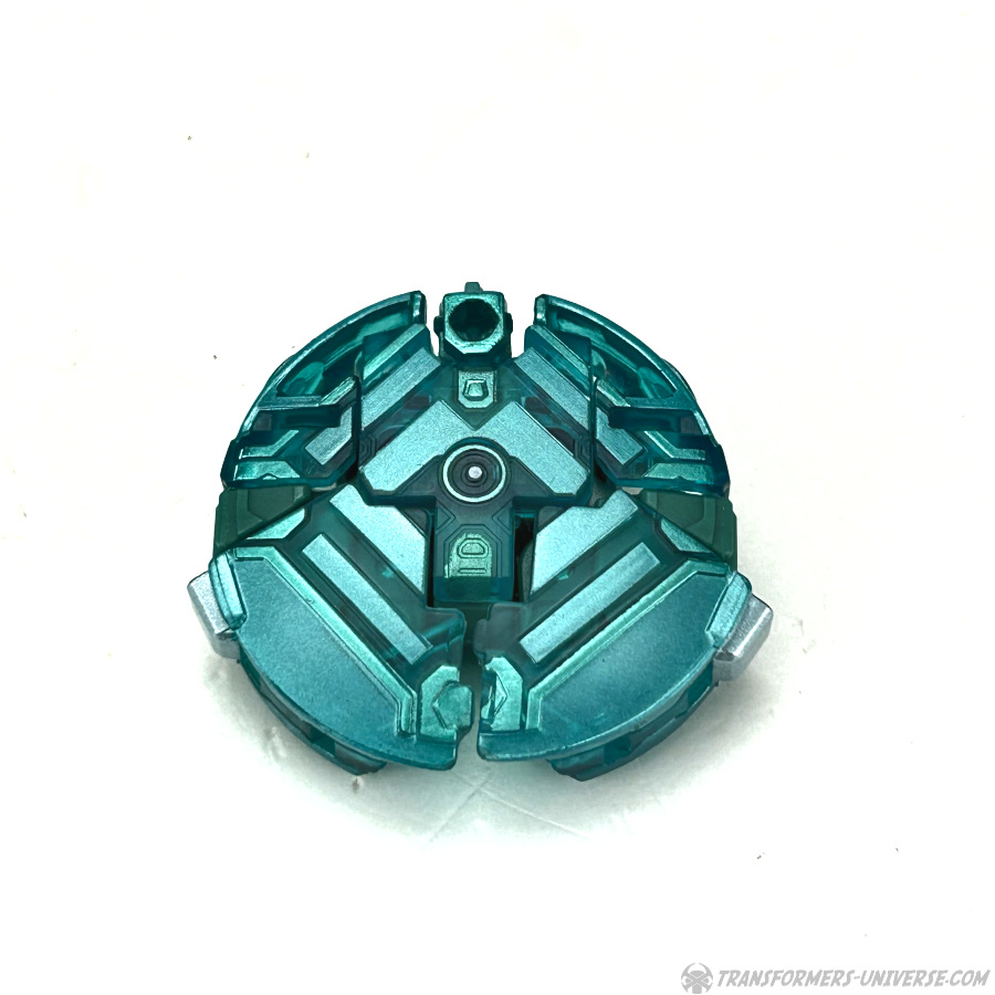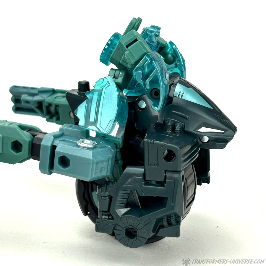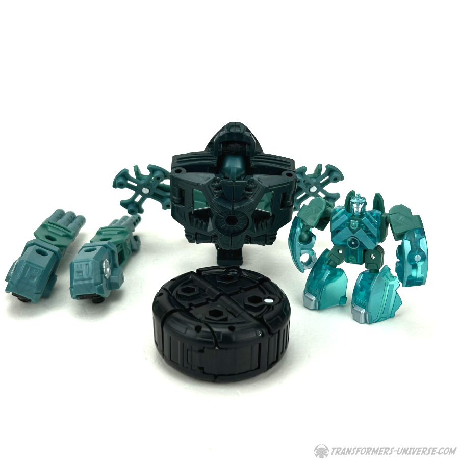 Wenig überraschend kann das Einrad auch transformieren. Erstmal zerfällt es in mehrere Teile, ähnlich wie ein Weaponizer, und diese können von beliebigen anderen Transformers Figuren mit 5mm Löchern als Zusatzteile genutzt werden. Die Hauptattraktion aber ist, dass das Einrad sich in die Apex Rüstung verwandelt. Der Look der Rüstung basiert größtenteils auf dem Auftritt im Transformers Prime Cartoon, mit ein paar Pretender Elementen obendrauf. Der Torso kann geöffnet werden, um darin Micronus in seinem Scheiben-Modus zu verstauen.
