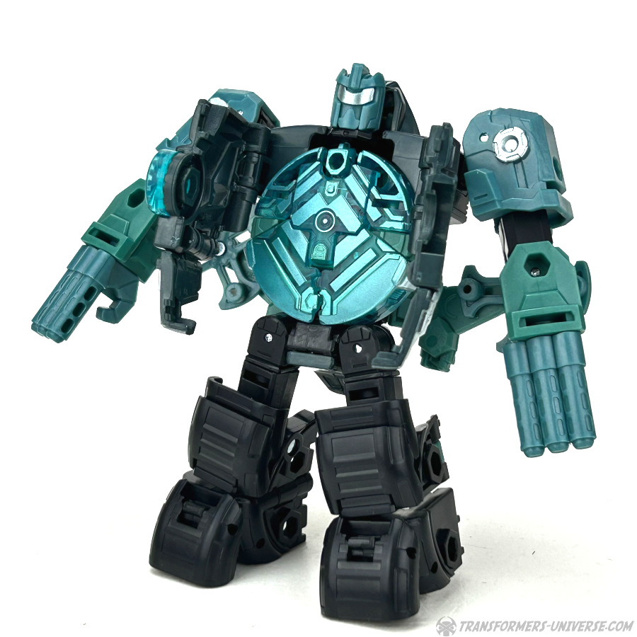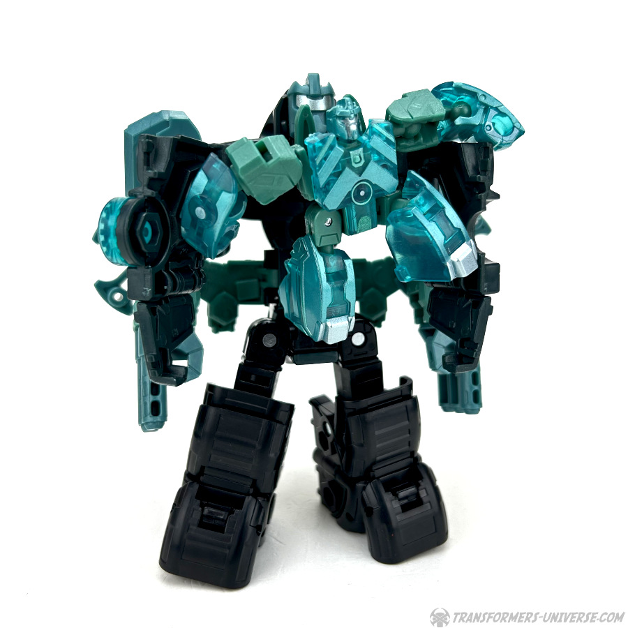 Robotermodus: Micronus Prime ist, wie der Name bereits andeutet, ein recht kleiner Roboter. Er hat in etwa die Größe eines Armada Mini-Cons, vielleicht einen Tick größer, und wie viele der kleinen Typen von damals hat er sowohl einige Teile aus transparentem Plastik, sowie eine gute Beweglichkeit dank Kugelgelenken. Sein Aussehen ist seinem Auftritt im 2015er Robots in Disguise Cartoon nachempfunden (mehr dazu unten) und wie alle Primes in der Age of the Primes Reihe hat er auch noch ein eigenes Artefakt dabei (man könnte auch McGuffin dazu sagen). In seinem Fall ist es der Chimera Stein, eine turbinenartige Scheibe, die es dem Träger erlaubt, sich der grenzenlosen Kraft von Micronus zu bedienen. Der Stein kann ihm auch auf den Rücken gesteckt werden.