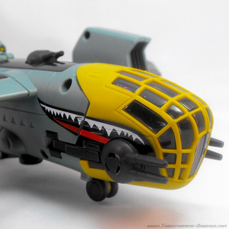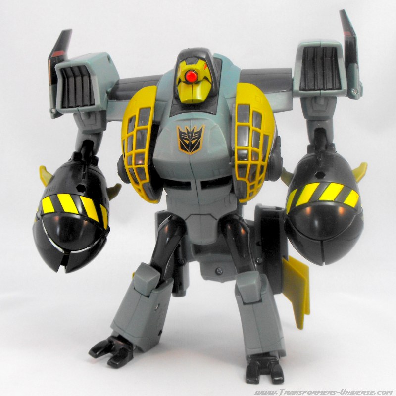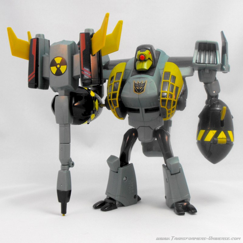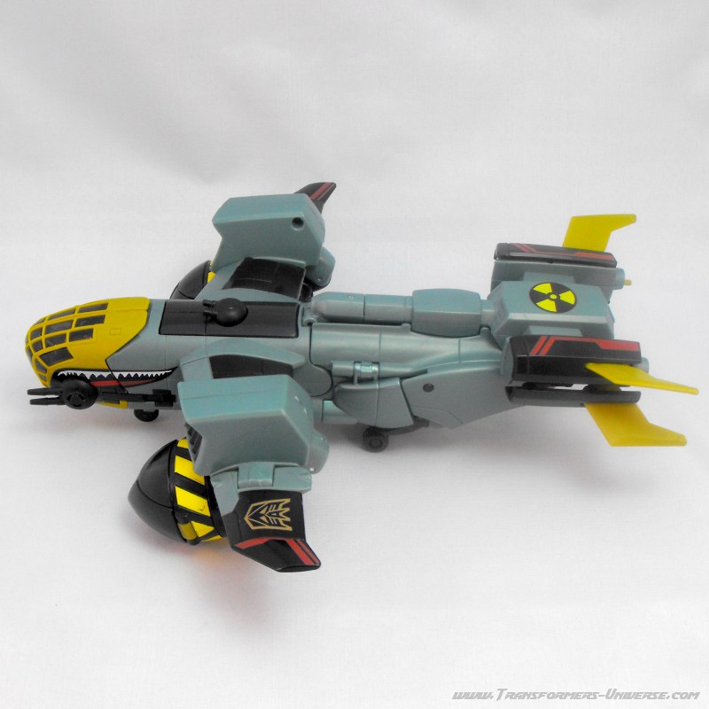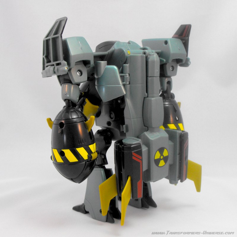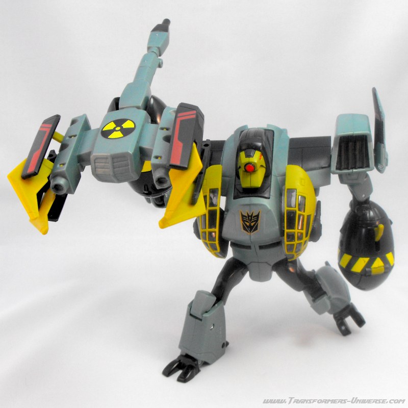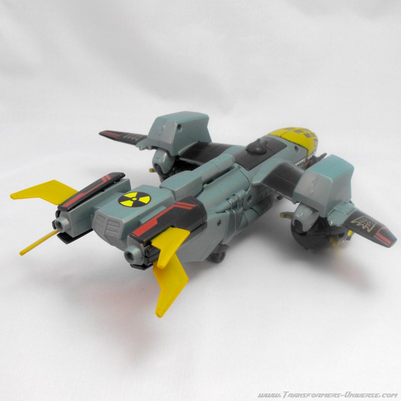 Bemerkungen: Atomic Lugnut ist ein Repaint vom ersten Animated Lugnut, die komplette Rezension findet ihr dort. Hier nur ein paar Worte zu den Unterschieden. Persönlich hätte ich diesen Lugnut hier gerne in der Animated TV Serie gesehen, hauptsächlich wegen der Ereignisse, die in seinem Profiltext beschrieben werden. Klingt schon sehr interessant. Was die Figur selbst angeht, so hat Lugnut hier seine klassischen Decepticon Farben (hpts. lila mit ein wenig grün mit drin) für einen etwas realistischer anmutenden Grundton in grau-blau eingetauscht, verbunden mit senfgelben, schwarzen und roten Highlights. Um seinem Namen gerecht zu werden gibt's dann noch ein großes Radioaktivitätssymbol hinten drauf, gelb-schwarze Warnstreifen an den Triebwerken / Händen, und ein Haifischgrinsen am Cockpit im Bombermodus.