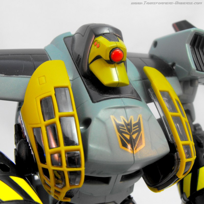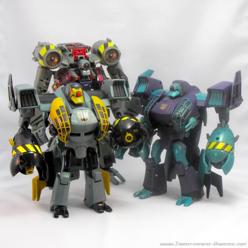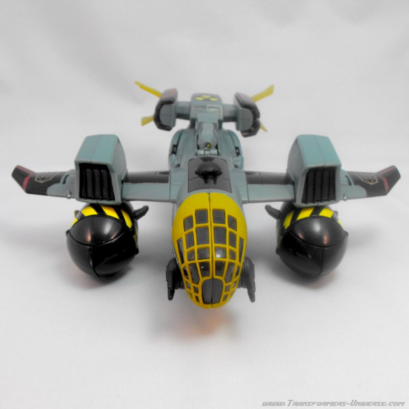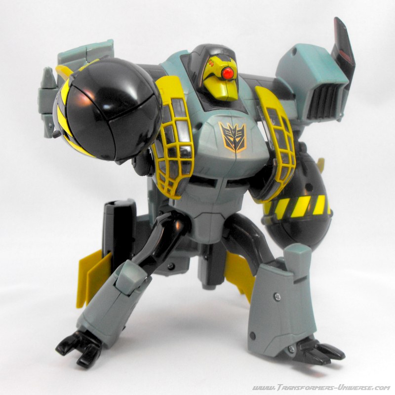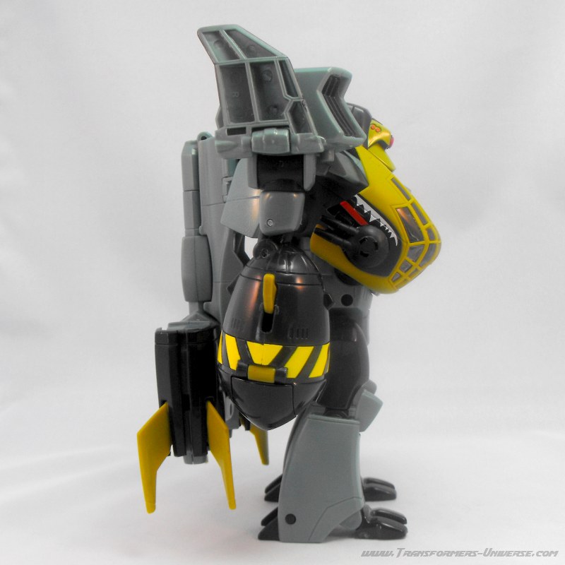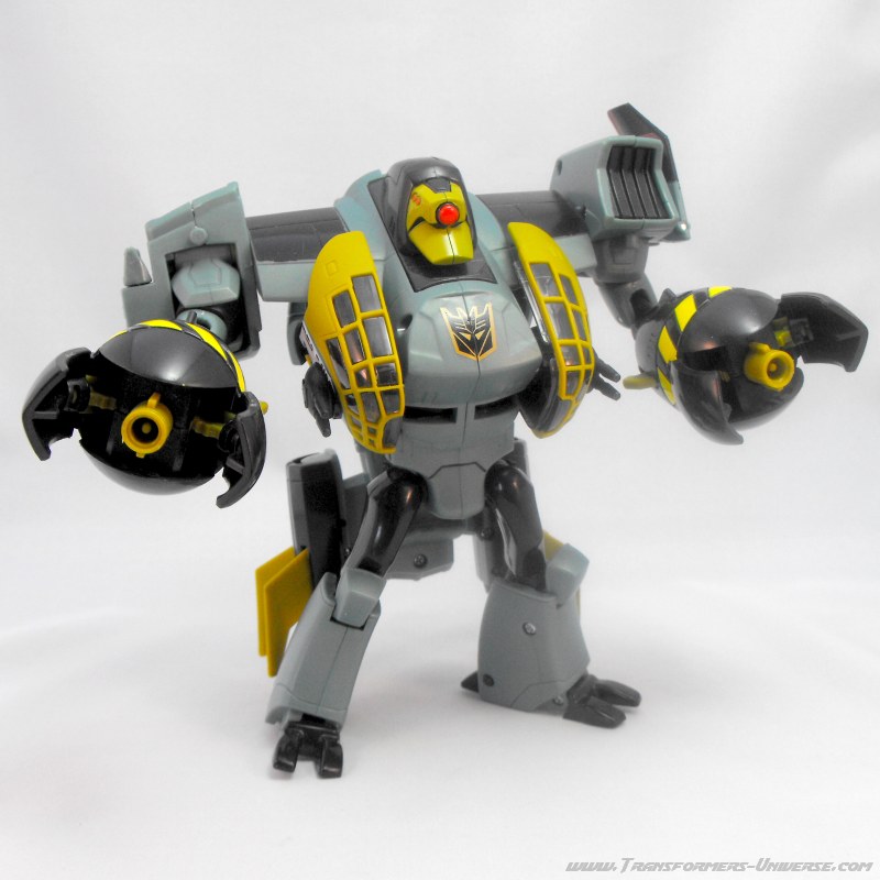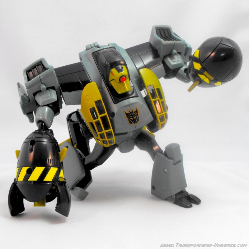 Bemerkungen: Atomic Lugnut ist ein Repaint vom ersten Animated Lugnut, die komplette Rezension findet ihr dort. Hier nur ein paar Worte zu den Unterschieden. Persönlich hätte ich diesen Lugnut hier gerne in der Animated TV Serie gesehen, hauptsächlich wegen der Ereignisse, die in seinem Profiltext beschrieben werden. Klingt schon sehr interessant. Was die Figur selbst angeht, so hat Lugnut hier seine klassischen Decepticon Farben (hpts. lila mit ein wenig grün mit drin) für einen etwas realistischer anmutenden Grundton in grau-blau eingetauscht, verbunden mit senfgelben, schwarzen und roten Highlights. Um seinem Namen gerecht zu werden gibt's dann noch ein großes Radioaktivitätssymbol hinten drauf, gelb-schwarze Warnstreifen an den Triebwerken / Händen, und ein Haifischgrinsen am Cockpit im Bombermodus.