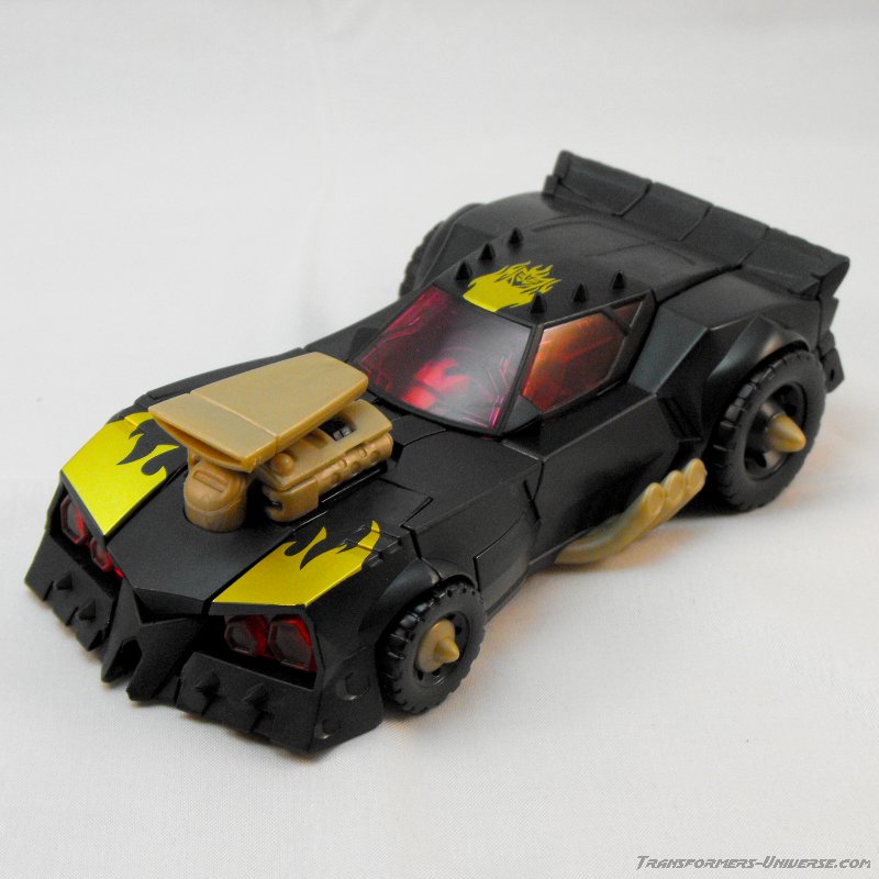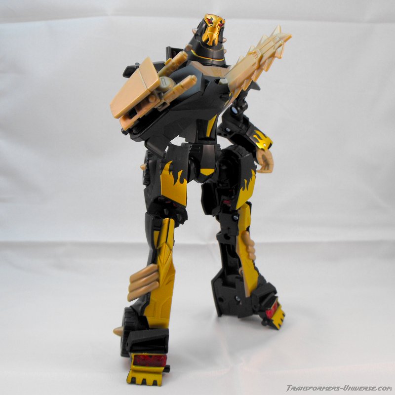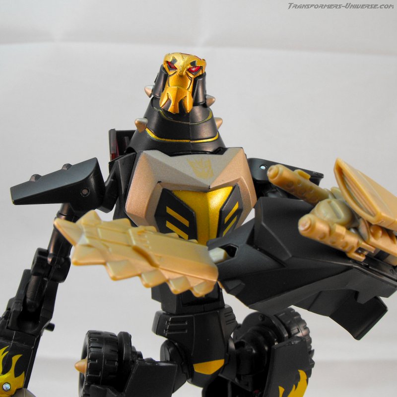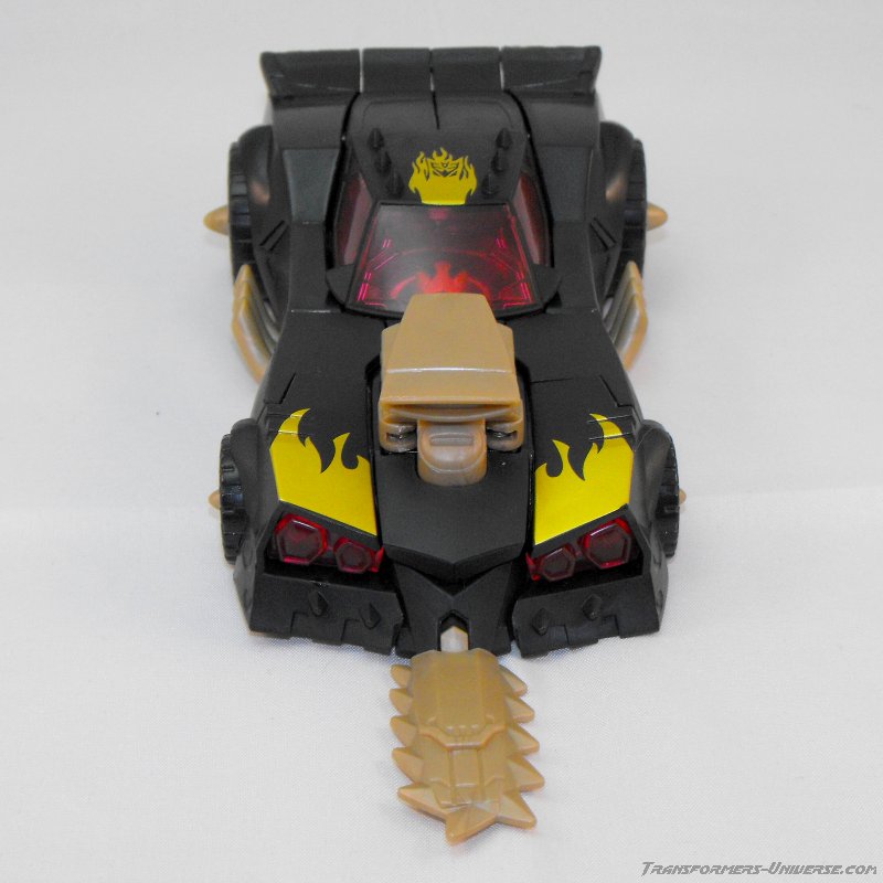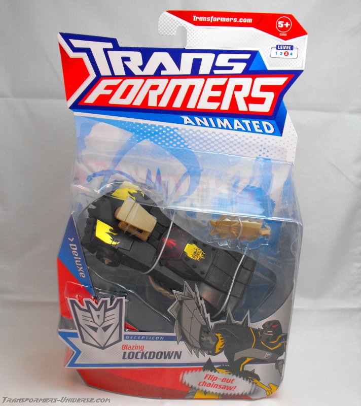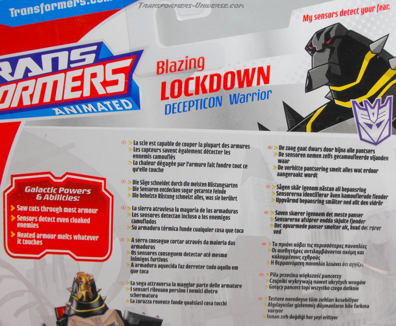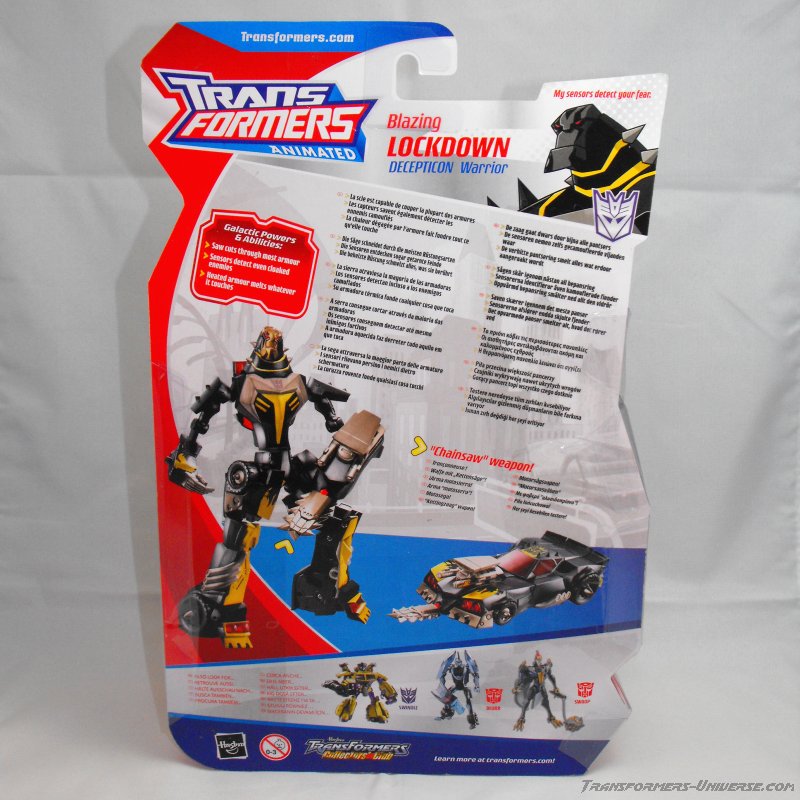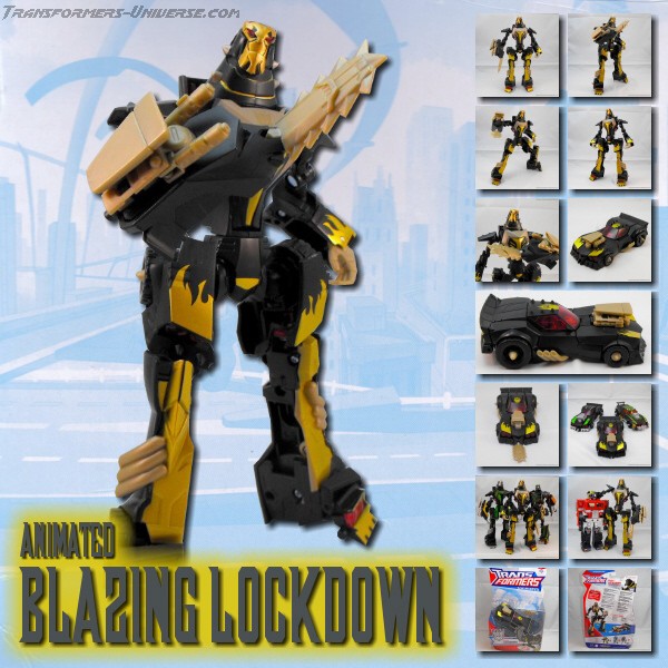 Bemerkungen: Blazing Lockdown ist ein Repaint des ersten Animated Lockdown, das komplette Review findet ihr dort. Hier nur ein paar Worte zu den Unterschieden. Zwei Dinge wurden bei der "Blazing" Version des Decepticon Kopfgeldjägers verändert. Zum einen hat er einen neuen Anstrich. Wo der erste Lockdown schwarz mit grünen und grauen Highlights war, ist dieser hier schwarz mit goldenen Highlights. Das Gold ist hier breiter vertreten als die nicht-schwarzen Farben beim ersten Lockdown und ist auf den Beinen, an den Unterarmen und am Rücken in Flammenmustern aufgebracht, was im Fahrzeugmodus zu der Motorhaube und dem Dach wird.